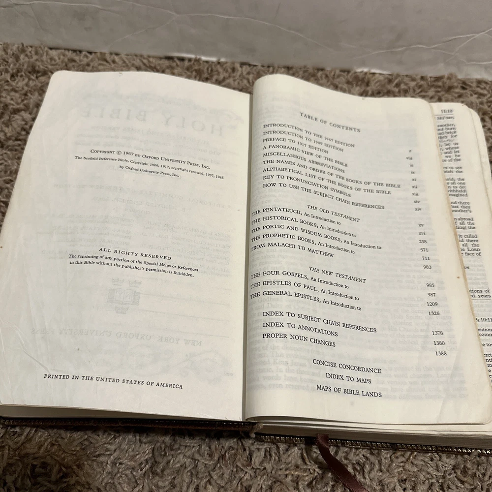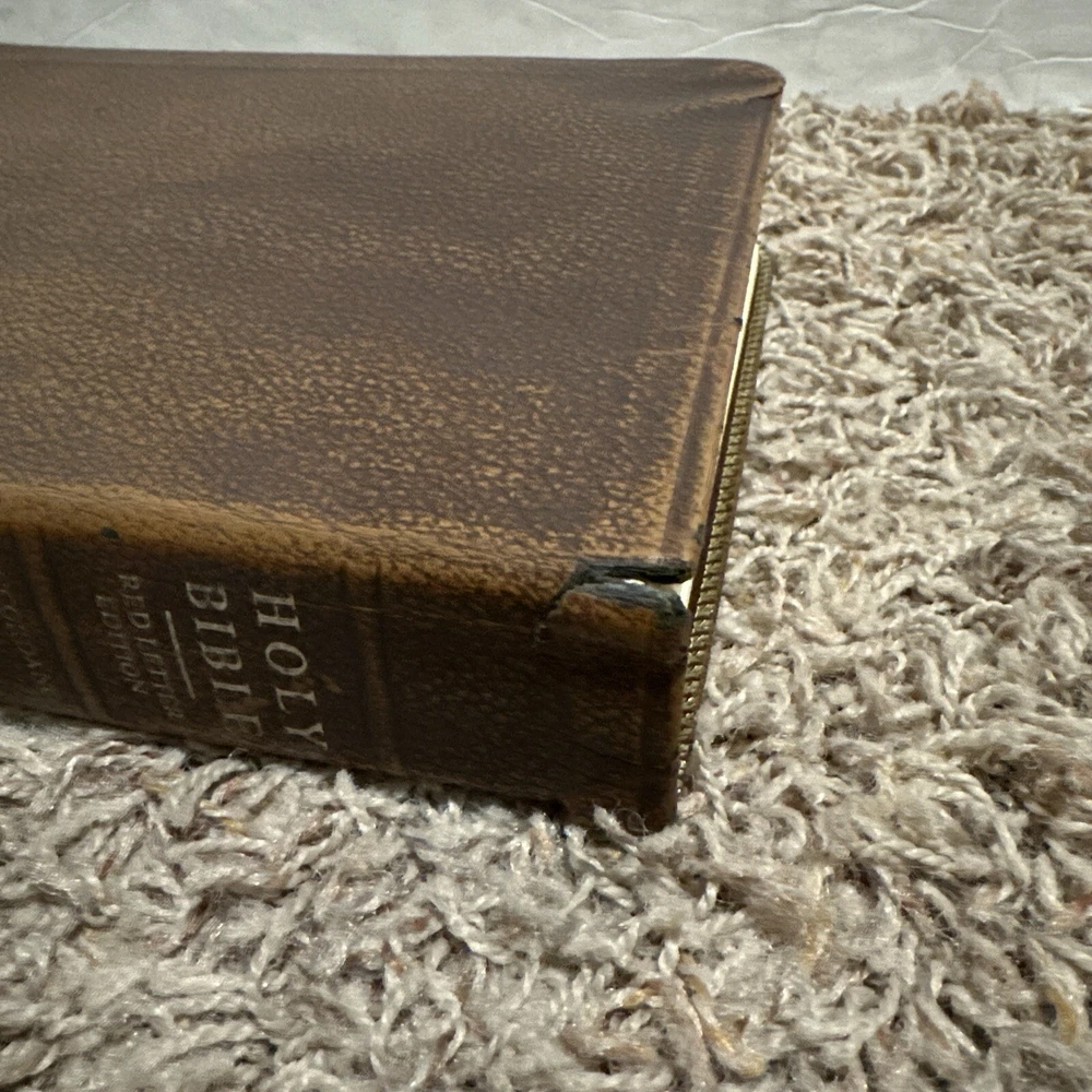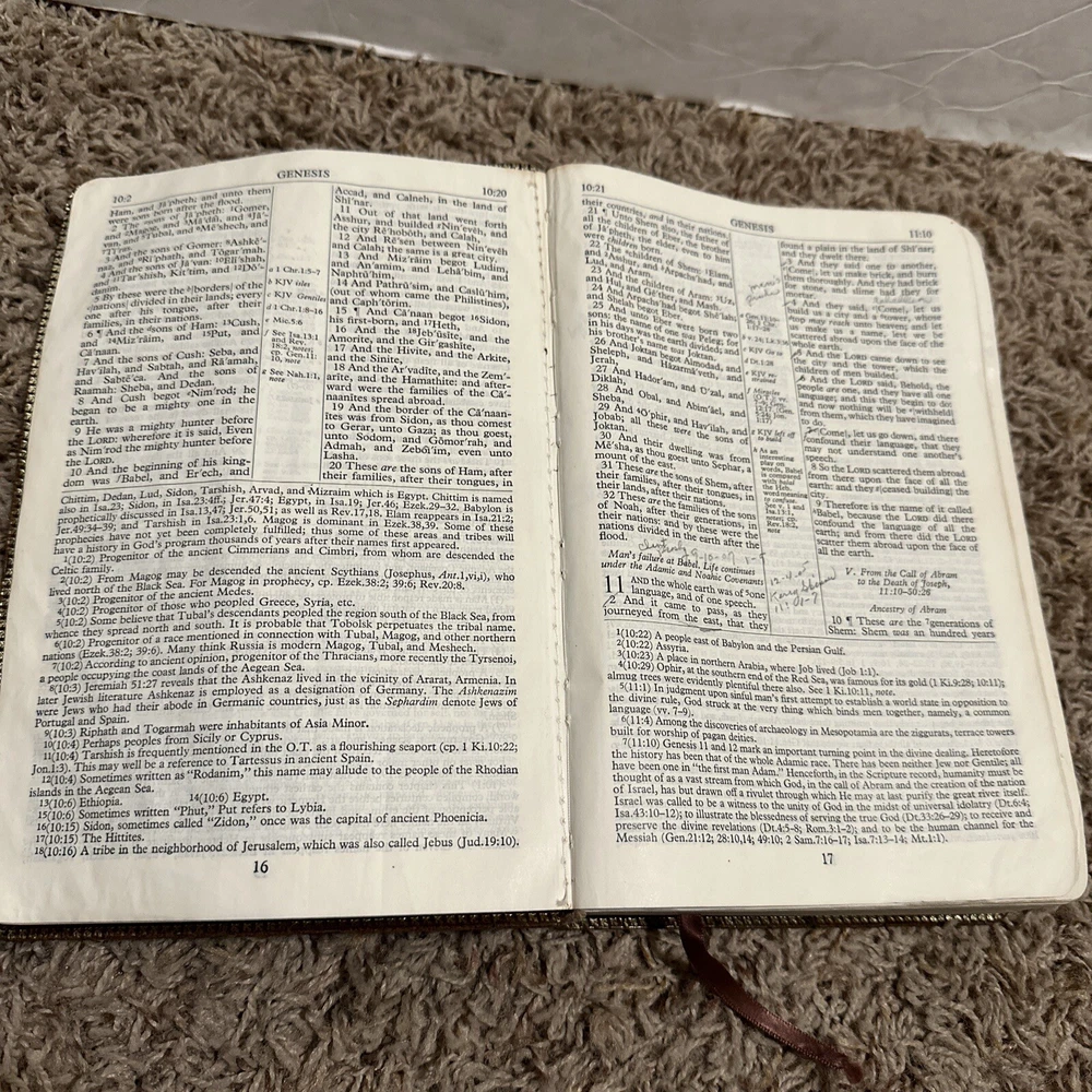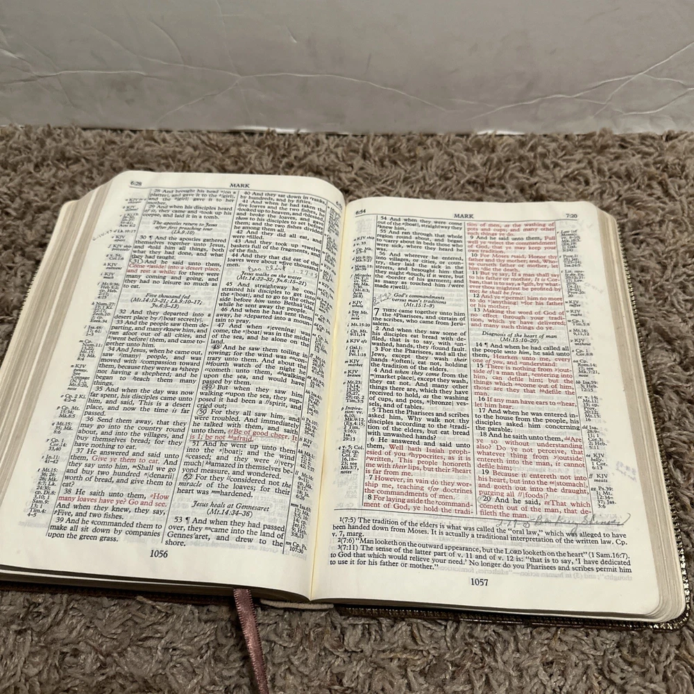 Bible has a good amount of wear on outside of cover. Liquid was spilled near book so some of the pages have some wrinkling. A good amount of writing on pages as well. Please let me know if you have any questions!