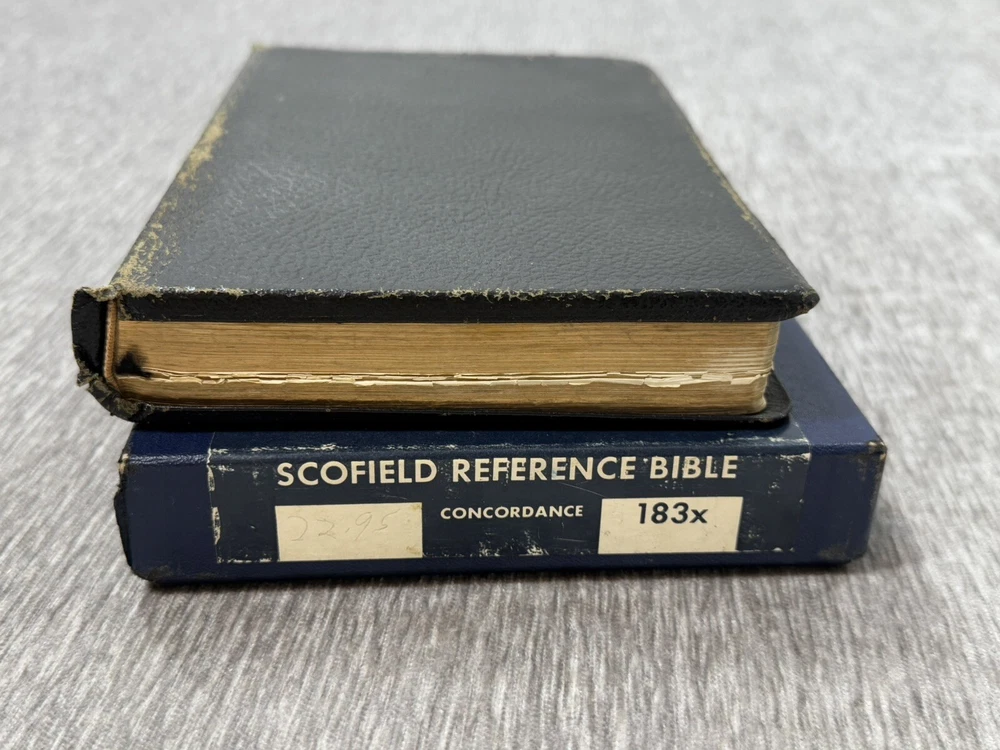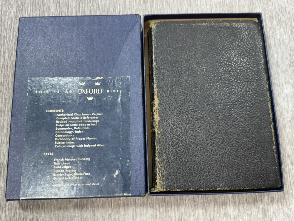 For sale is a vintage Oxford Holy Bible Concordance Scofield Reference Edition Leather 1945 with original Box. Model: 183x Well used Bible, shows fairly heavy wear, cover wear, worn areas, etc. There are notes/highlighting in pages. Binding is intact and pages are attached. Please see al photos.