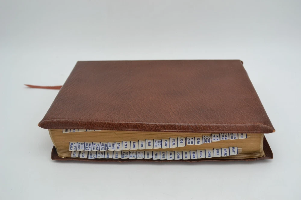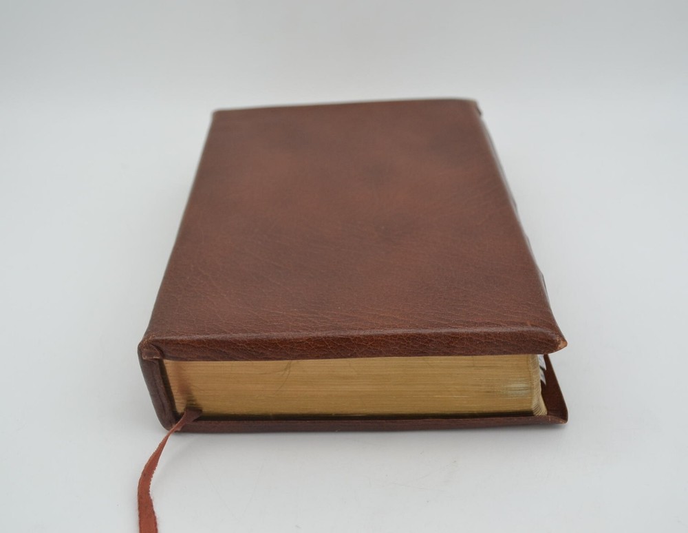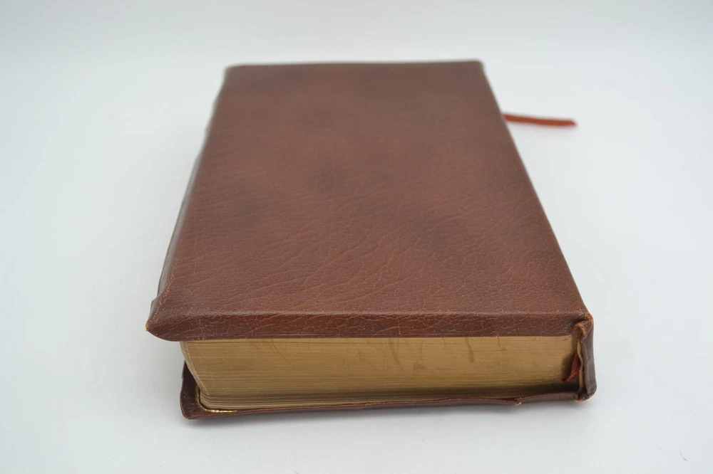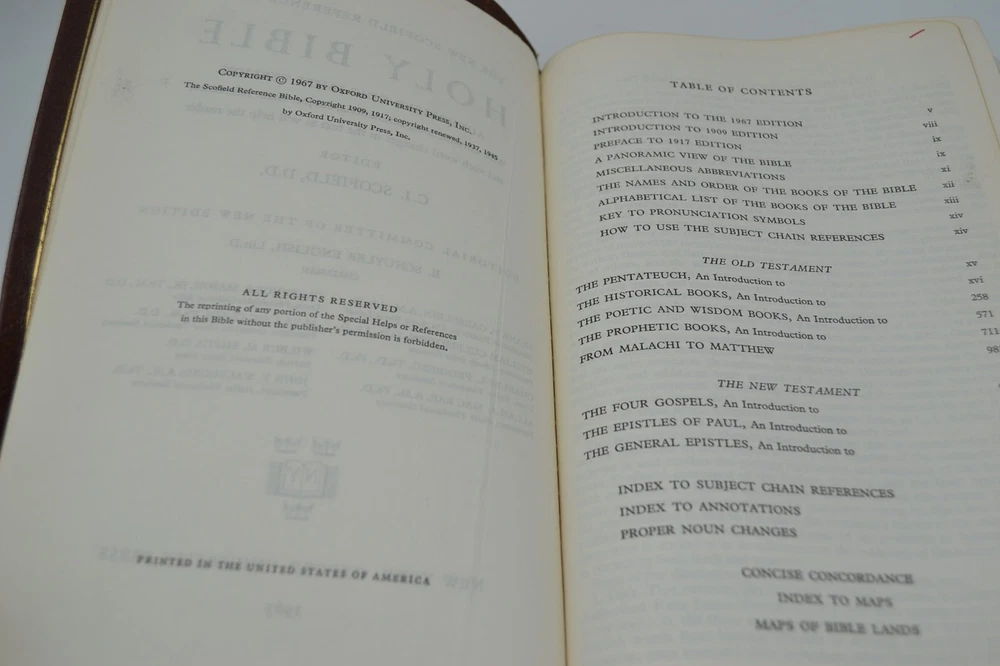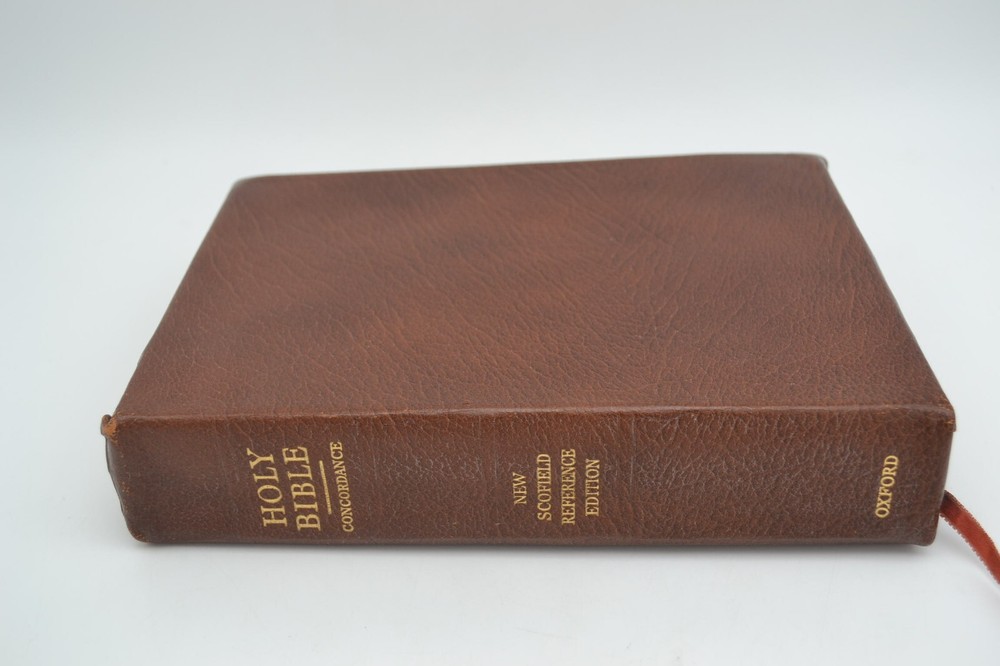 Oxford Holy Bible New Scofield Reference Edition Concordance, 1967 Cowhide Brown, Gilt Fore-edge Wear to the covers and spine, some marks on the fore-edge, pages tanned from age, name written on inside cover page. Good binding, writing/notes on the inside pages. Ships with care, same or next day.