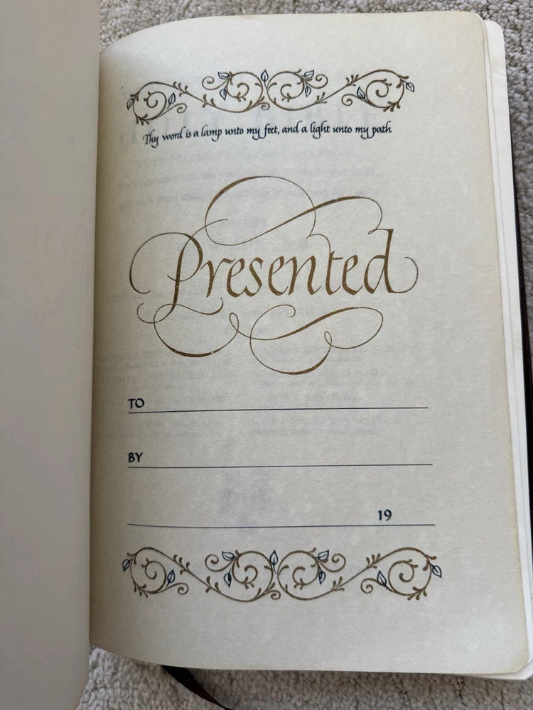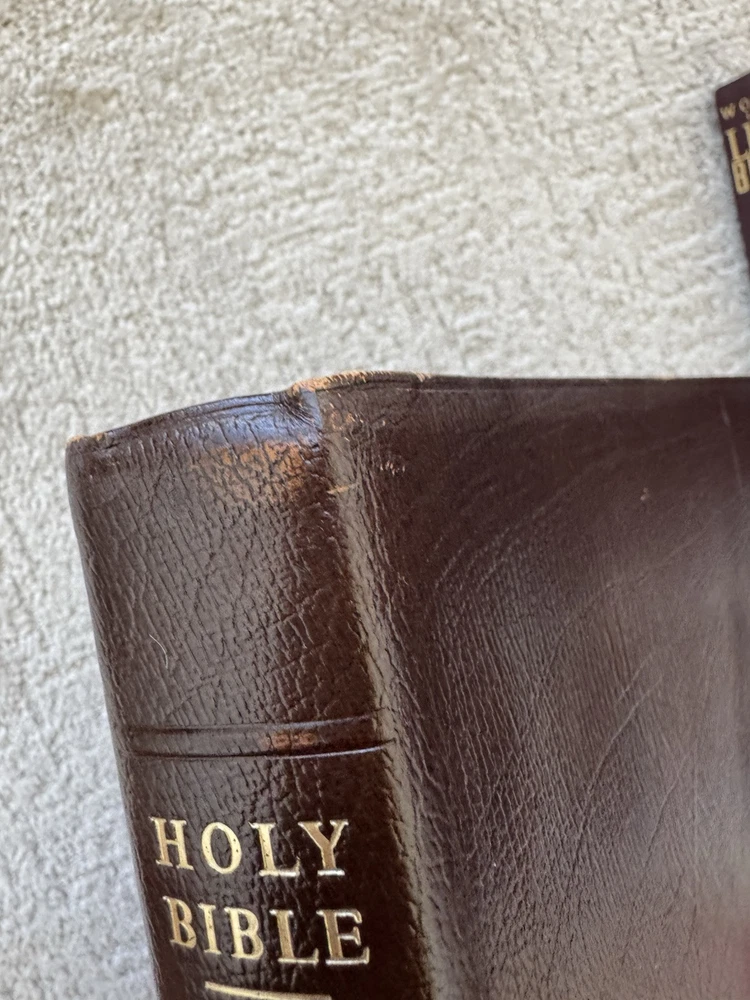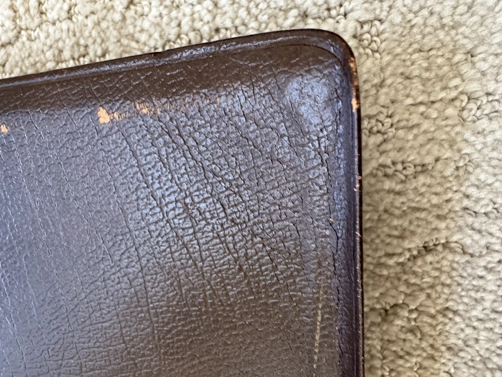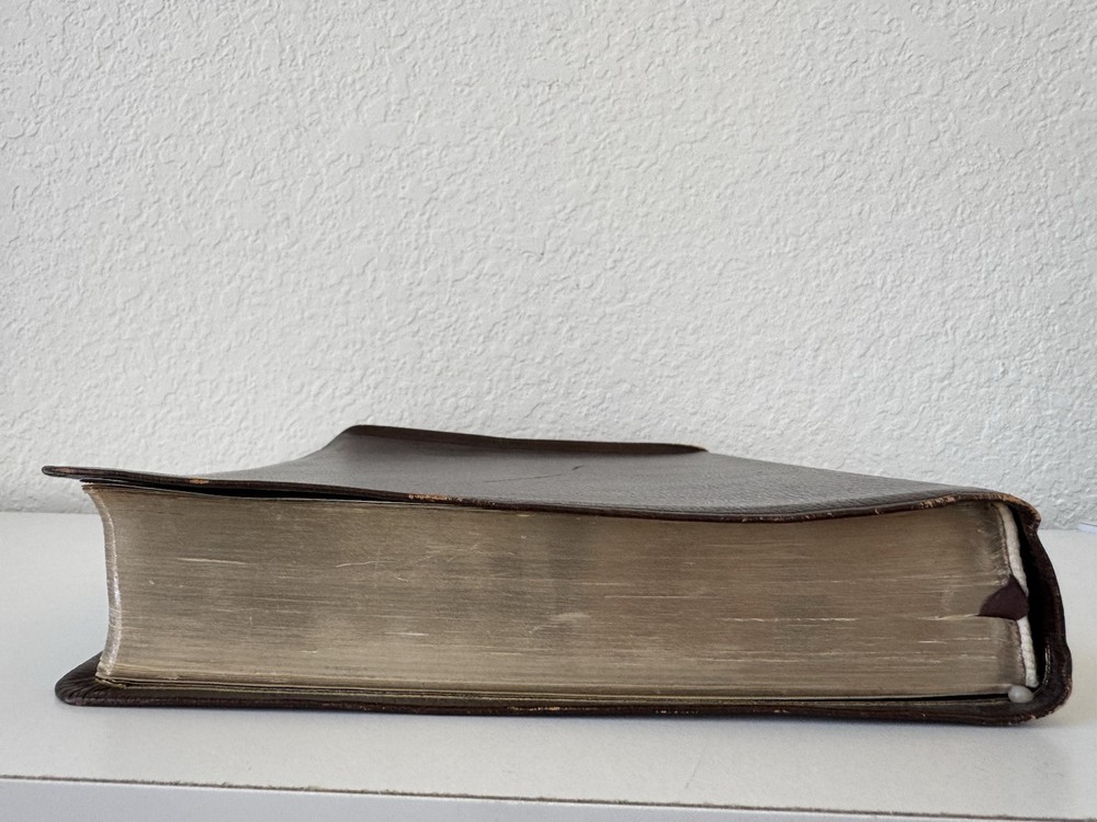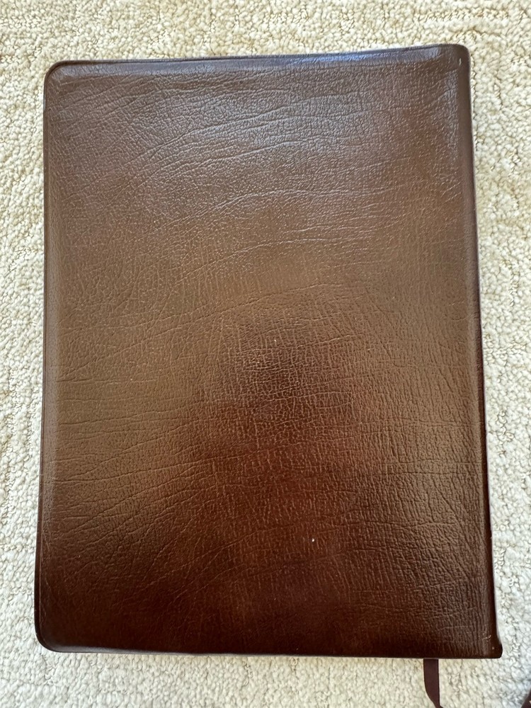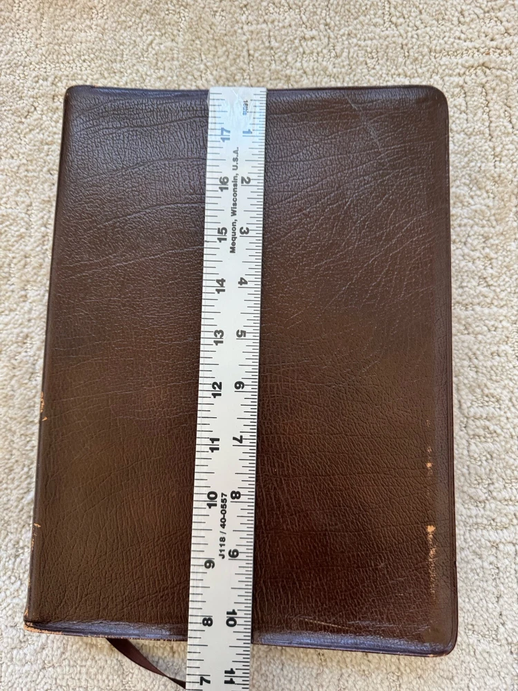Please see photos as the leather has warping and also a lot of scuffing. Measurements in photos as well No odors and no markings inside This is a rare wide margin Bible made of cowhide leather Ships next business bubble wrapped in a box Please see all photos for best and most accurate condition of the product Shlf