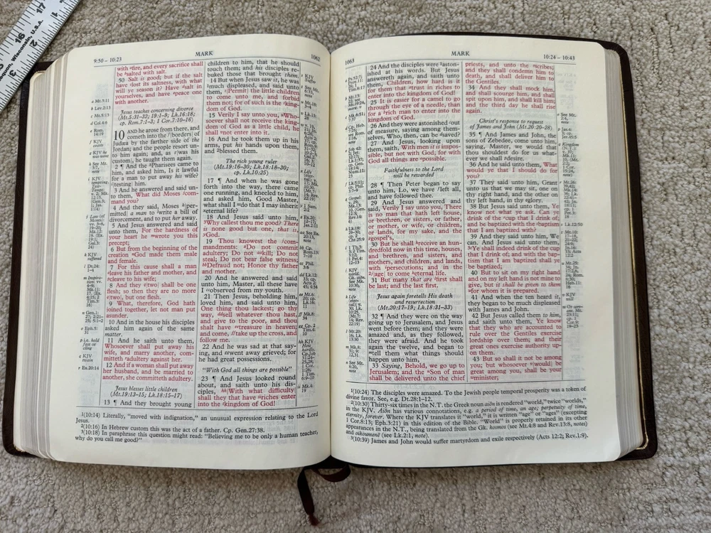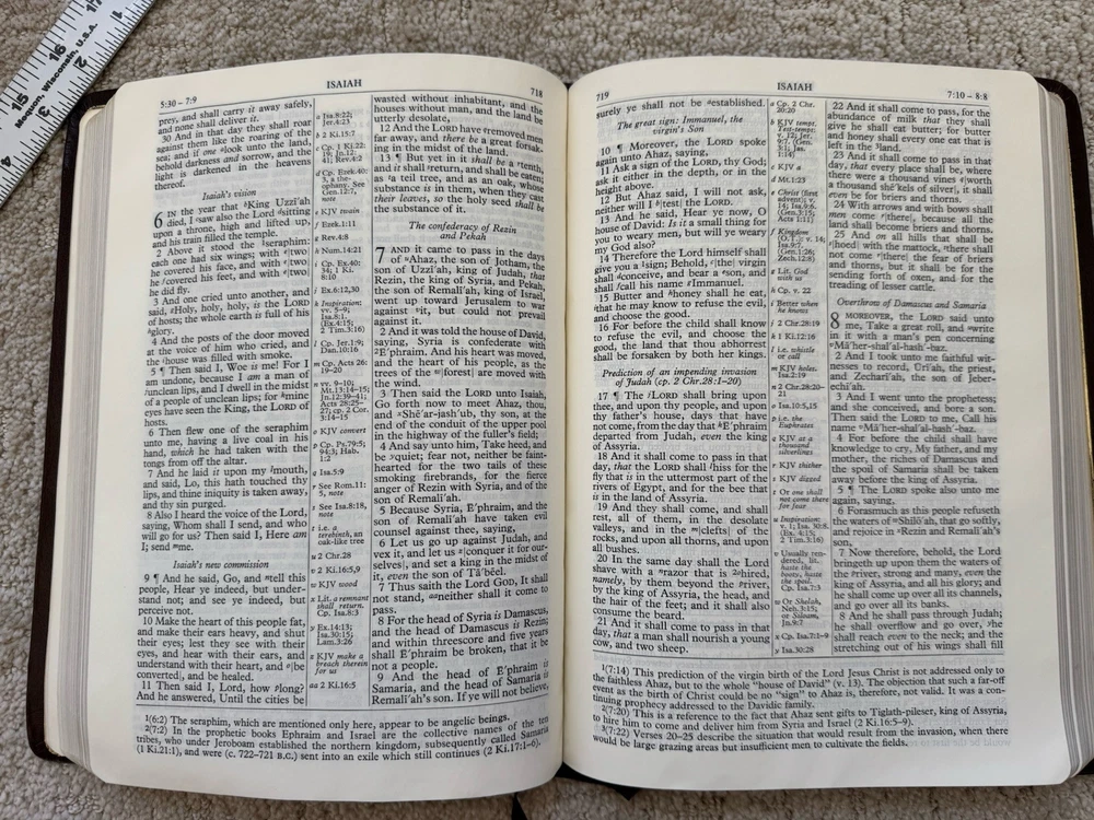 Absolutely love this wide-margin Scofield Bible! The cowhide leather feels premium despite some scuffs, and the extra space for notes is perfect for serious study. The text is crisp and easy to read, with no odors or markings inside. Shipping was fast and secure—definitely a rare find for collectors or anyone who values a durable, high-quality Bible. The warping shown in photos doesn’t affect usability at all. Highly recommend!