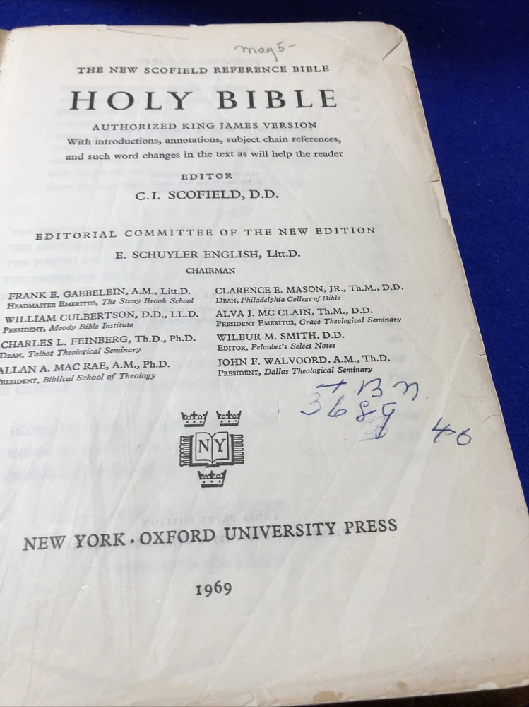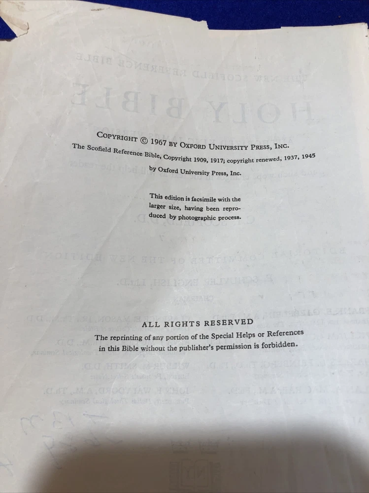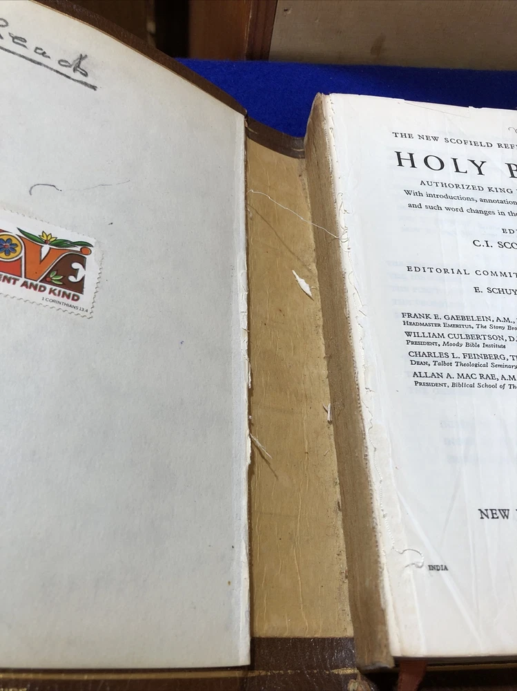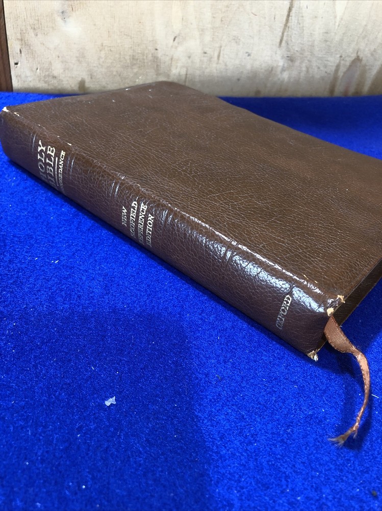 This item is a pre-owned Holy Bible in the King James Version. This Bible is a New Scofield Reference Edition, published by Oxford. This item is bound in brown Genuine Cowhide. The binding has come unglued, probably because the previous owner removed the Presentation page and maybe others. The exterior is in good condition, with a little wear at the corners (see photos). The thumb index has about half of the tab names removed, and the gold gilt on the edges has seen some wear (from reading). There are notes in the margins and underlining throughout the Bible. There are also notes in the first and last pages of the Bible. This Bible has seen LOTS of use and has been well loved. This Bible has a lot left to give to the right owner, but it will need to be repaired. That is why this wonderful Bible is being priced at such a discount.