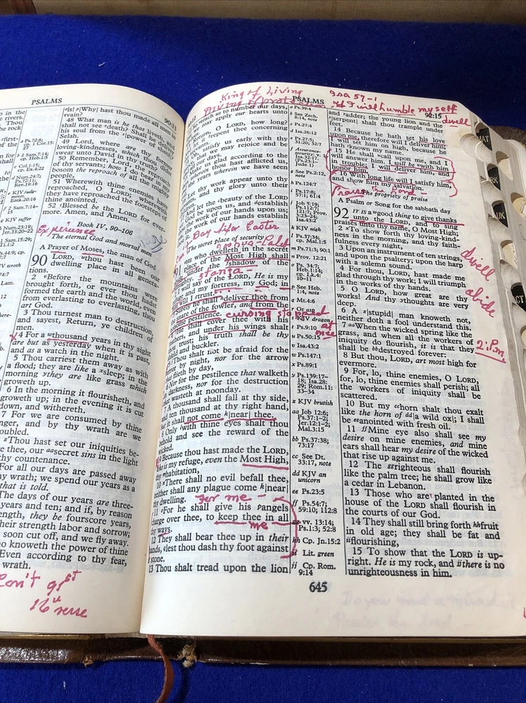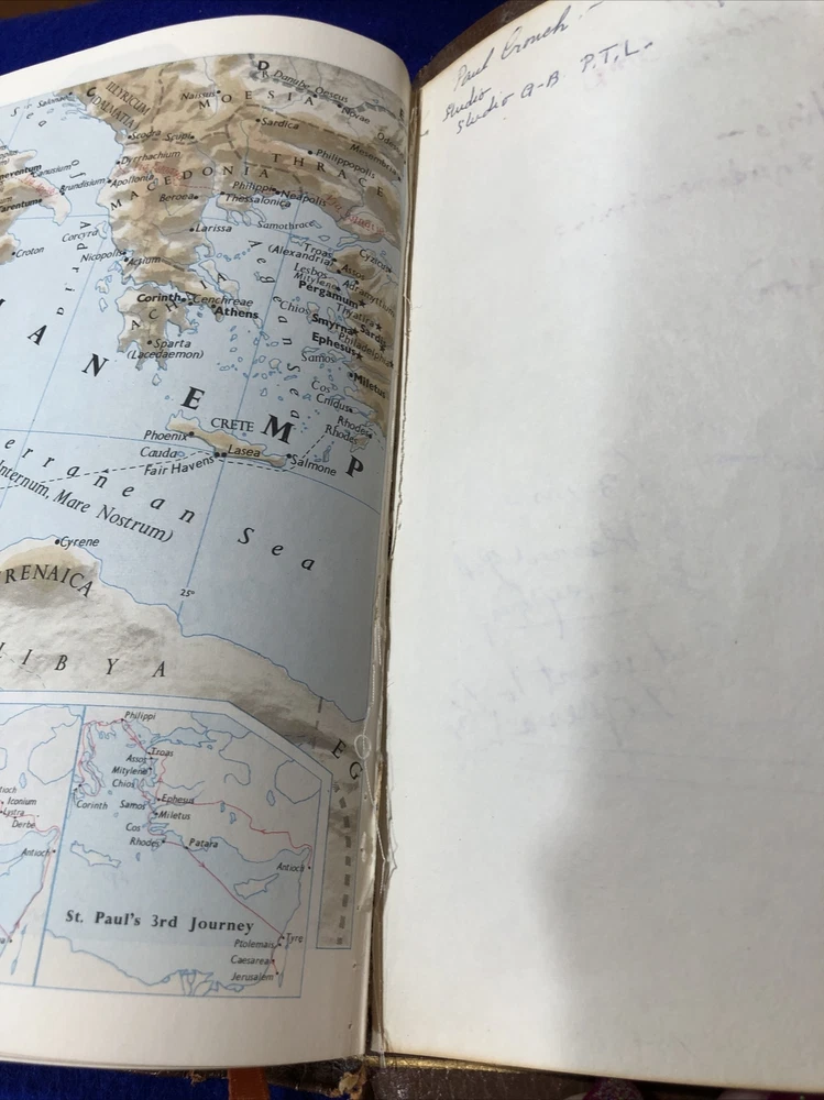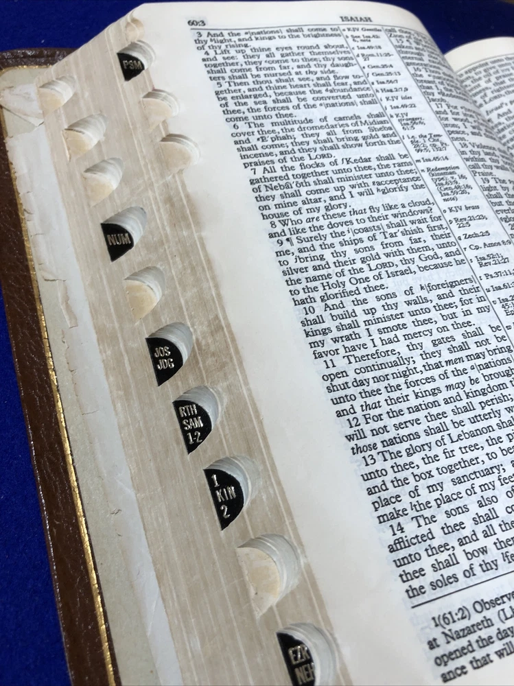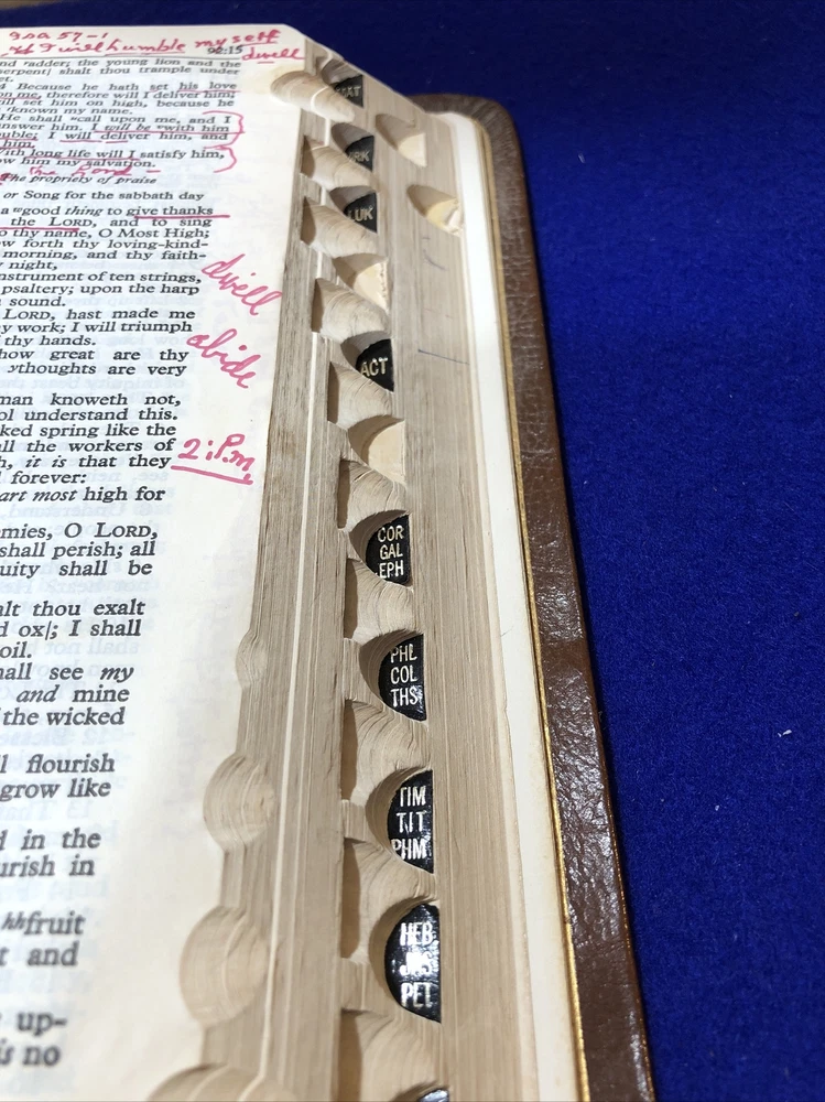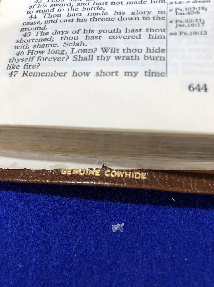 This item is a pre-owned Holy Bible in the King James Version. This Bible is a New Scofield Reference Edition, published by Oxford. This item is bound in brown Genuine Cowhide. The binding has come unglued, probably because the previous owner removed the Presentation page and maybe others. The exterior is in good condition, with a little wear at the corners (see photos). The thumb index has about half of the tab names removed, and the gold gilt on the edges has seen some wear (from reading). There are notes in the margins and underlining throughout the Bible. There are also notes in the first and last pages of the Bible. This Bible has seen LOTS of use and has been well loved. This Bible has a lot left to give to the right owner, but it will need to be repaired. That is why this wonderful Bible is being priced at such a discount.