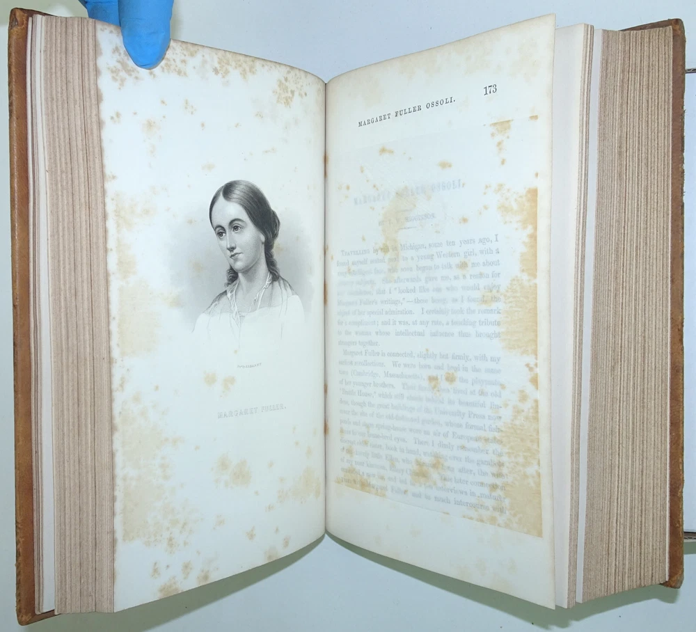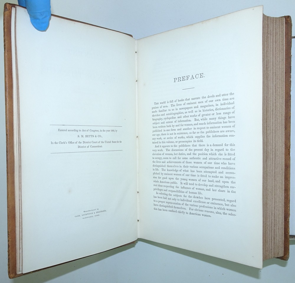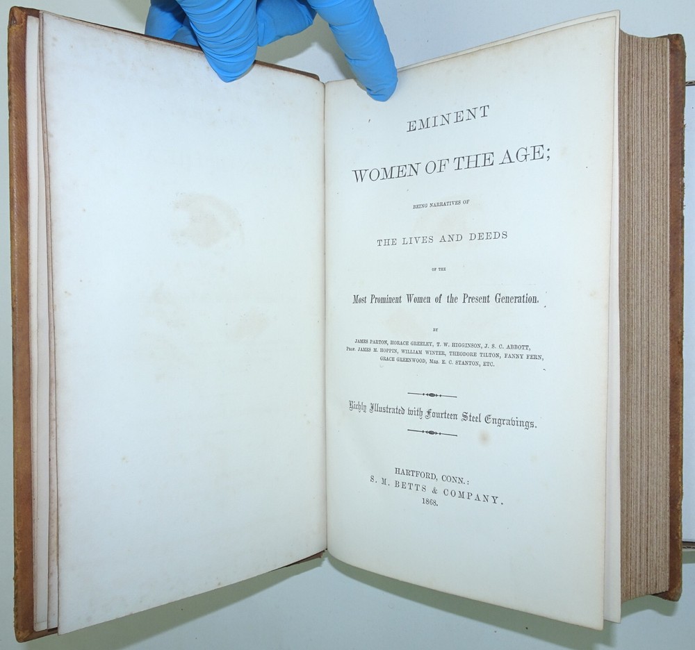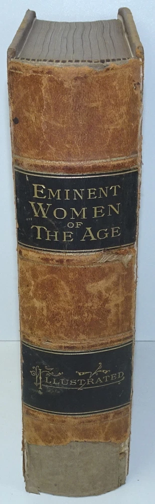 DETAILS: Title: Eminent Women Of The Age; Being Narratives Of The Lives And Deeds Of The Most Prominent Women Of The Present Generation . Author: James Parton, Horace Greeley etc . Date Published: 1868. Place Published: Hartford, Connecticut . Published By: S. M. Betts & Company. Size: Approx 9" x 6 1/4" x 2 1/4". CONDITION: Overall: Fair to good. Bound in the publisher's original full leather binding. Pages: Good with some foxing to illustrations , (please see pictures) . Binding: Very good, still sound. Hinges: Hinge leather split. Boards held in place by binding cords . Hardcovers: Good to very good with some wear, (please see pictures). Spine: Fair with significant wear with loss, (please see pictures) .