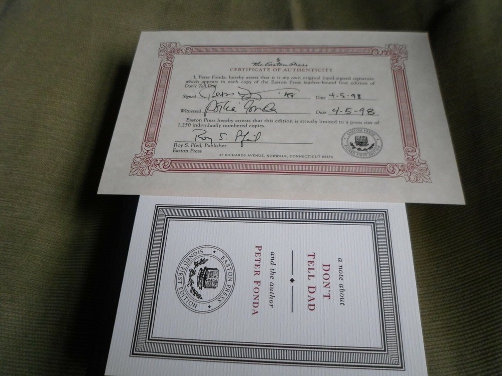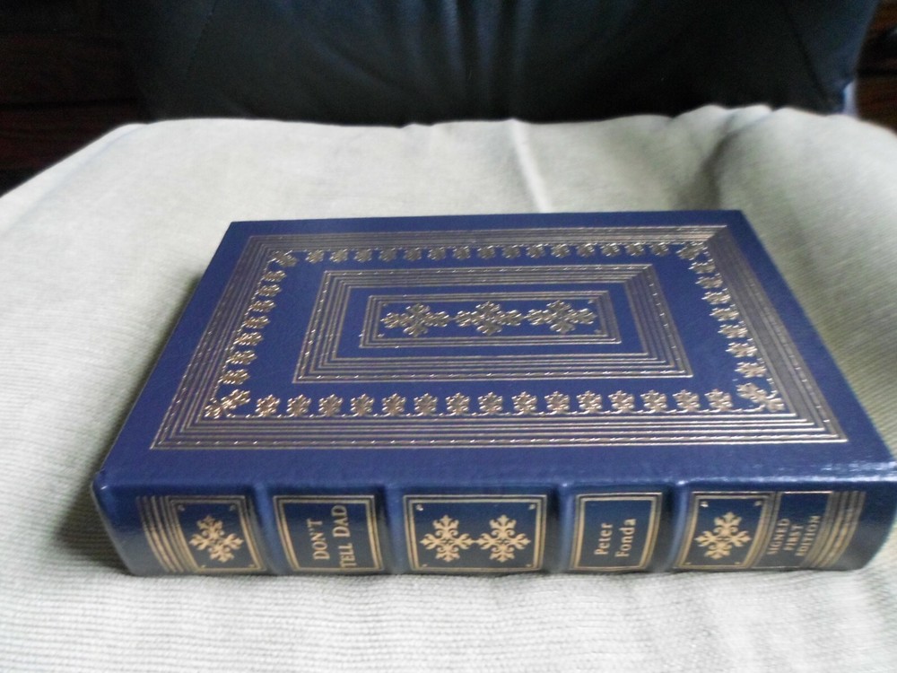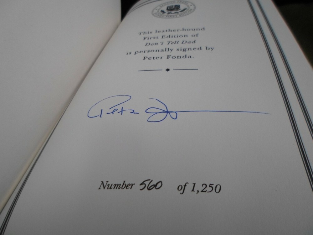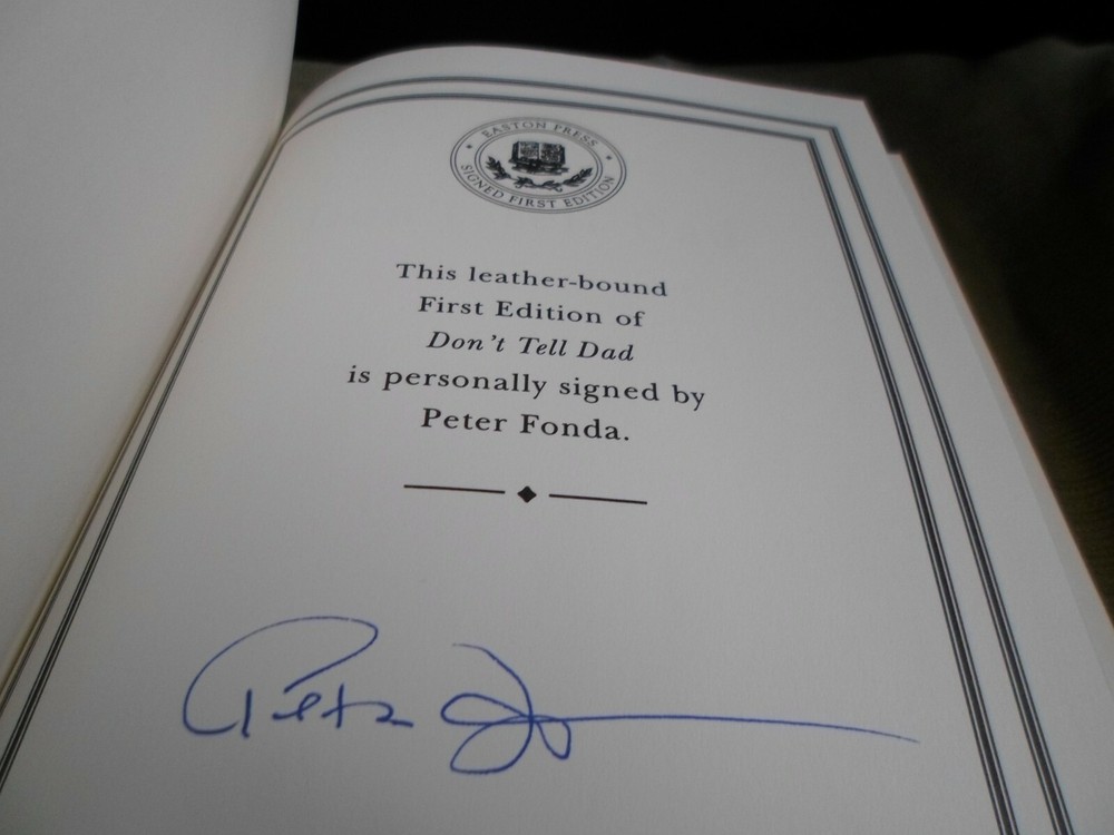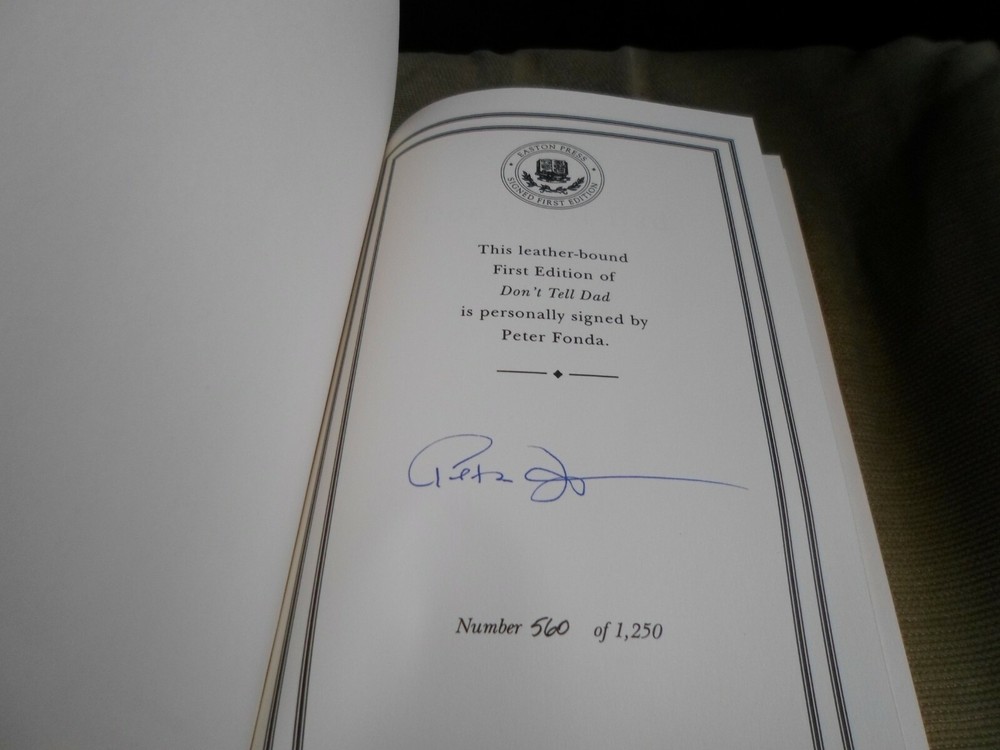 This is a leather bound signed numbered first edition of Peter Fonda's best-selling memoir - "Don't Tell Dad", the fascinating story of the Hollywood icon, describing a remarkable career spanning more than half a century. O ne of America's favorite actors tells of his childhood in one of the most celebrated families in the movie industry, and behind-the-scenes accounts of his great epic films. Full of interesting details not only about the author, but also about his famous father, Henry Fonda , and sister, Jane Fonda . The book is unread and in great condition. Signed by the famous Hollywood star on the limitation page, this is number 560 of 1250 copies ever printed. Easton Press books are the golden standard in the publishing industry, highly collectible and lasting generations. Easton Press Full Genuine Leather Dubbed Spine Accented Wit 22 kt. Real Gold Satin Ribbon Page Marker Distinctive Cover Design Gilded Page Edges To Protect Against Humidity High Quality Acid - Free paper Smyth-Sewn Pages Silk-Moire Endleaves I combine multiple items for savings on shipping charges. I ship worldwide. Please ask about international shipping charges and/or different shipping options. Please check out my other auctions for several rare signed books for sale. Thank you!