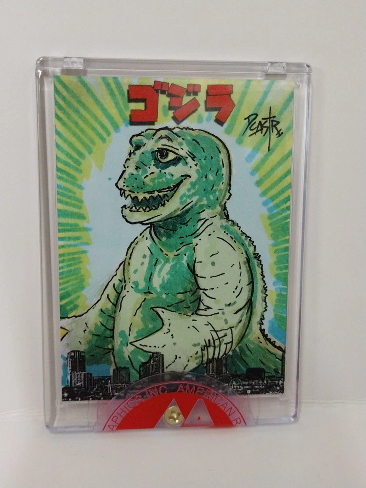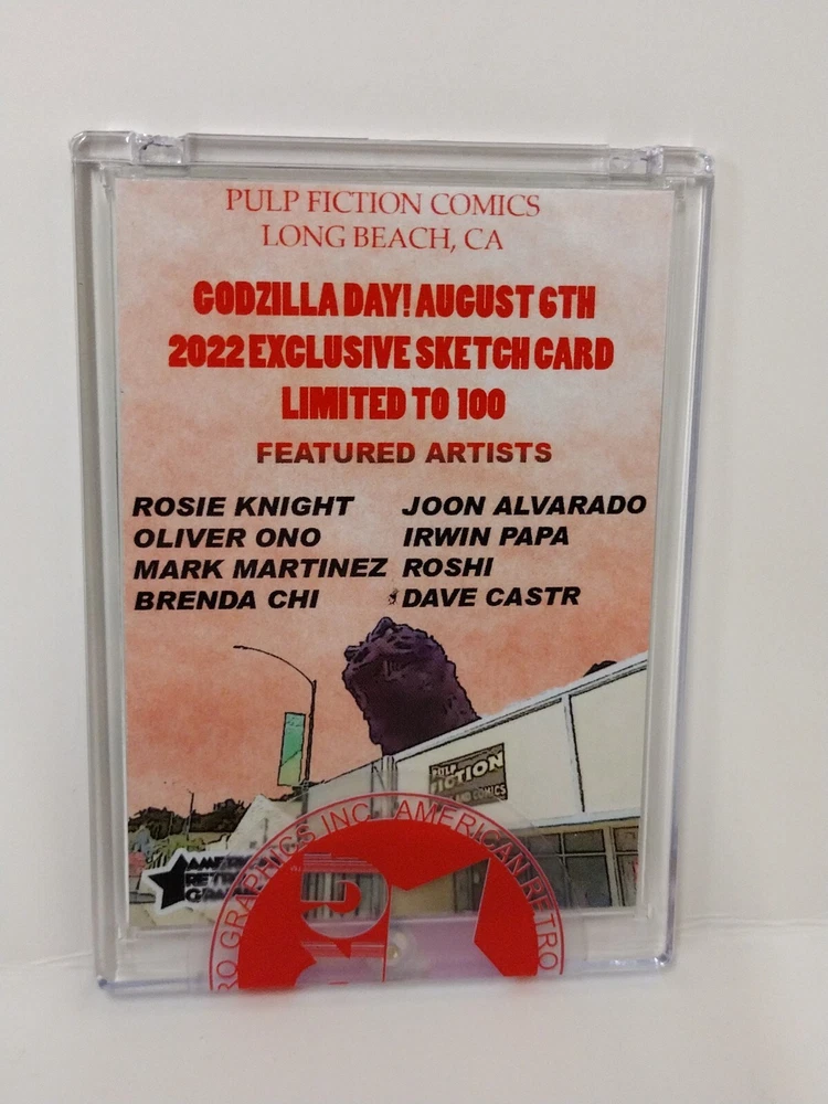 Godzilla Day 1/1 Sketch Card with Original Art Printed by American Retro Graphics (2022) Sale is for: " Minya Minilla " Original Art on Godzilla Day Sketch Card printed by American Retro Graphics. Card print run limited to 100. Created as a store exclusive for Pulp Fiction Comics Long Beach's One Day event August 6th 2022 Sketch card is standard size. 18pt thickness with a UV coated back and smooth uncoated matted bristol board front textured. Sketch card is signed by artist Dave Castr, incased in hard plastic one screw card holder, sealed with Company label. Card comes from a smoke free warehouse and will ship securely, bagged and carded together in a hard cardboard envelope carton.
