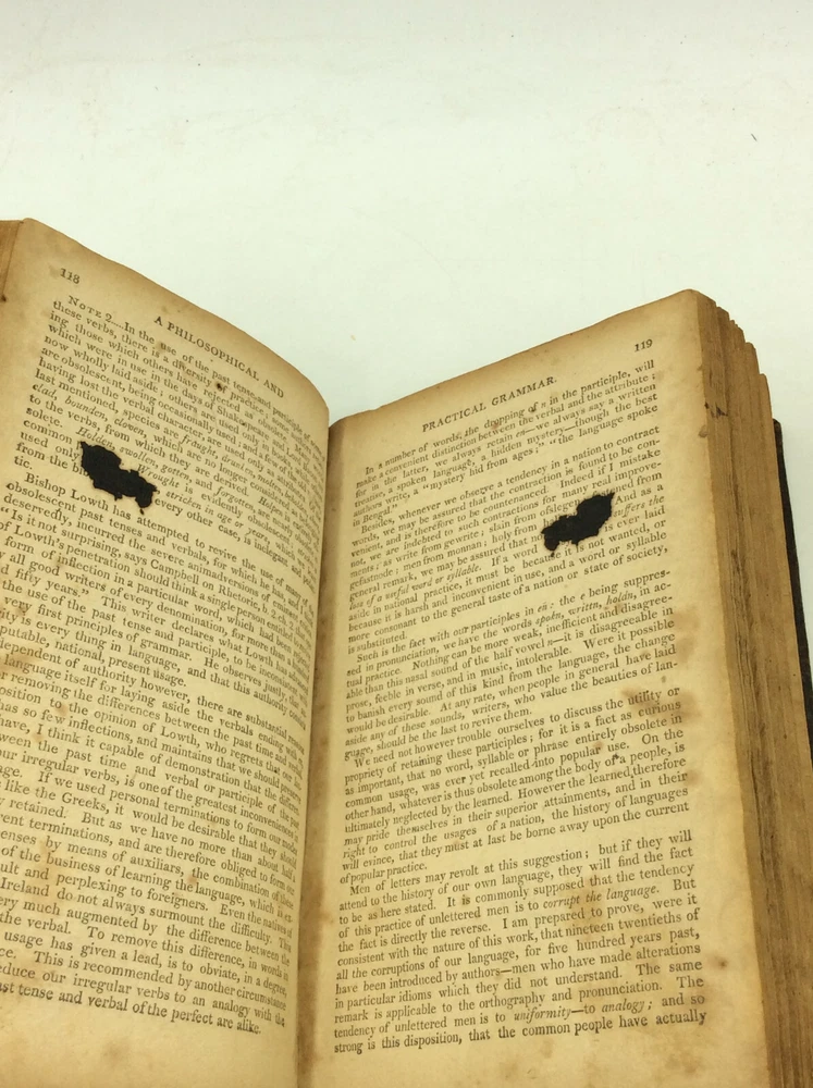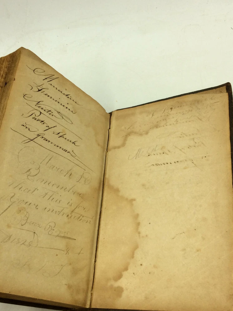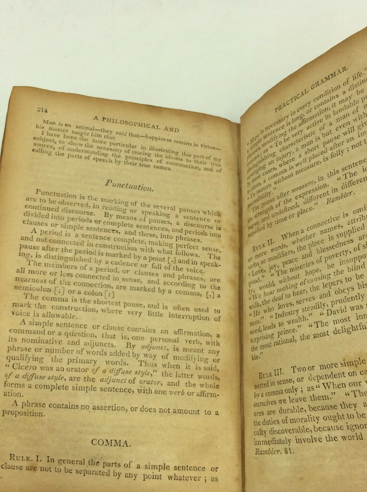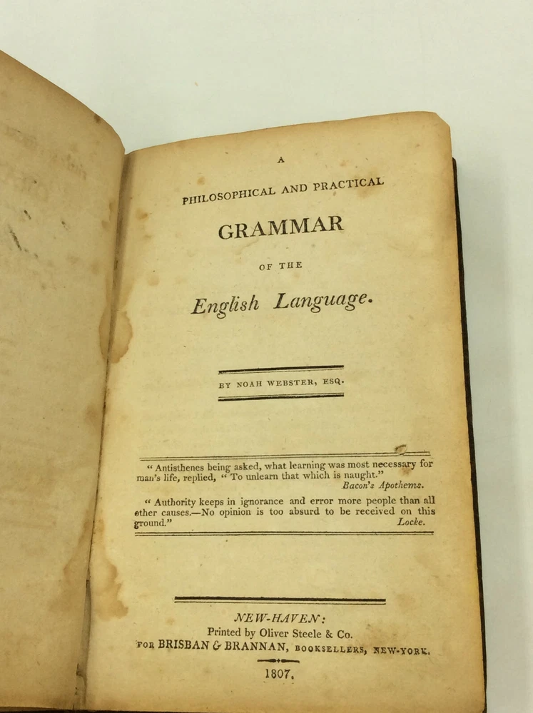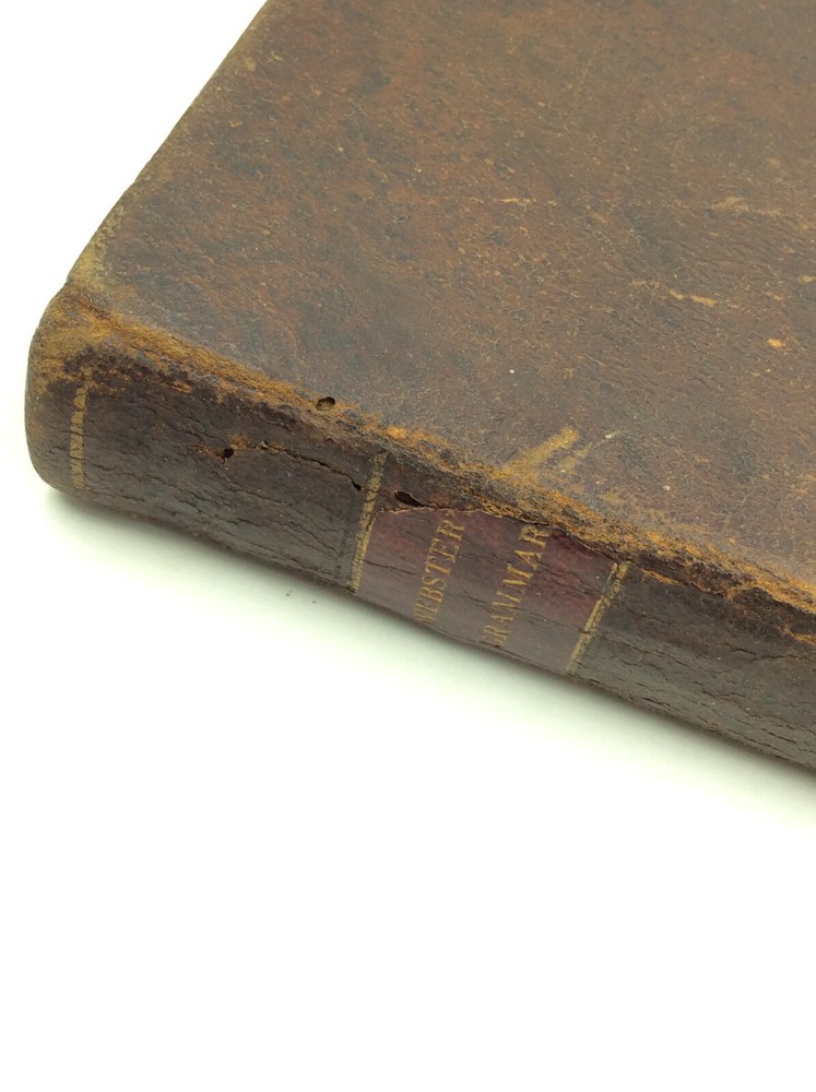 Noah Webster, Esq. A PHILOSOPHICAL AND PRACTICAL GRAMMAR OF THE ENGLISH LANGUAGE New-Haven: Oliver Steele & Co., 1807. First Edition. Leather bound. 250p. A leatherbound book in good condition. The leather has a crackled appearance near the spine and on the rear cover, and the edges are rubbed. There are a few tiny scuffs on the covers. Former owner inscription and notes in ink on the front and rear endpapers. Pages are tanned and foxed. Inkstain on facing pages 118-119 obscures a few words across 3 lines of text. Otherwise, the text is clean and the binding is secure for normal handling. Item #132454 The first edition of this scarce early work by Webster. The text would later serve as part of his famous Dictionary. Despite the wear noted. this copy is in better condition than normally found.