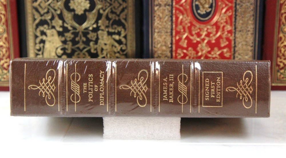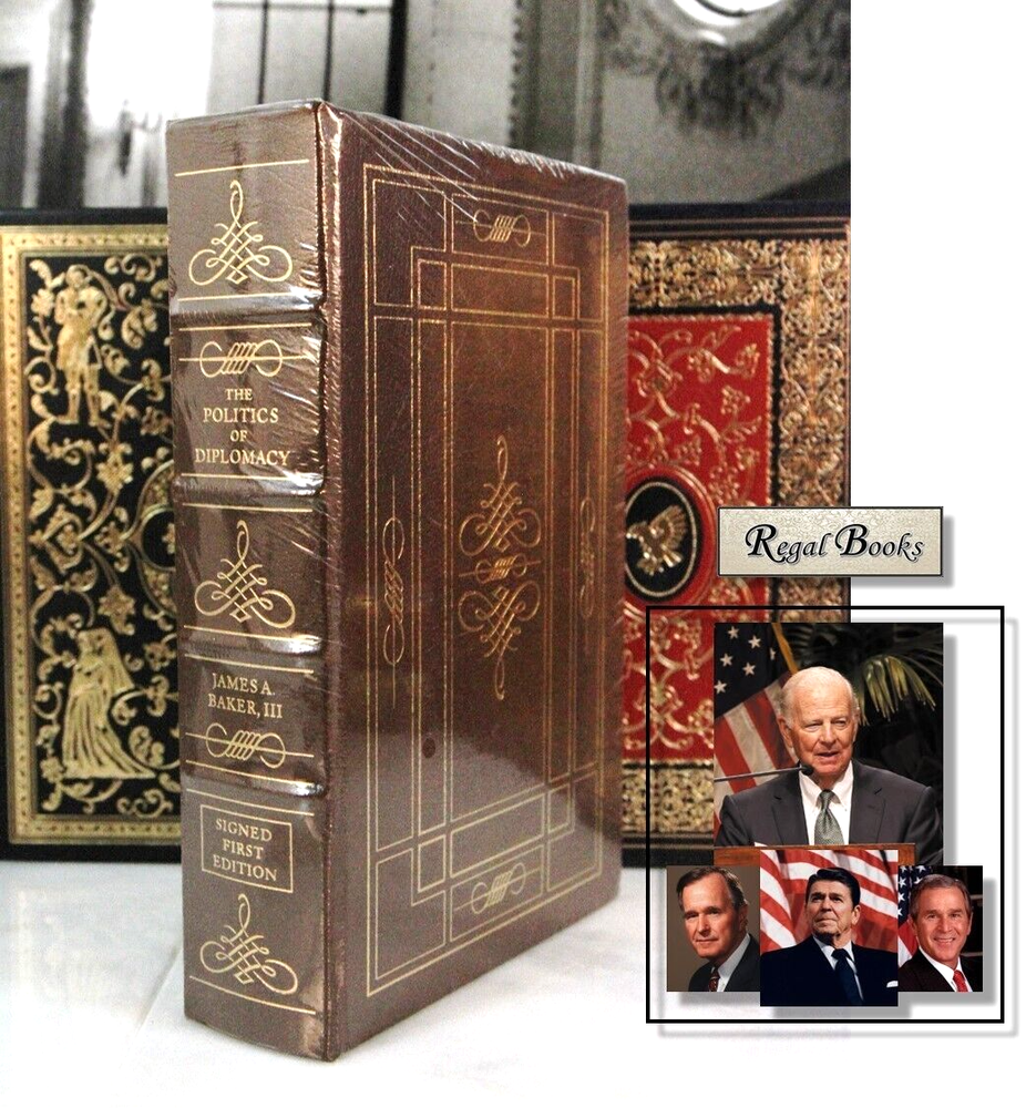 ***Copy of photos, personal formats, graphics, or text is prohibited . Ebay may drop listings with infractions. I review content regularly. Signed First Editions The Politics of Diplomacy Author: James A Baker III Illustrations by Description: A True First Edition and SIGNED! James A. Baker III, a remarkable politician and statesman who represents a time when a divided Congress got things done, and when presidents and congress worked together. He was Ronald Reagan's Chief of Staff, and later Secretary of State for President Bush. Baker masterminded the Reagan Revolution and got much of Reagan’s hugely ambitious agenda through a hostile Congress. To this day he is considered the very prototype of an effective and strong presidential chief-of-staff. As Secretary of the Treasury he later negotiated the Tax Reform Act of 1986, a legislative feat no one believed possible in a divided government, and arguably the last time the U.S. saw significant tax code revisions all sides could agree on. As Secretary of State, Baker was key to bringing the Cold War in for a soft landing — working alongside Mikhail Gorbachev and Eduard Shevardnadze to maintain stability in Eastern Europe. You don't have to share the same politics to glean life lessons and historical value from this read. The scroll design on the spine is very handsome and a beautiful accent in a distinctive leather library. Normally a scarce and sought after title. Condition : SEALED in original plastic. ***Stock photos of illustrations are from an open copy I sold previously. This Fine Leather Book Features: Top grade, gold embossed/ornamented leather Gilded page ends to protect against dust and moisture Decorative end papers Acid neutral archival paper to last generations