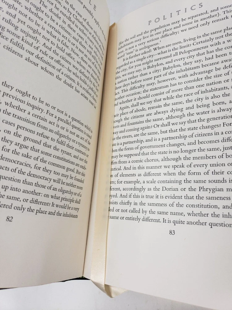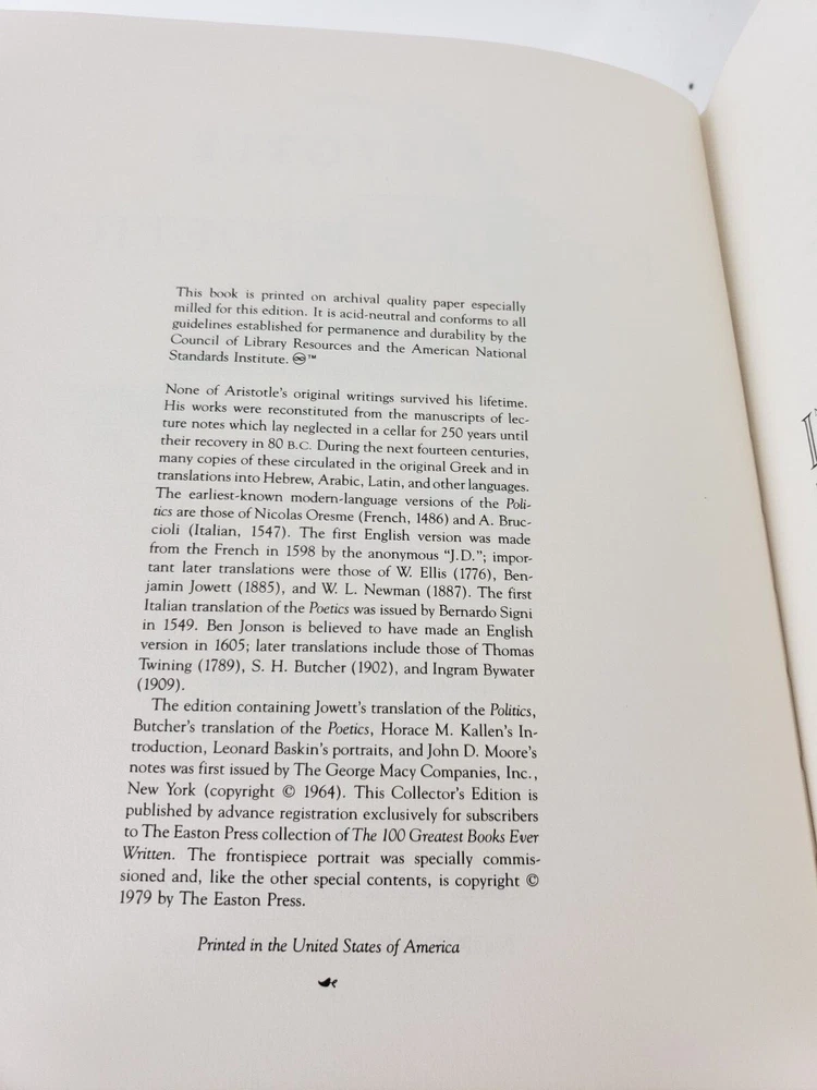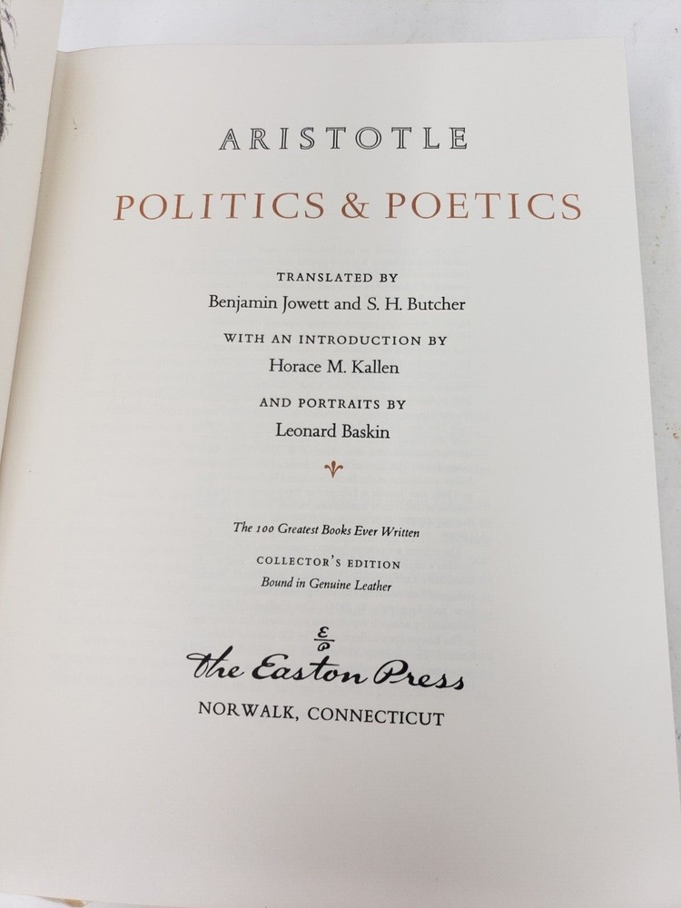 POLITICS & POETICS Easton Press Leather Collector's Edition Aristotle Translated by Benjamin Jowett & S. H. Butcher Introductions by Horace M. Kallen Portraits by Leonard Baskin In Like New, Near Mint Condition The 100 Greatest Books Ever Written Books Measure 10 3/8" x 7 1/2" Cover is Dark Green with Gold Lettering Ribbon is White Always check out photos for more info on details I AM NOT A PHOTOGRAPHER! Please check out my other sales. Most items I get came from yard sales, Goodwill/Thrift stores and Auctions. I try to list any flaws I see. I definitely am not perfect. If I miss anything of MAJOR proportions, I will definitely make it right. Please note, all of these items are used unless noted. I like to say · I know a lot about a little · I know a little about a lot · I know Everything about NOTHING!