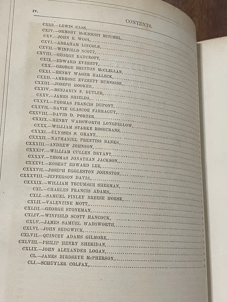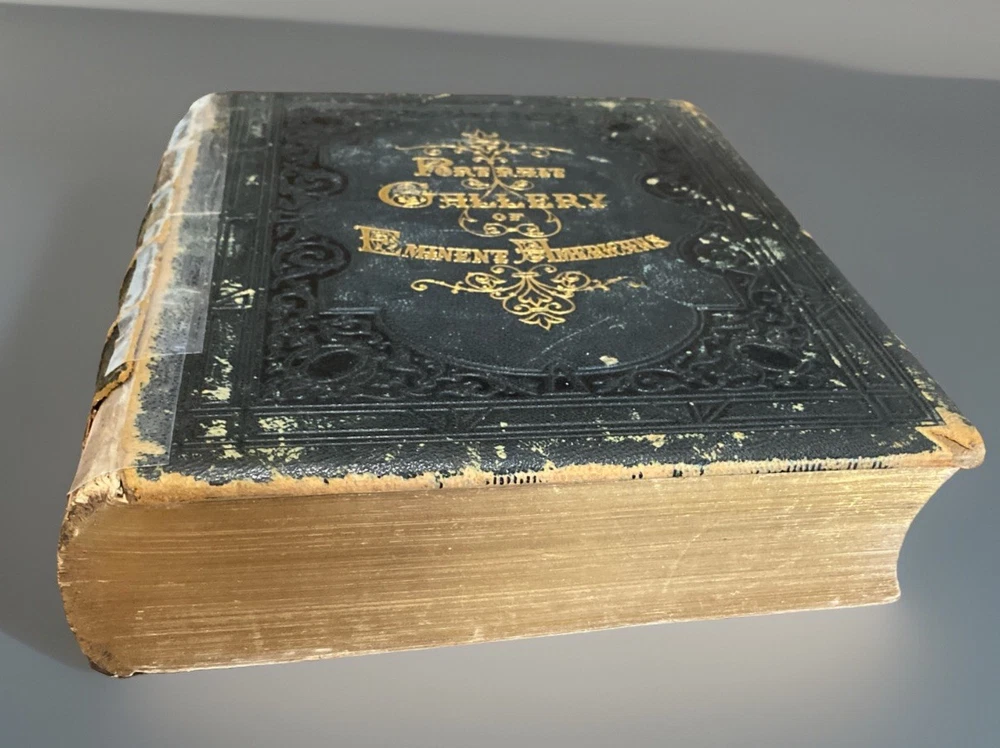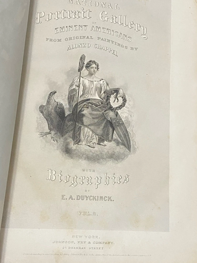 Up for sale is a fascinating antique book, Vol. II of a 2-volume set entitled "Portrait Gallery of Eminent Americans", 1864, Johnson, Fry & Co. Illustrated. 598 pps. Full title listed on title page reads: National Portrait Gallery of Eminent Americans From Original Paintings by Alonzo Chappel with Biographies by E.A. Duyckinck, Vol. 2.Heavy padded leather or leather like boards with gilt decorative title and embossed decoration to front cover, gilt titles on spine. Spine has six sections of which the topmost one is almost entirely missing and bottom section has chipped off on the lower edge and left side. Raised ridges separate each section. Cover is worn at extremities especially at corners as would be expected with scuffing to front cover. Gilt titling and decoration are still bright and not worn. Gilt page edges all around. Missing rear board; front cover and spine reattached. Fep has decorative former owner bookplate attached. Brown endpapers. Text block is intact, with no missing or loose pages. Tissue protection to frontis of Washington Irving & to title page. Some ink staining to page edges which does not interfere with the text or the illustrations; there is no writing anywhere within text block or on end papers. Pages have some age toning; light water stains to first ten or so pages on upper right edge. Bfep has a few surface scratches, wear to outer edge, piece missing on lower right edge, & one closed tear; last 3 pages and tissue protector are creased at upper & lower page edges, with some minor chipping at edges.The illustrations in this book are finely and exquisitely detailed and are a fascinating glimpse of the movers and shakers, the most influential people in the United States at a pivotal time in the history of the country. This a great collectible piece of American history!