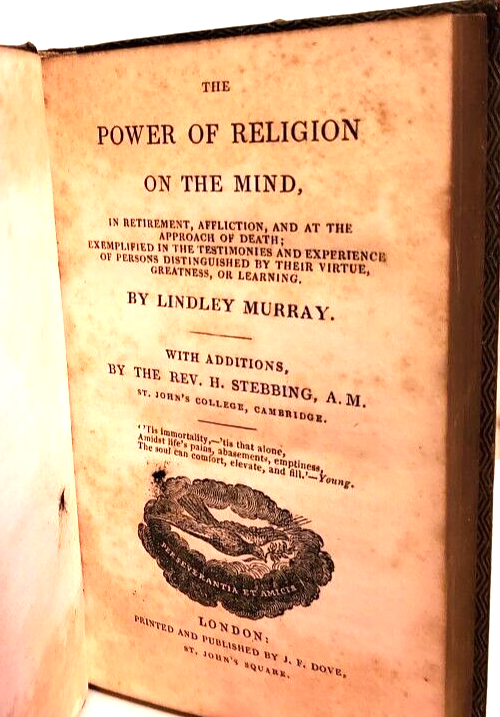 THE POWER OF RELIGION ON THE MIND Lindley Murray THE POWER OF RELIGION ON THE MIND - IN RETIREMENT, AFFLICTION AND AT THE APPROACH OF DEATH, by Lindley Murray ...... This book was published by D ove, London, no publication date is given, but the book appears to be from the mid 1800s...... HARDCOVER - The book is bound in full leather, with the pages tipped with gold - not sure if it is the original cover or not......A small book, it measures about 5 inches high, and about 3 inches across the front… .... CONDITION - The book is in good condition.......The pages are overall good, with spotting, mostly on the title page ...……The cover is solid, with some wear and use, and is cracked along part of the front upper hinge. ..........This is a purty good ol' book, it's old, so do handle it with care......I think you wilkl be mighty pleased with is...... ...... PAYMENT AND SHIPPIN' - 'Course the thrilled buyer is gonna hafta pay $4.75 for shippin' and handlin'.... ....Multiple purchases save on shippin'... ...Now while you're here, why don't you give my other auctions a look-see...Why, I 'spect I got a wagon load of mighty good books over yonder in my Book Barn... Thanks a heap....!! - - - ol' arkee