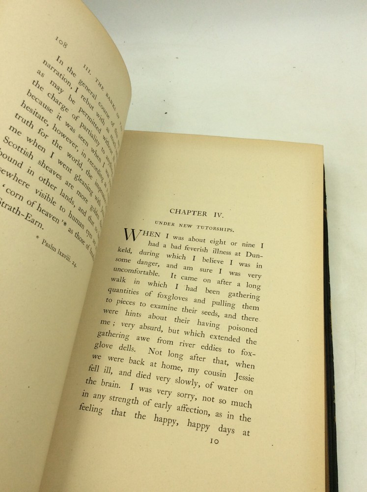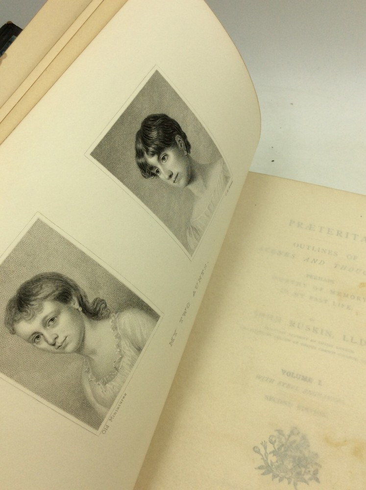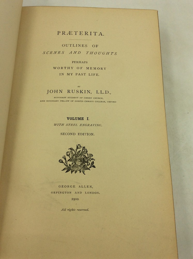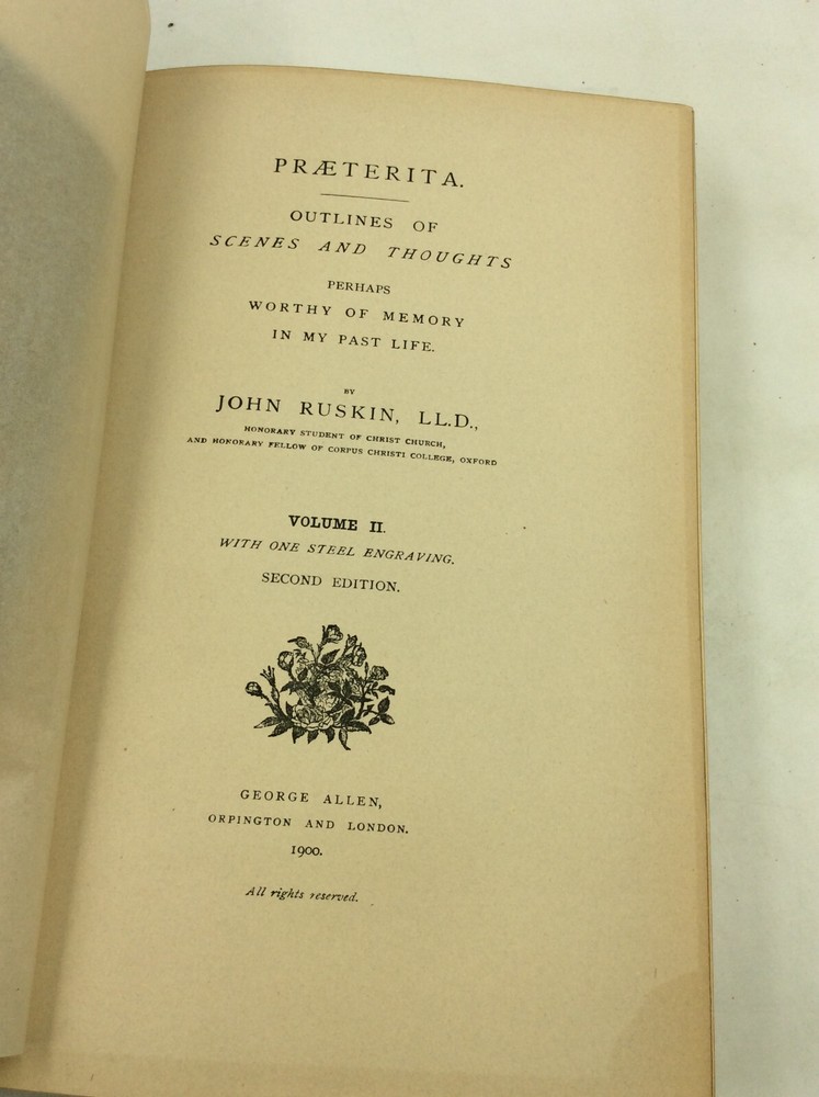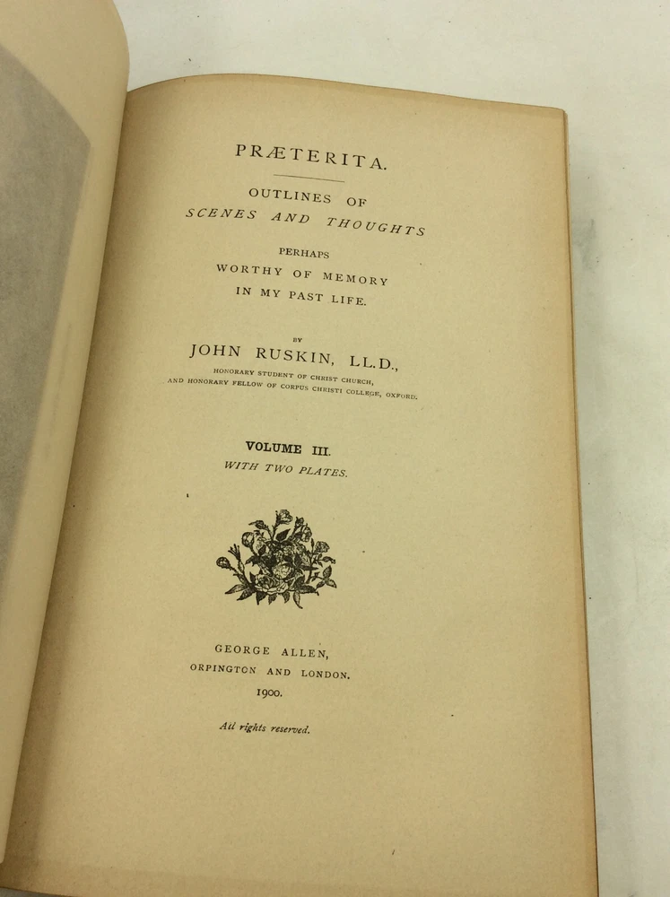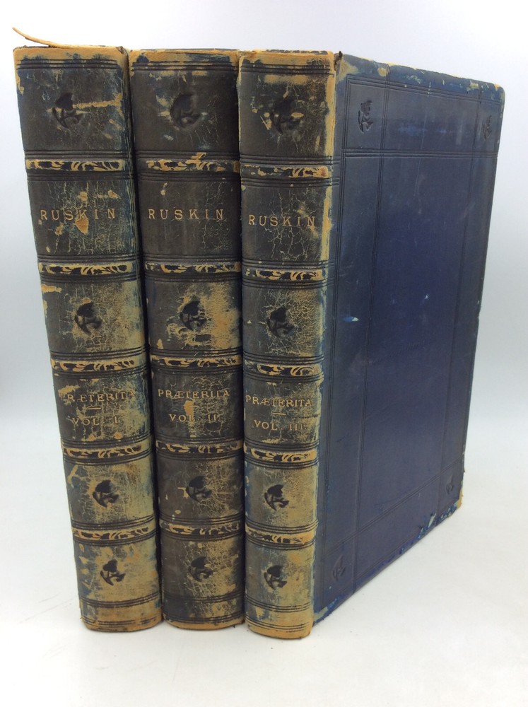 John Ruskin PRAETERITA. Outlines of Scenes and Thoughts Perhaps Worthy of Memory in My Past Life, Volumes I-III Orpington/London: George Allen, 1900. Second Edition. Leather. 3 vols. 432p; 442p; 171p. A complete set of three hardcover books bound in full blue leather with gilt foredges, five raised bands on each spine, and marbled endpapers. The spines and edges are heavily scuffed; the spines are also a bit tanned. Cracks forming along the edges of the spines, but binding remains internally tight. A few scrapes on the surfaces of the boards as well. Owner's bookplate inside each front cover and pencil notes on rear endpapers. Pages a bit age-toned, but text clean. Item #182997 The Victorian writer's autobiography in three volumes.