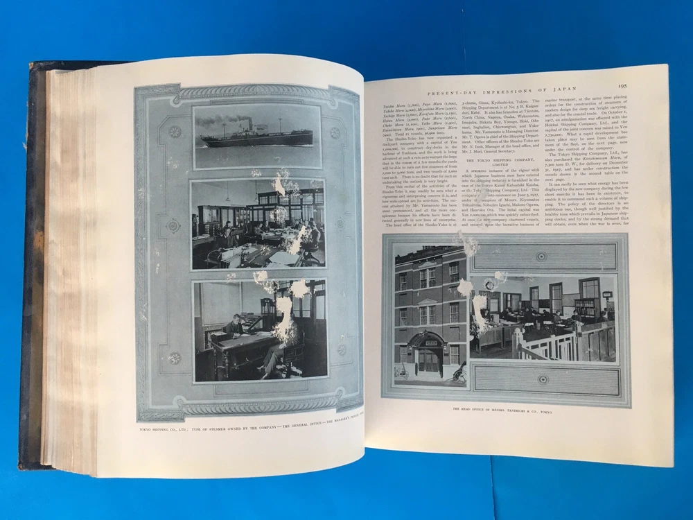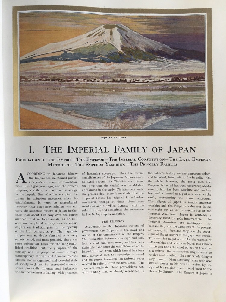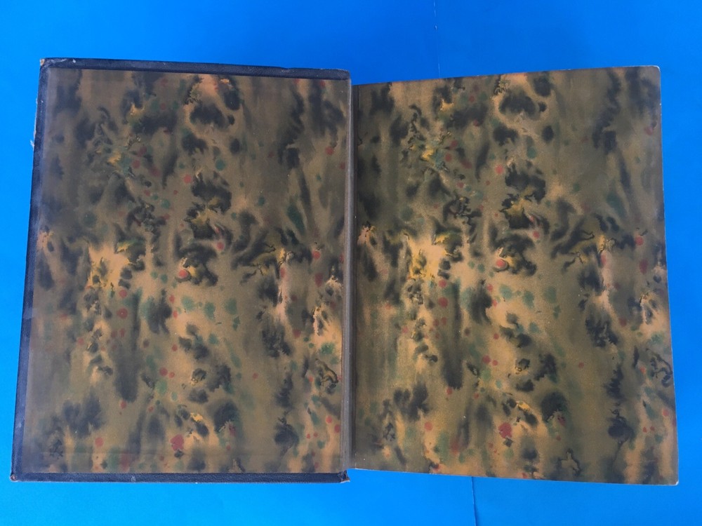 PRESENT DAY IMPRESSIONS OF JAPAN Copyright 1919 Globe Encyclopedia Morton-Cameron Leather-Bound Marbled End Paper Huge Gorgeous Antique Encyclopedia (over 100 years old!) with Leather Binding and beautiful End Paper. Very Generously Illustrated: lots of Photos + Maps Comprehensive Overview of Japan’s History + Culture In Good Vintage Condition: the Front Cover is still attached but is loose and may eventually need to be repaired; no marks or writing and not much creasing. There is discoloration and tanning in areas. Went through every single page—main issue is just that a few pages were partially stuck together and pulling them apart left a few marks—see last photo for example. There are about 6-8 pages with these small marks from pages sticking together. Some of the velum sheets protecting the color plates are creased. *Carefully Packaged, and Shipped Fully-Insured with Tracking, and Expected Delivery Date Notification via USPS Media Mail