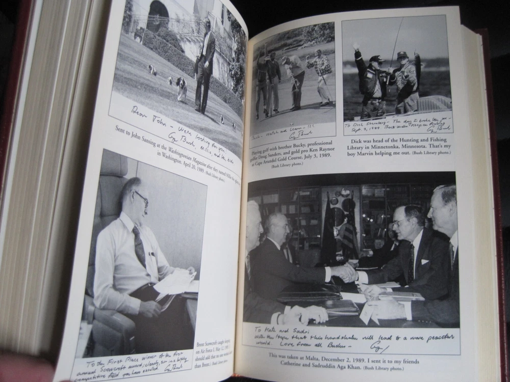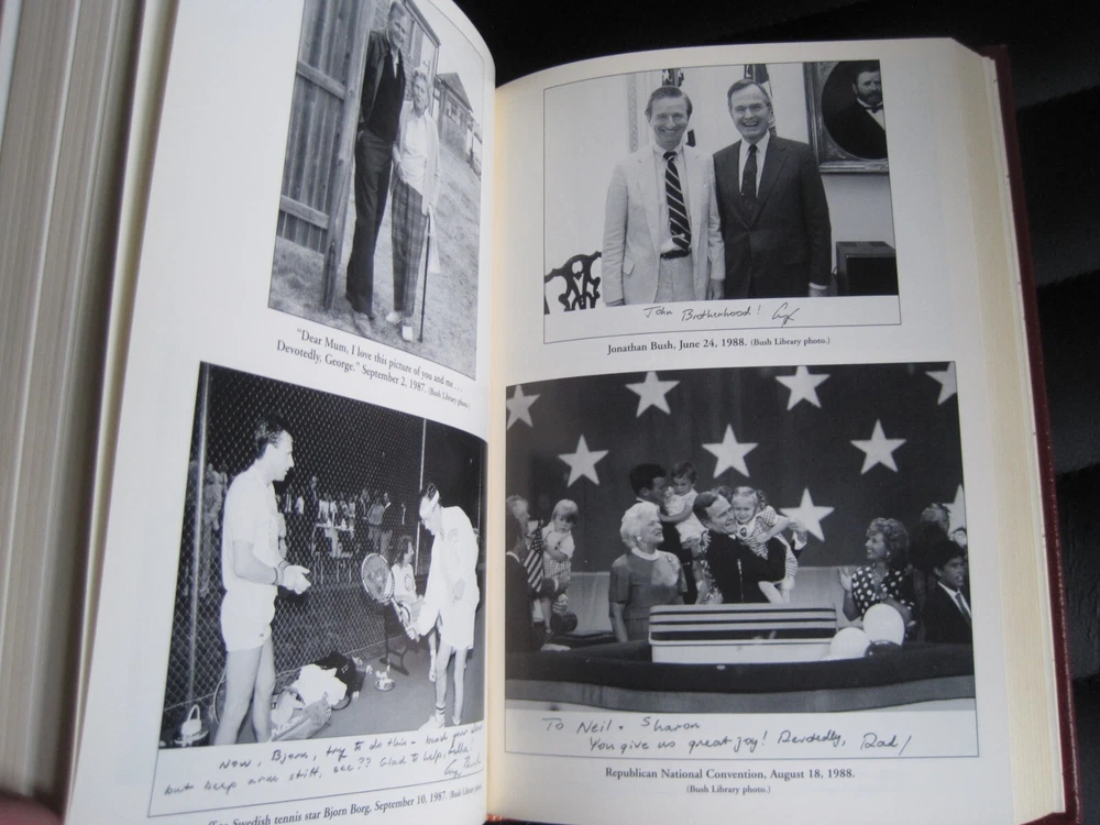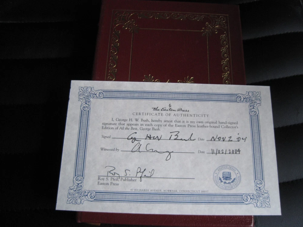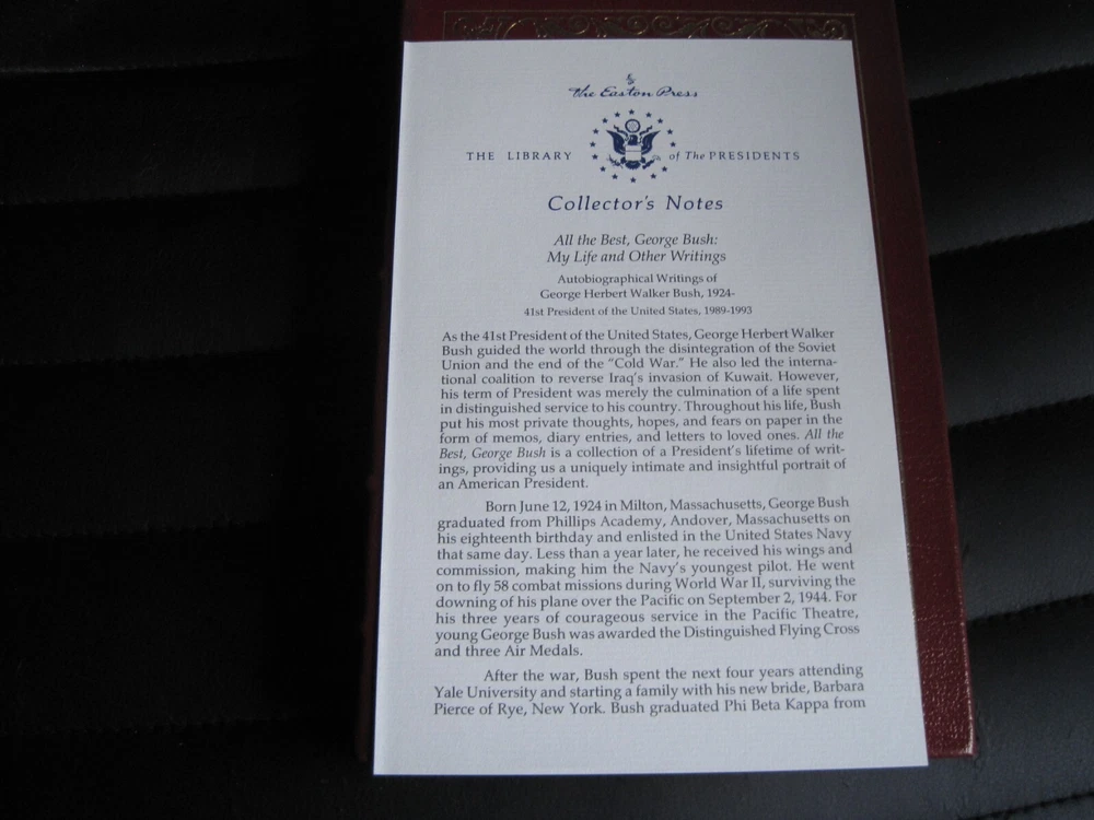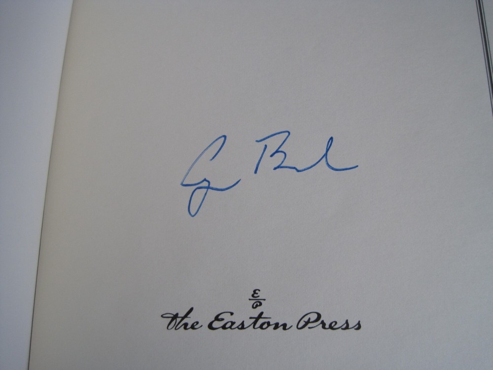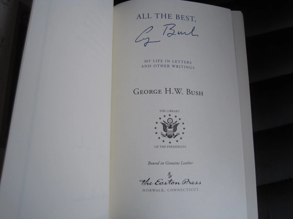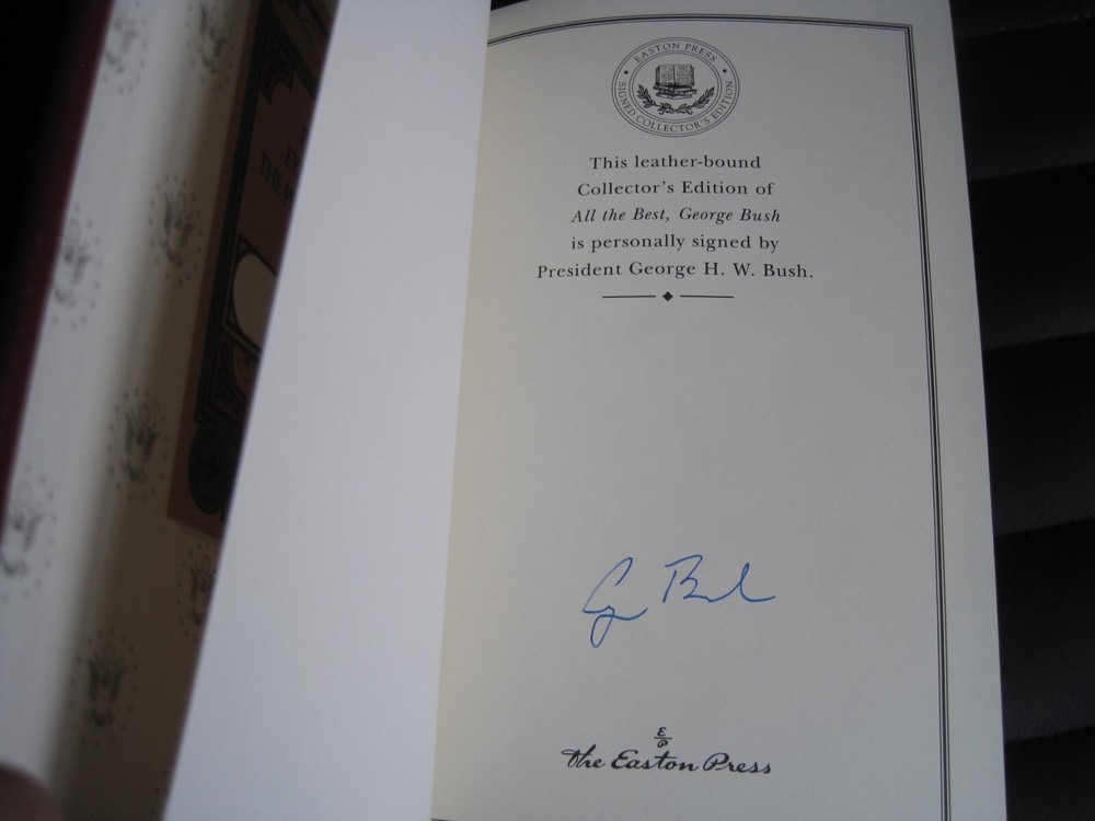This is a leather bound signed collector's edition of former President George H W Bush's best selling memoir - "All The Best, George Bush. My Life and Other Writings" . Though reticent in public, George Bush has openly shared his private thoughts in his correspondence throughout his life. Fortunately, since the former president does not plan to write his autobiography, this collection of letters, diary entries, and memos, with his accompanying commentary, will fill that void. Organized chronologically, the volume begins with eighteen-year-old George's letters to his parents during World War II, when, at the time he was commissioned, he was the youngest pilot in the Navy. Readers will gain insights into Bush's career highlights -- the oil business, his two terms in Congress, his ambassadorship to the U.N., his service as an envoy in China, his tenure with the Central Intelligence Agency, and of course, the vice presidency, the presidency, and the postpresidency. They will also observe a devoted husband, father, and American. Ranging from a love letter to Barbara and a letter to his mother about missing his daughter Robin after her death from leukemia to a letter to his children two weeks before Nixon's resignation to one written to them just before the beginning of Desert Storm, the writings are remarkable for their candor, humor, and poignancy. As the Bushes continue to emerge as a major political family, this portrait of its unassuming patriarch is timely and important. That George Bush is allowing this much of the collection to be published is remarkable in itself. All the Best, George Bush provides a surprisingly intimate and insightful portrayal of the forty-first president of the United States. As the author writes in his Preface: "So what we have here are letters from the past and present. Letters that are light and hopefully amusing. Letters written when my heart was heavy or full of joy. Serious letters. Nutty letters. Caring letters, and rejoicing letters....It's all about heartbeat." The book is unread and in great condition (see images). Signed by former President Bush on the limitation page, it also includes the signed and dated certificate of authenticity, and the publisher's note. The book has a blank Easton Press bookplate attached (see images). Easton Press books are the golden standard in the publishing industry, highly collectible and lasting generations. Easton Press Full Genuine Leather Dubbed Spine Accented Wit 22 kt. Real Gold Satin Ribbon Page Marker Distinctive Cover Design Gilded Page Edges To Protect Against Humidity High Quality Acid - Free paper Smyth-Sewn Pages Silk-Moire Endleaves I combine multiple items for savings on shipping charges. I ship worldwide. Please ask about international shipping charges and/or different shipping options. Thank you!