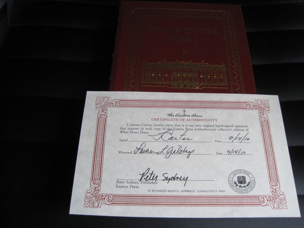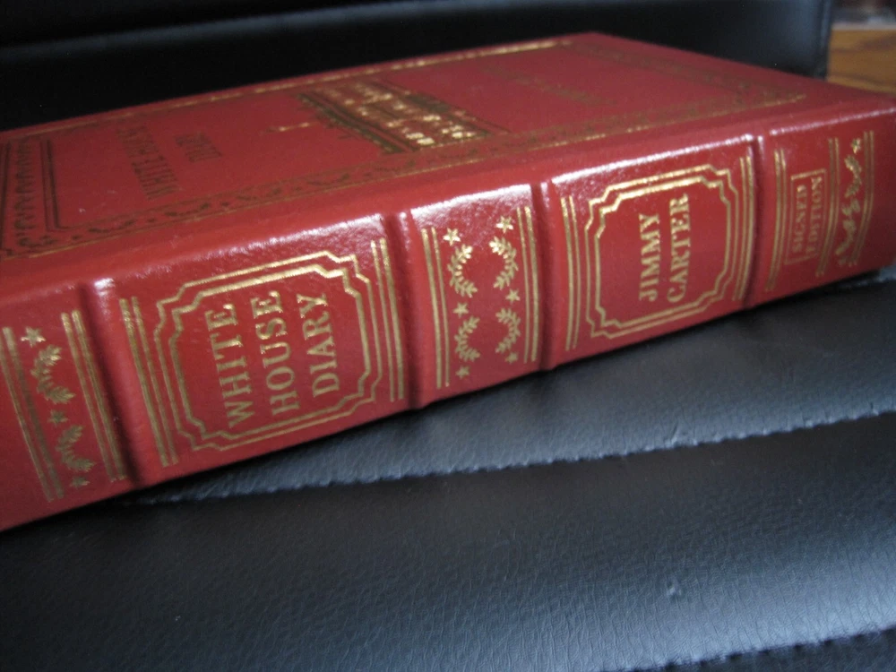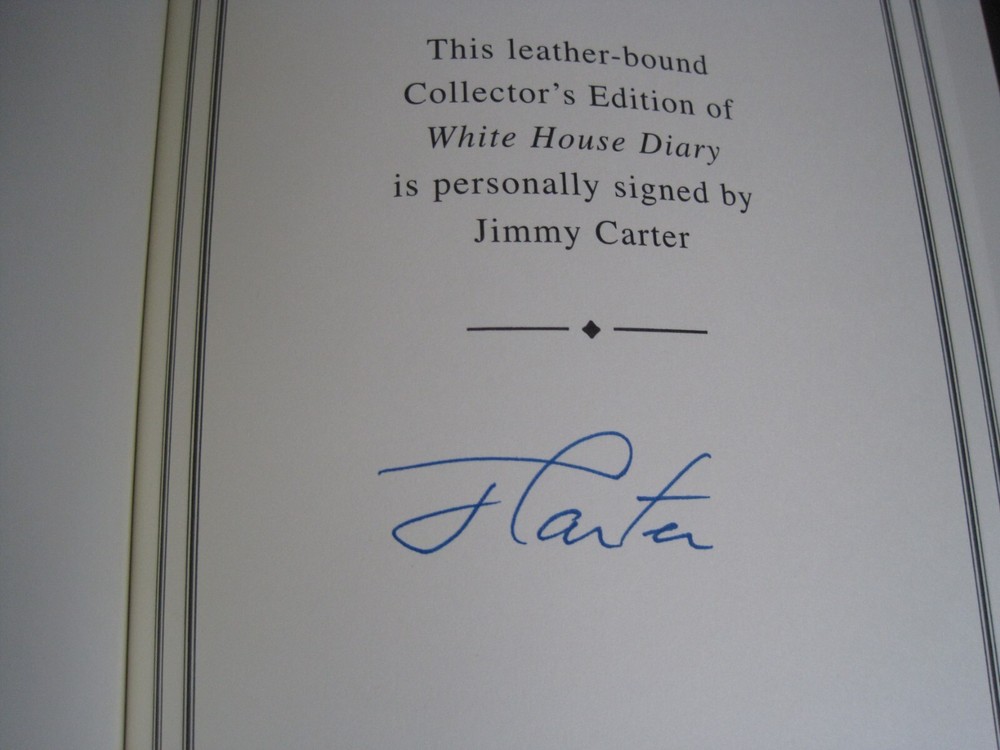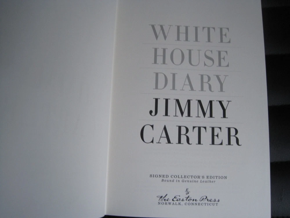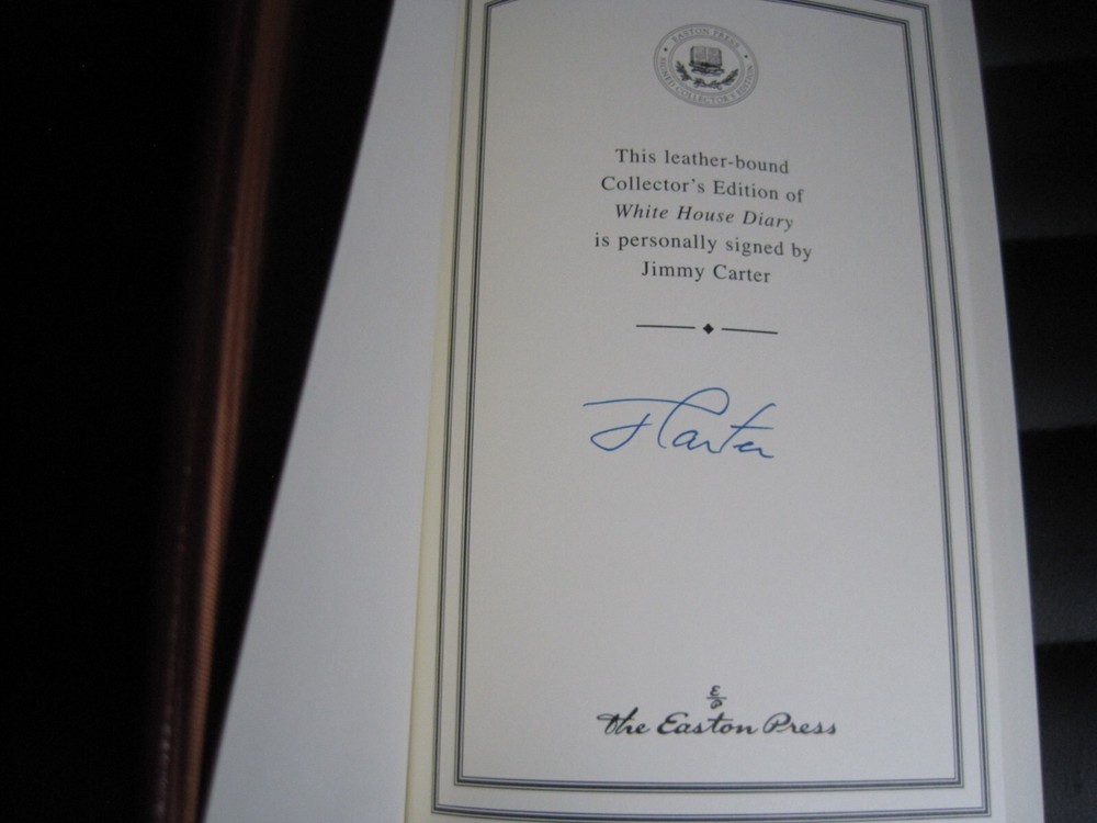 This is a leather bound signed collector's edition of former President Jimmy Carter's best selling memoir - "White House Diary" . A massive and comprehensive book chronologically describing and analyzing all the relevant events that happened during the Carter administration, and the specific ways the White House reacted at the time. The book is new, unread, and in great condition. Signed by former President Carter on the limitation page, it also includes the signed and dated certificate of authenticity . Easton Press books are the golden standard in the publishing industry, highly collectible and lasting generations. Easton Press Full Genuine Leather Dubbed Spine Accented Wit 22 kt. Real Gold Satin Ribbon Page Marker Distinctive Cover Design Gilded Page Edges To Protect Against Humidity High Quality Acid - Free paper Smyth-Sewn Pages Silk-Moire Endleaves I combine multiple items for savings on shipping charges. I ship worldwide. Please ask about international shipping charges and/or different shipping options. Thank you!