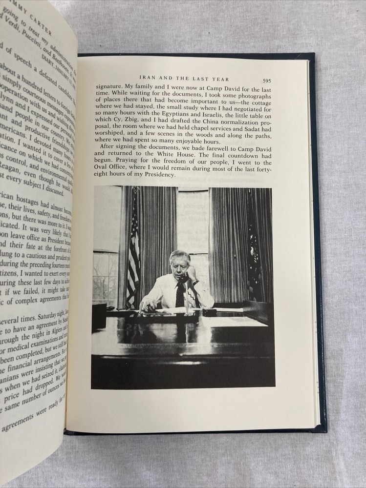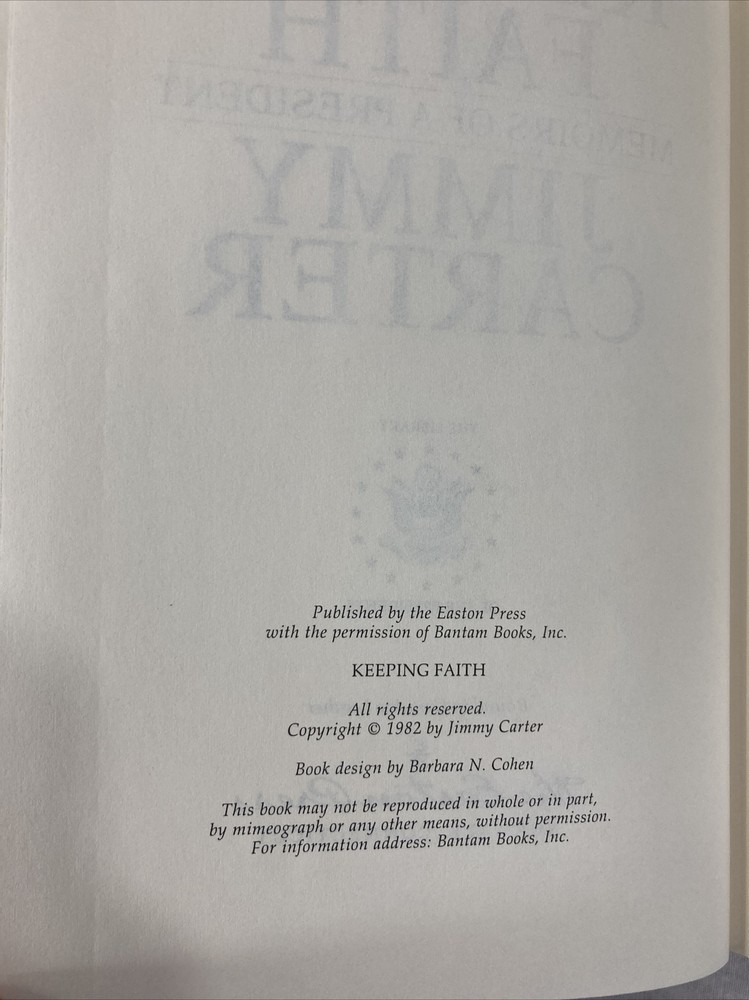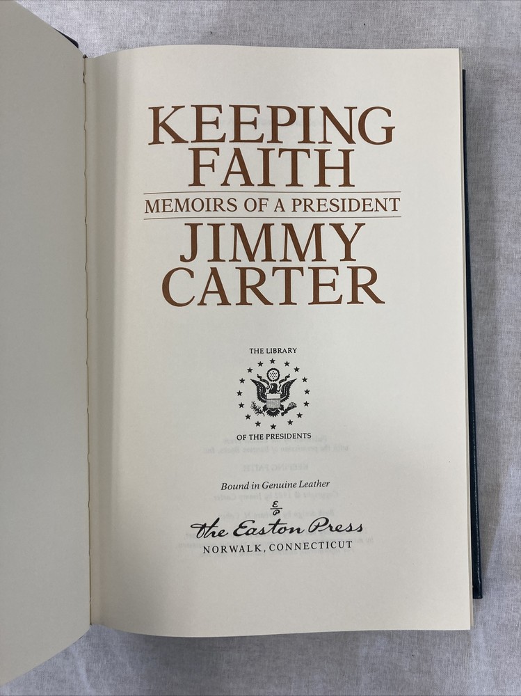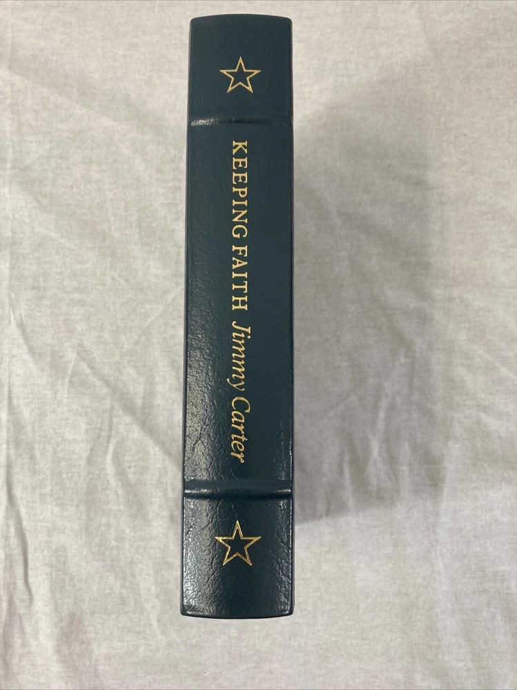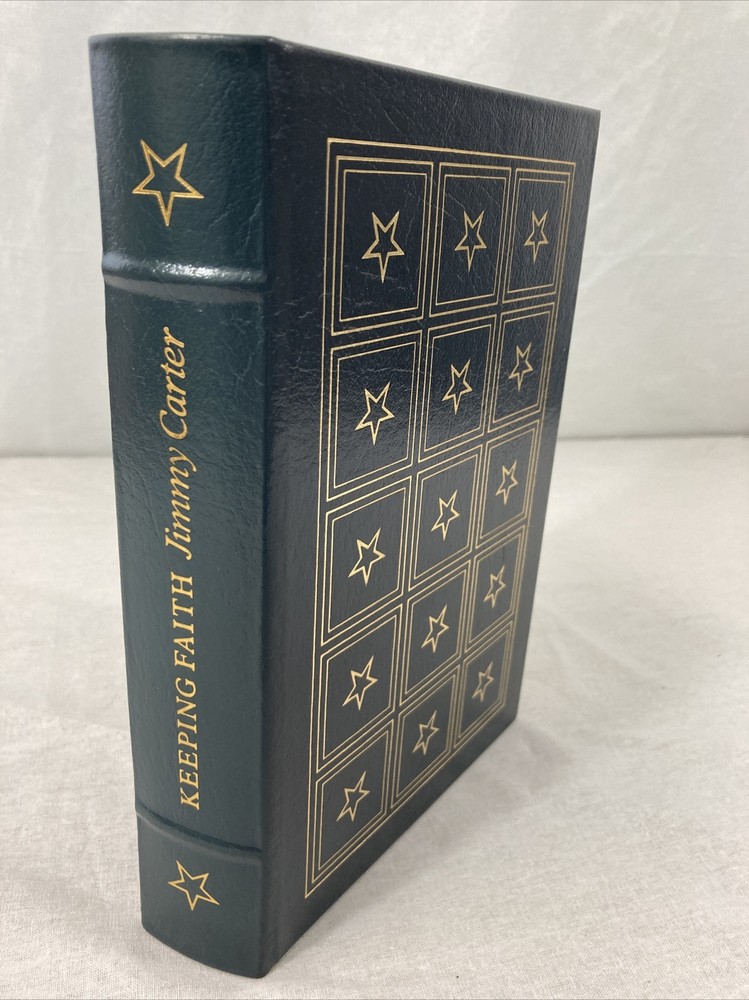 For sale is a signed, limited edition of President Jimmy Carter's memoir Keeping Faith published by the Easton Press in 1982. The book is in near fine condition with a small amount of wear to the bottom board edges, see photos. The spine and boards are tight and straight. There are no internal markings other than Carter's signature. There is no previous owner's bookplate or markings. The page-edge gilt is in near fine condition with minor wear to the front page edges, see photos. Let me know if you have any questions. Don't forget to take a look at my other signed, limited edition books and prints for sale. Thank you