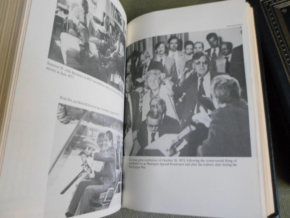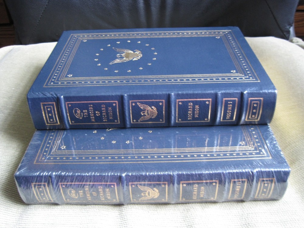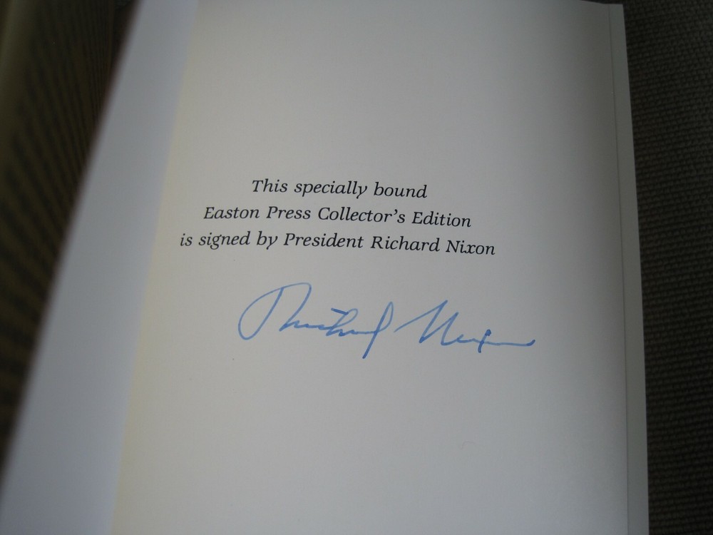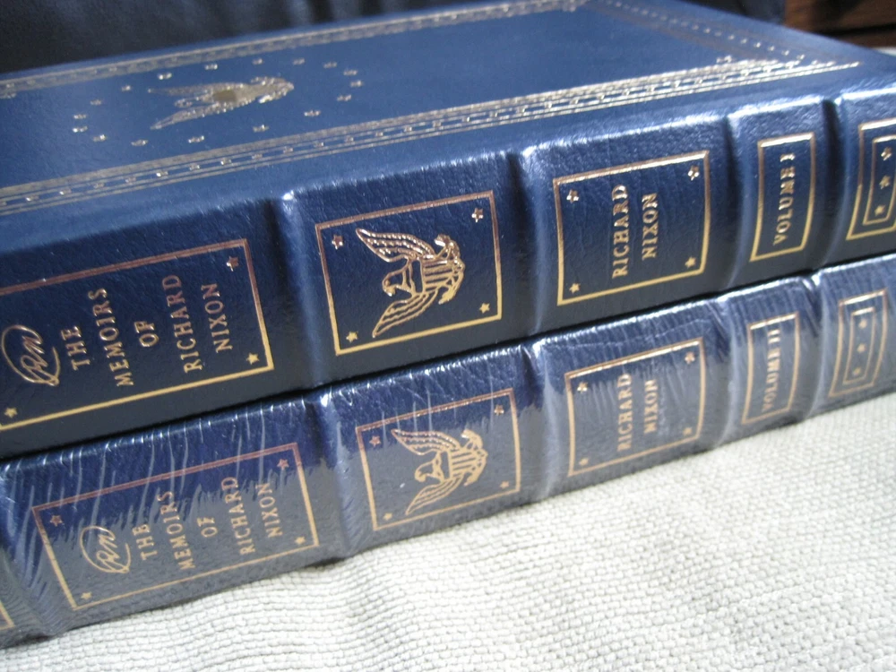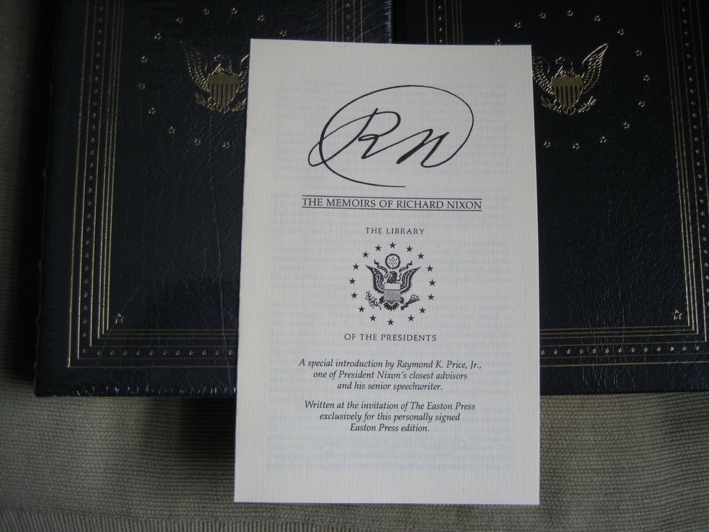 This is a leather bound 2 volume set signed collector's edition of former President Richard Nixon's best selling autobiography - "The Memoirs of Richard Nixon" . A very honest and well-written book on President Nixon's childhood, adolescence, political career, Watergate scandal, and presidency. Both books are are in great condition and they include the 8-page presentation pamphlet unique to this Easton Press limited edition. Volume 1 is unread and it is signed by President Nixon on the limitation page. It unfortunately has a little bump on the bottom right corner of the cover (see images). Volume 2 is flawless and still sealed in the original plastic packaging. Easton Press books are the golden standard in the publishing industry, highly collectible and lasting generations. Easton Press Full Genuine Leather Dubbed Spine Accented Wit 22 kt. Real Gold Satin Ribbon Page Marker Distinctive Cover Design Gilded Page Edges To Protect Against Humidity High Quality Acid - Free paper Smyth-Sewn Pages Silk-Moire Endleaves I combine multiple items for savings on shipping charges. I ship worldwide. Please ask about international shipping charges and/or different shipping options.Thank you!
