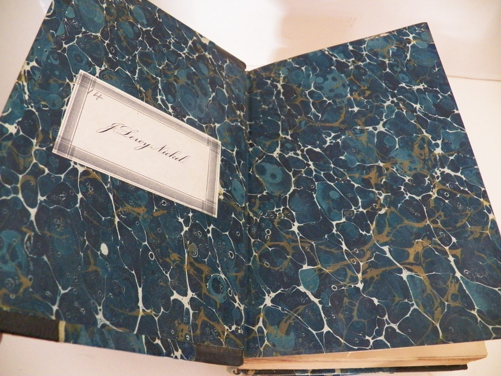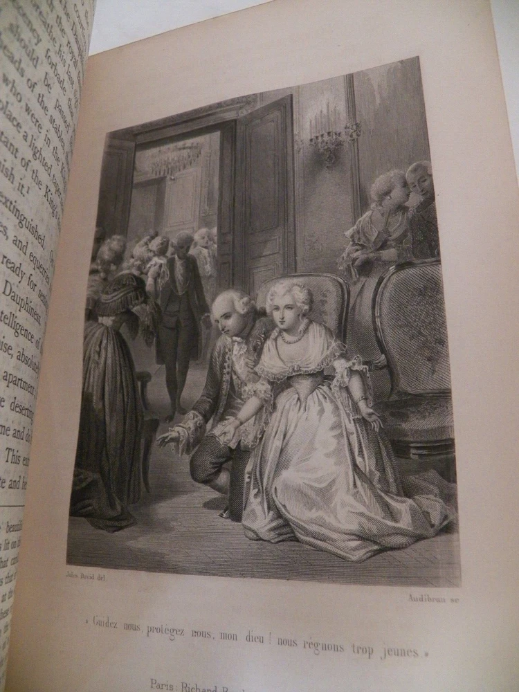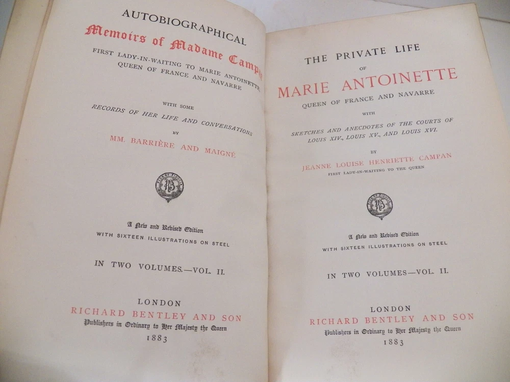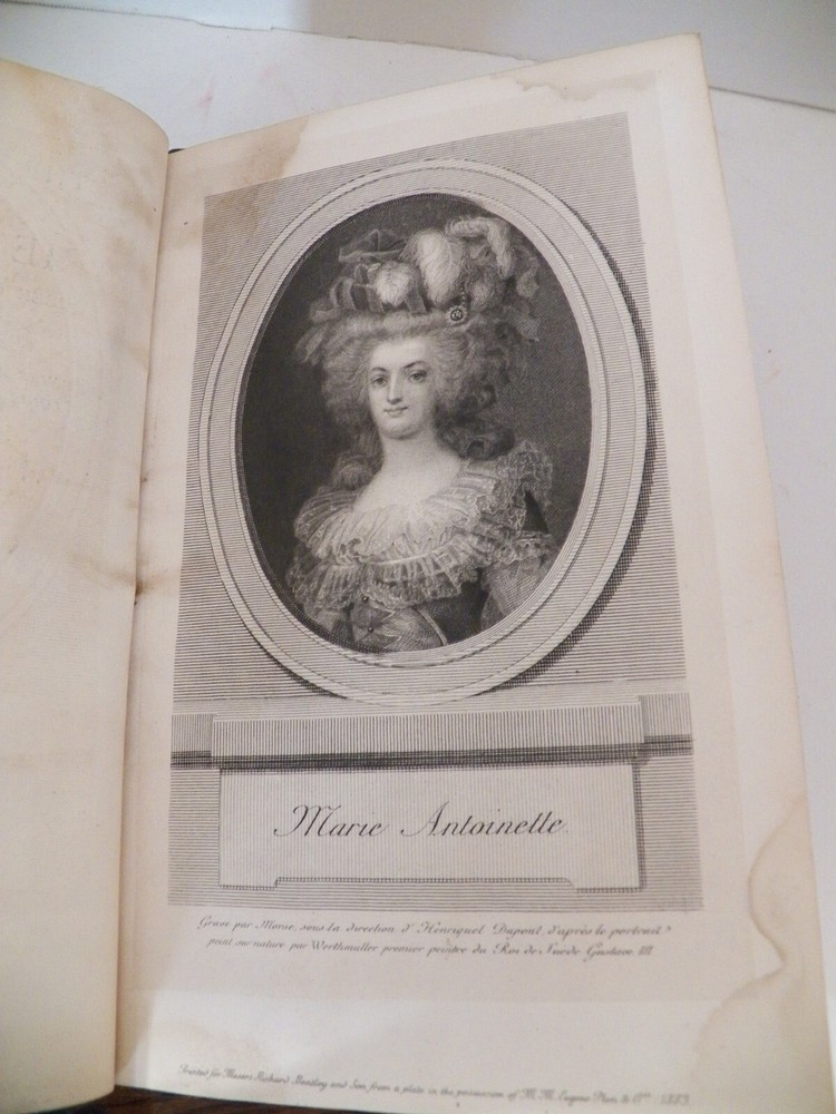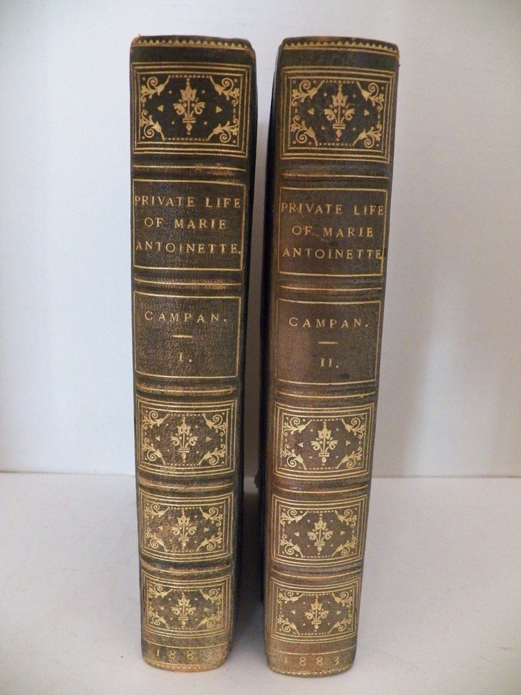 PRIVATE LIFE OF MARIE ANTOINETTE, 2 VOLUMES IN 1/4 DARK BLUE LEATHER + CORNERS, THESE ARE IN NICE CONDITION FOR THE AGE, JUST A FEW VERY SLIGHT BUMPS AND SCUFFS ON THE EDGES AND SOME WATER STAINS ON A FEW PAGES. THERE IS A PERSONALIZED BOOK PLATE INSIDE Dimensions: 9" X 6" Please email early with questions.