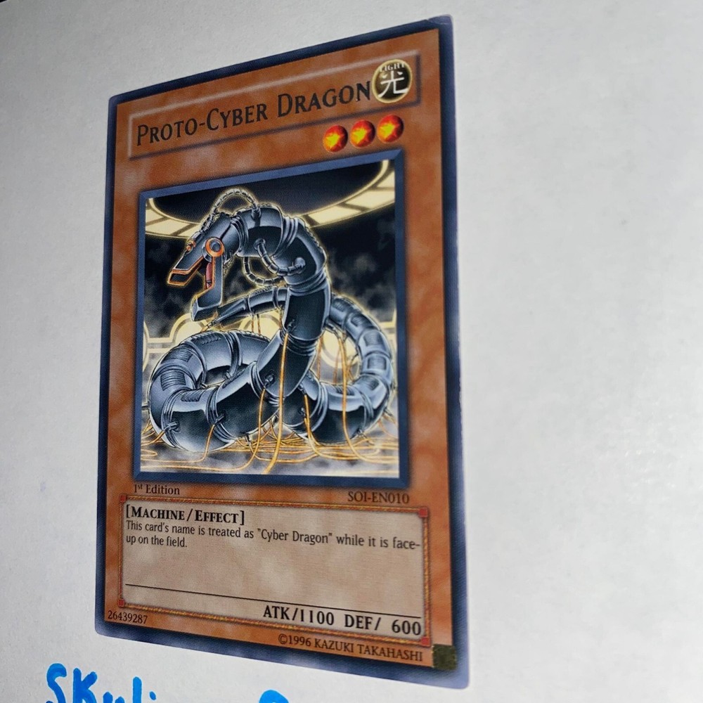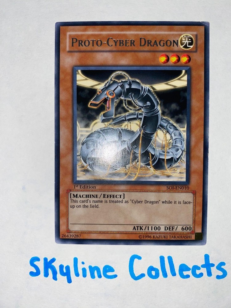 PROTO-CYBER DRAGON 1st EDITION (SOI-EN010) - LP - RARE YUGIOH CARD Small fold on one side of card (see images) other than that card is in good condition! ADDT'L CARD CONDITION IMAGES: If you would like more pictures of the card prior to purchasing, please let me know! I'm more than happy to take more detailed pictures if needed. I want to make sure you know what you buy before you do, so don't hesitate to send me a message to request more images. Below you can find some of the descriptions defined, but I'm no grading card expert so please ask if something isn't clear on the images. CARD DESCRIPTIONS DEFINED: MI (Mint) - Card is basically pack fresh, no issues at all. NM (Near-Mint) - Card may have a tiny issue but is almost perfect. LP (Lightly-Played) - Card has signs of being played but nothing major. MP (Moderately-Played) - Card has definitely been used in games, may have minor creases/scratches, some white on borders. HP (Heavily-Played) - Card has major creases/scratches, but still intact. Likely has white on most borders of the card. Thank you for viewing the auction, I appreciate your orders, and good luck with your collections! :D