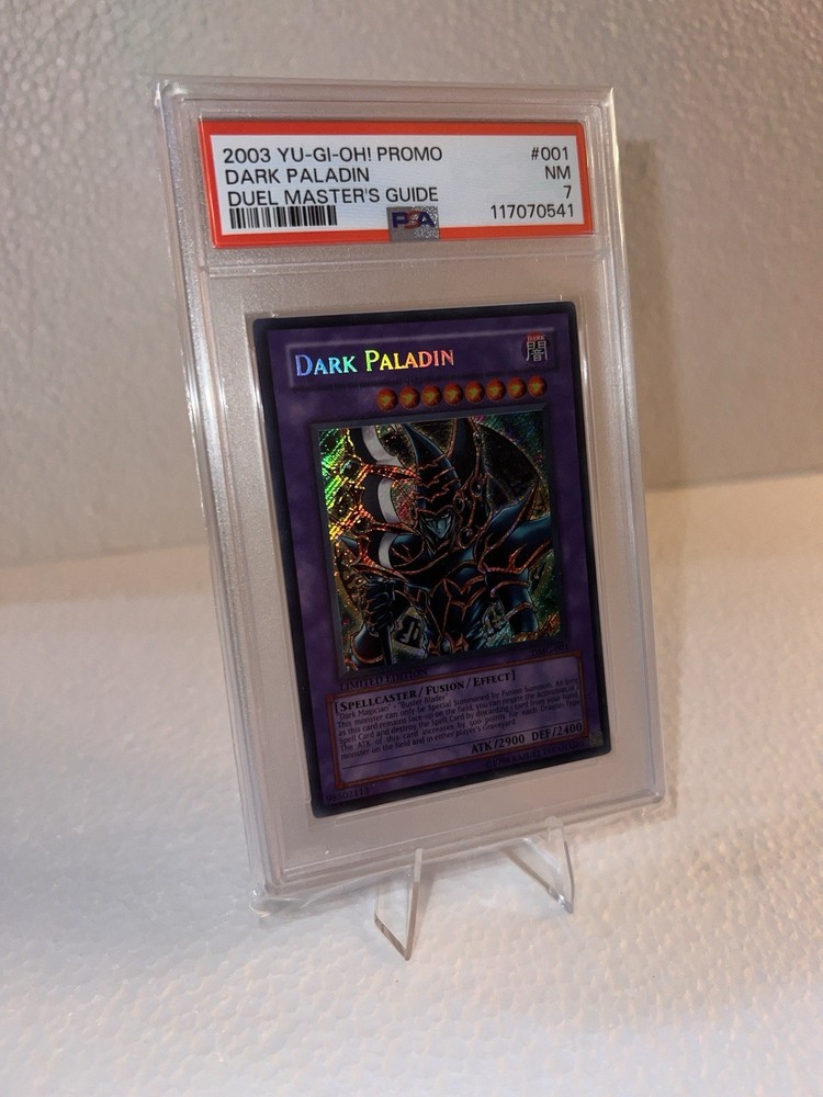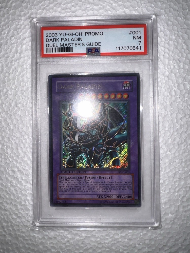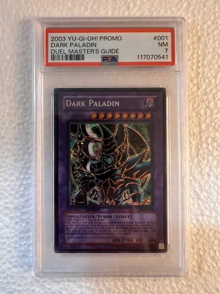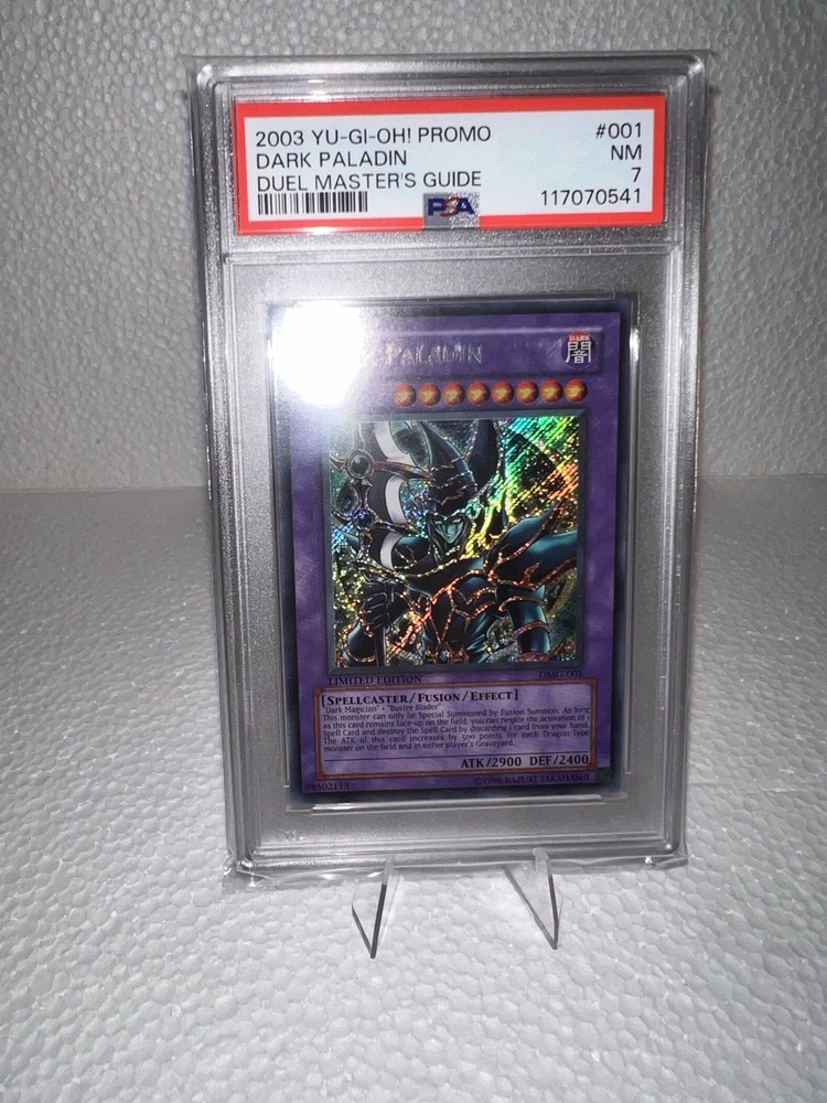 Unleash the power of Dark Paladin from the Duel Master's Guide, a Secret Rare treasure for collectors and duelists alike. This 2003 Konami classic, card number DMG-001, comes in pristine condition, graded a perfect 10 by the Professional Sports Authenticator (PSA), ensuring its top-notch quality and authenticity. Its holographic finish captures the essence of its Effect type, making it a standout piece in any Yu-Gi-Oh! TCG collection. This spellcaster card, steeped in the richness of Darkness attribute, is a true gem from the early days of the game. Crafted from durable card stock, it remains a testiment to the game's vintage heritage. An English-language card, it's ready to take its rightful place in your revered collection or to elevate your gameplay with its strategic depth. Final Sale IGEE jenerictradeandexchange