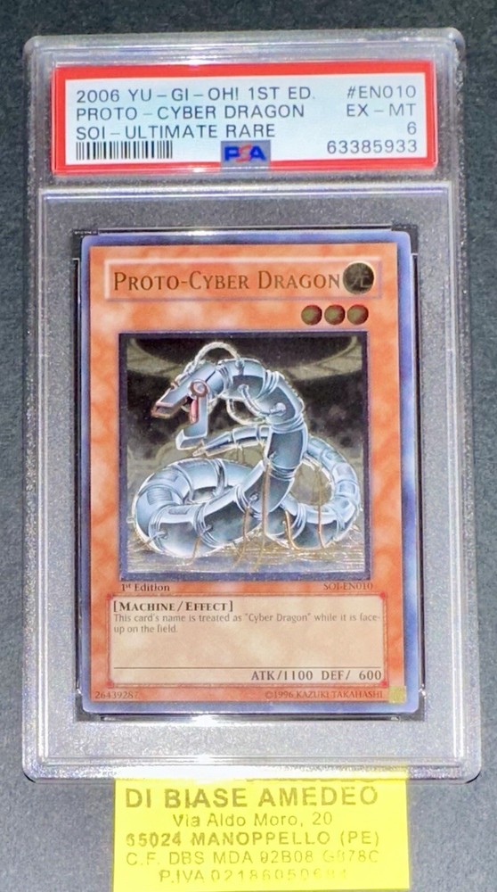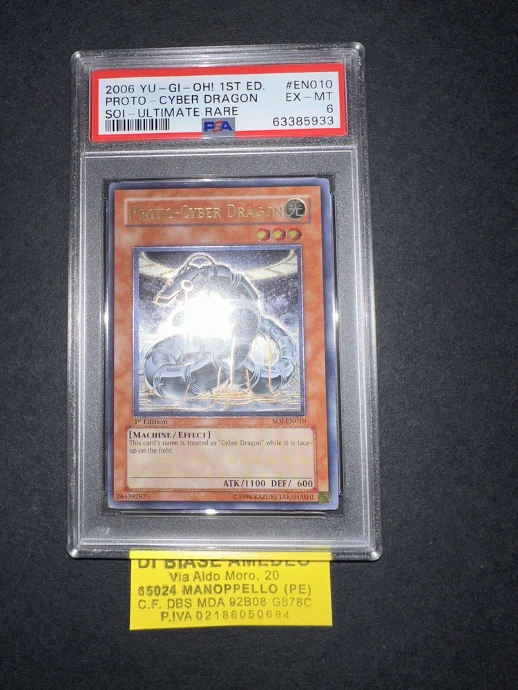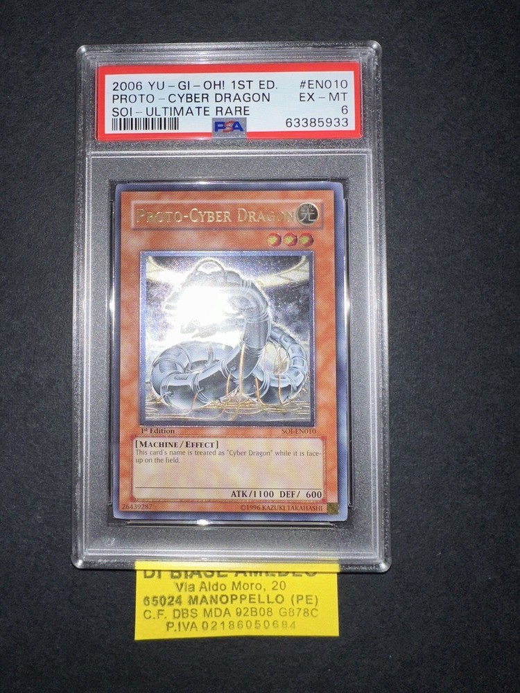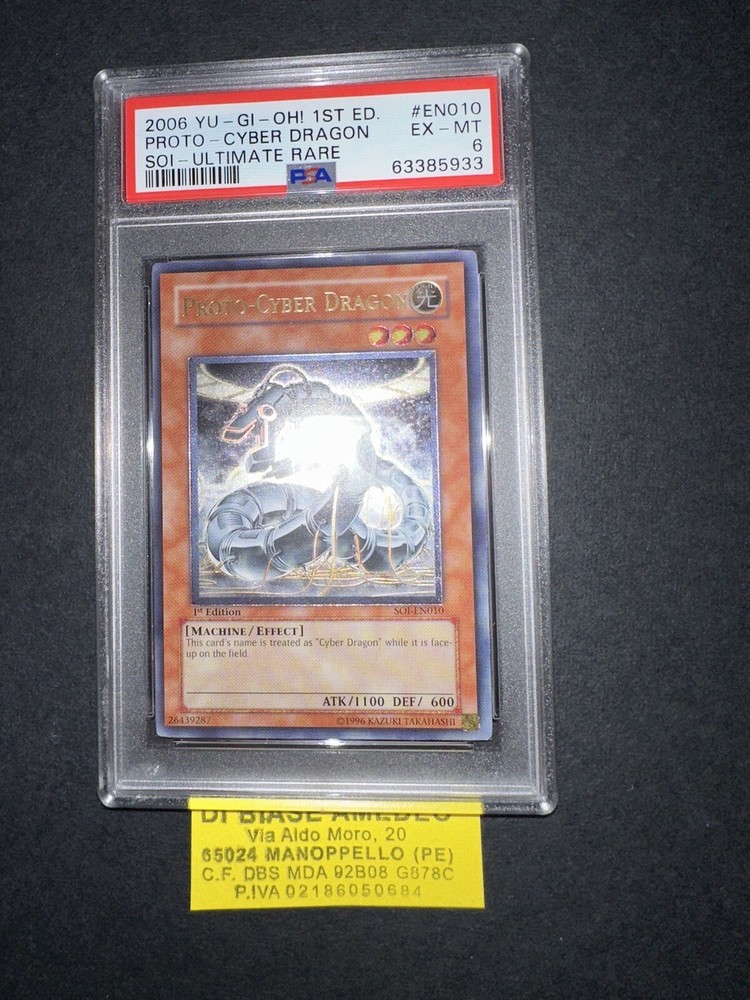 PSA 6 PROTO-CYBER DRAGON SOI-EN010 1st EDITION ULTIMATE RARE ENGL 2006! LA PLASTICA PSA PUÓ AVERE GRAFFI CHE NON INFLUISCONO SUL VALORE DELLA CARTA! LA CARTA È CERTIFICATA PSA CON VOTO 6 ED È ESATTAMENTE COME VISIBILE NELLE FOTO ! VERRÀ SPEDITA CON UN UNA SLEEVES PROTEGGI PLASTICA E NEL MODO PIÙ PROTETTO CHE ESISTE! X ULTERIORI FOTO NON ESITATE A CONTATTARMI! È ORIGINALE COME TUTTE LE CARTE CHE HO IN VENDITA! PER PIÙ ACQUISTI SI PAGA SEMPRE UN UNICA SPEDIZIONE E LA CARTA VERRÀ SPEDITA NEL MODO PIÙ PROTETTO POSSIBILE USANDO CARTONCINI E PACCO CON BOLLICINE! SONO MOLTO SERIO È SEMPRE DISPONIBILE PER INFO,FOTO O OFFERTE, NON ESITATE A CONTATTARMI IN QUALSIASI MOMENTO!