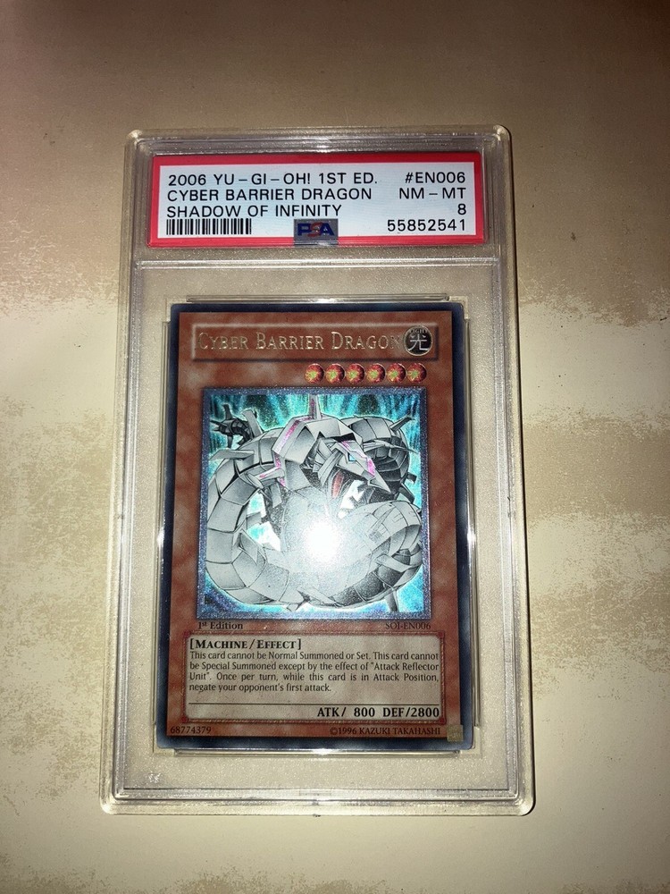 This Yu-Gi-Oh! trading card is a rare find for collectors. The card features the Cyber Barrier Dragon and is a 1st Edition SOI Ultimate Rare #EN006. It has been graded by PSA with a score of 8, making it a valuable addition to any collection. The card was manufactured in 2006 and belongs to the non-sport trading card category. It is a must-have for fans of the Yu-Gi-Oh! franchise and collectors of trading card singles.