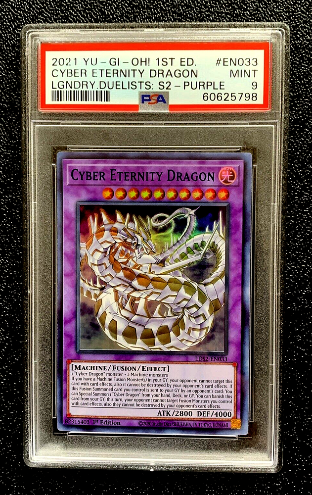 PSA 9 2021 CYBER ETERNITY DRAGON 1ST ED LEGENDARY DUELISTS PURPLE EN033 G4198E1122SD BEST PACKING ON EBAY GUARANTEED. WITH THAT SAID I HAVE BEEN TOLD I “OVER-DO-IT”. But I feel this is a testament to how much respect and care I have for your item. PLEASE, if you see an error in one of my listing send me a message, Thank you. ig= card . addiction Please subscribe if you are interested in a monthly news letter. Items with multiple cards of the same card for sale are mailed out in random order , but are all within the same condition as stated in “Card Condition” and or Item Description. SLABS MAY HAVE SOME SCRATCHES AND OR OTHER IMPERFECTIONS. IF YOU NEED A PRISTINE SLAB PLEASE JUST SHOP ELSEWHERE. INTERNATIONAL SHIPPING = ONLY THROUGH EBAY SHIPPING PLATFORM ! Add multiple cards to your shopping cart and or just request combined shipping at any time; 50 cents each additional single raw card and or 1 dollar each additional graded card. 10 dollars maximum shipping no matter how many cards you buy. Highest shipping cost plus .50 or $1.00 to a max of $10.00 SHIPPING, for trading cards only AND OR other small items , like jewlery, which CAN be combined. Please inquire FIRST, about combined shipping, if buying trading cards AND other items from my store. JUST PURCHASE I WILL REFUND DIFFERENCE OF SHIPPING ON MULTIPLE PURCHACES AFTER CHECK-OUT ... PLEASE give me time to respond and provide your refund of the shipping difference and to respond to messages. If you have any questions what-so-ever please ask BEFORE you bid, not after. I OFFER NO GUARANTEES ON ANY RAW CARDS EXCEPT THAT YOU WILL GET THE EXACT CARD IN THE PICTURE, except when there are multiples of a card for sale. No shipping over the weekends and holidays. Payments made Friday’s after 9:00 am will be shipped on Mondays, as long as the post office is open. =#’s= at end of item description are for cataloging purposes only, cross-referencing . I highly suggest LOW FEEDBACKERS to contact me prior to purchasing or be at risk of having your order canceled and being blocked. Track Page Views With Auctiva's FREE Counter