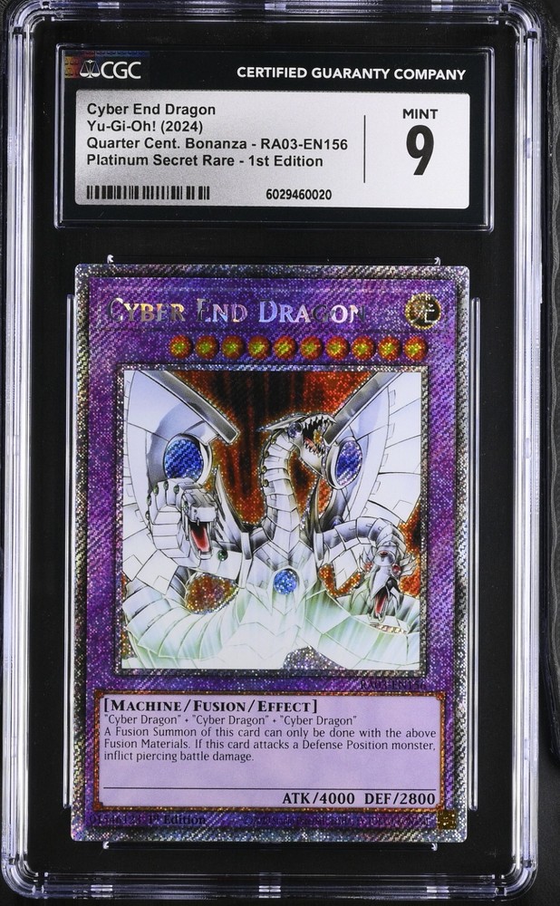 The PSA/CGC 9 MINT Cyber End Dragon RA03-EN156 Platinum Secret Rare 1st Edition card is a highly sought-after collectible in the Yu-Gi-Oh! TCG world. Manufactured by Konami in 2024, this English language card from the Quarter Century Bonanza set features a Cyber End Dragon with a Machine monster type. The card is of platinum secret rare rarity and is made of durable card stock material. With its unique attributes and features, this card is a valuable addition to any collector's deck.