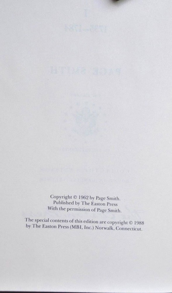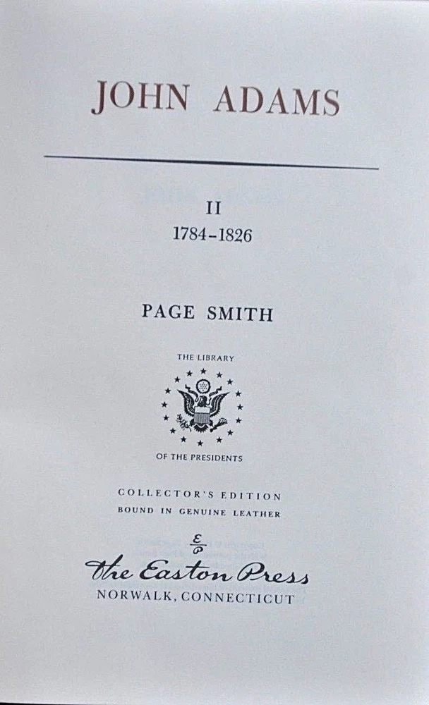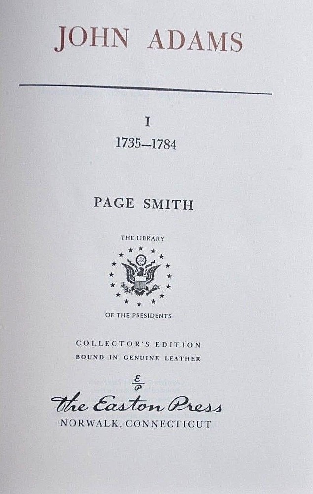 Page Smith - John Adams JOHN ADAMS : Easton Press 1st Edition 1st Printing Norwalk, Connecticut Easton Press 1988 Hardcover Fine, Accented in 22kt gold, printed on archival paper with gilded edges, smyth sewing & concealed muslin joints. Bound In full leather with hubbed spines. Pristine. Custom bookplates and collector's notes neatly laid in. Let me explain the "First Edition" to you. I have encluded copies of both volumes of this set and they say,"First Edition 1963, special contents of this luxury edition 1988. Obviously this set was printed in 1988. Since it is special like genuine leather bound they call it a "first edition" since it is for this luxury book. It (the set of 2) also has special contents that no other edition has. Whew!