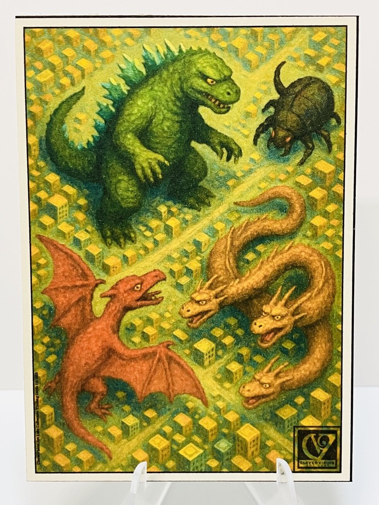 Clever Monsters Series One Official Description (Base Cards) Clever Monsters: Series One Parody Baseball Art Card Collection Standard Size (2.5" x 3.5") | Printed on Proprietary Matte Art Card Stock This collectible art card is part of Clever Monsters: Series One , a limited-edition parody series reimagining legendary sports figures with absurdist monsters, lowbrow humor, and gallery-quality design. Each card is composed using a proprietary art process developed over years by Mr. Clever Art, whose work has been featured at Art Basel (3x) , SCOPE Miami , and numerous international exhibitions and galleries. These are not sports memorabilia cards and do not claim any affiliation with any teams, players, leagues, movie or t.v. characters or licensing entities. Each piece is a fully original parody work of art , protected under artistic expression and satire. The collection merges vintage trading card aesthetics with mutant absurdity, creating a new genre of collectible cards: luxury parody cards for surreal art fans . Each card is released in small quantities only and hand-trimmed by the artist for maximum control and quality. Standard Size : 2.5 x 3.5 inches Finish : Proprietary Matte Luxury Edition : Limited run (un-numbered or numbered, depending on listing) Packaging : Archival sleeve & Top Loader Brand : CleverVision Art Labs Collect the full 36-card Series One drop and build your monster league. Parody & Legal Protection Statement: This card is a work of parody and satire protected by U.S. copyright law under the Fair Use Doctrine : • Title 17, U.S. Code §107 – Limitations on exclusive rights: Fair Use • Campbell v. Acuff-Rose Music, Inc., 510 U.S. 569 (1994) – U.S. Supreme Court ruling that protects parody as a legitimate artistic use • Mattel Inc. v. Walking Mountain Prods., 353 F.3d 792 (9th Cir. 2003) – Affirms the right of artists to create parody works using commercial imagery This product is not affiliated with, endorsed by, or licensed by any athlete, league, brand, or team. All names, uniforms, and likenesses are transformed for the purpose of humor, commentary, and original creative expression.