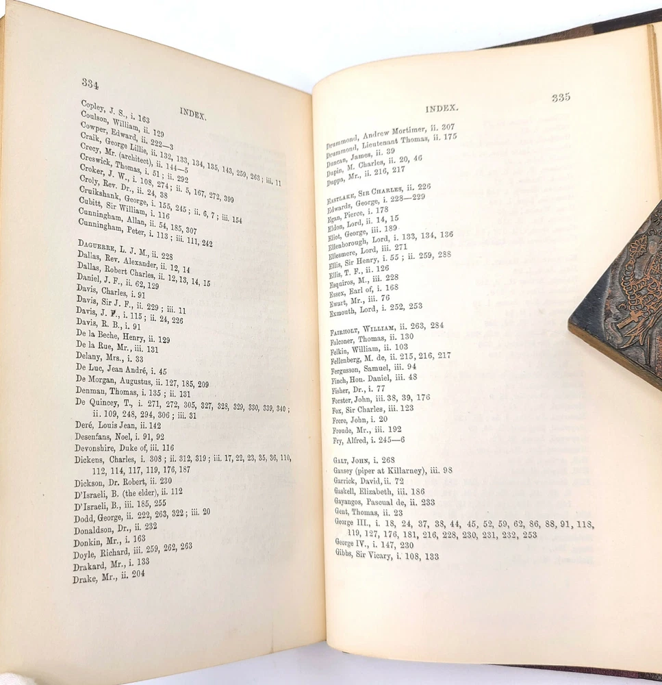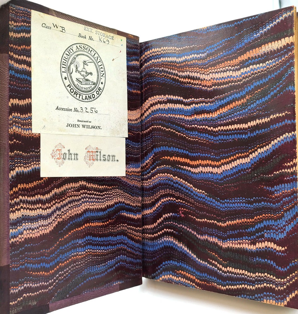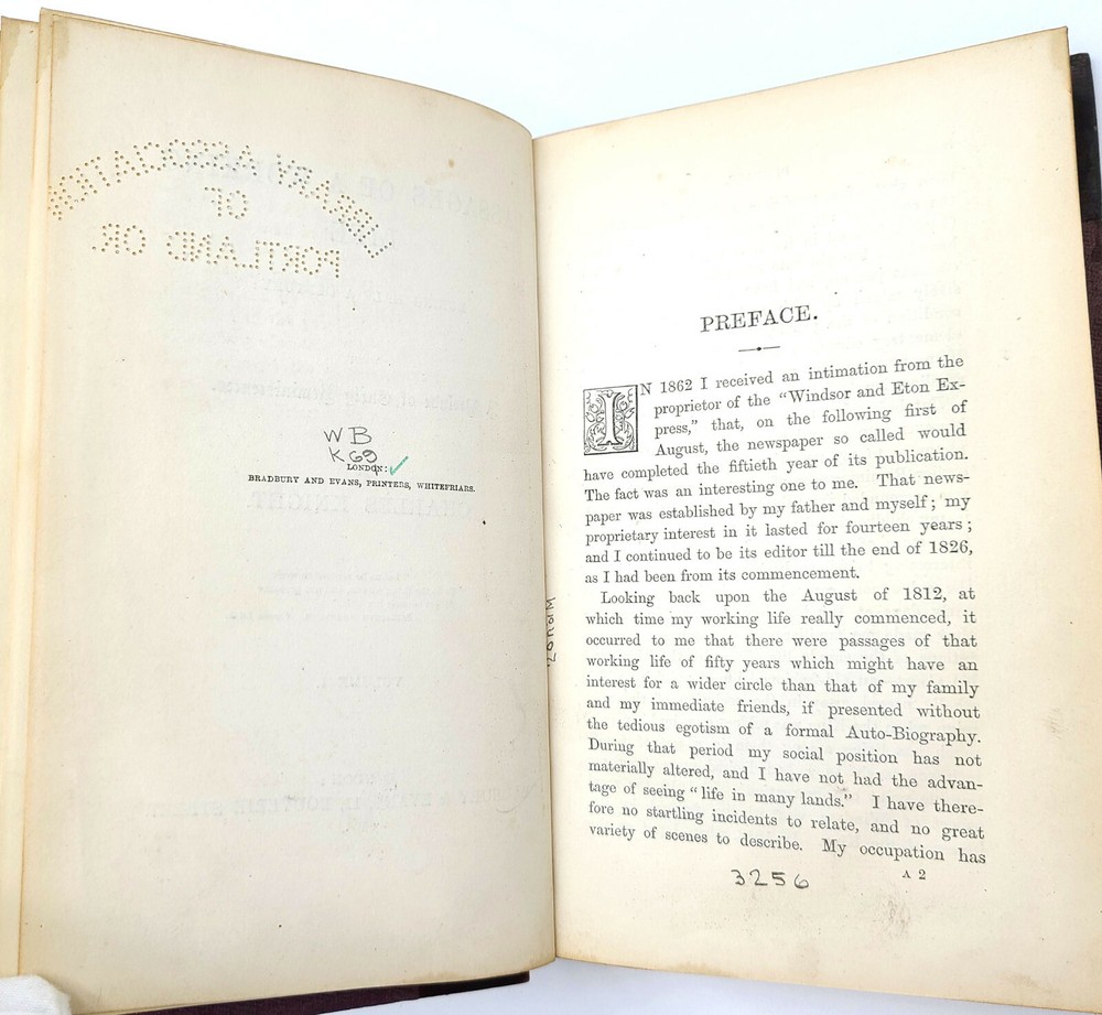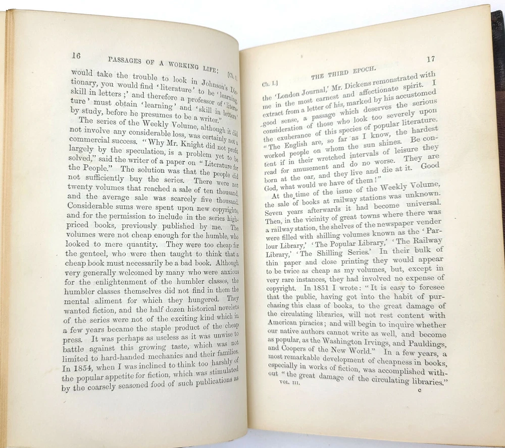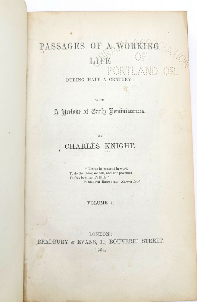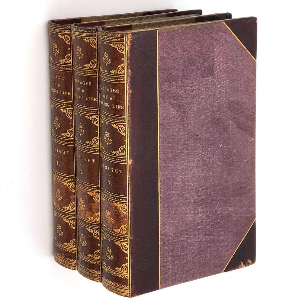 Description Title: Passages of a Working Life during half a century: with A Prelude of Early Reminiscences [3 Volumes] Author: Charles Knight Description: Ex-library, non-circulating collection. Half-leather with plum-colored cloth sides (gilt rules). Spine with raised bands, gilt tooled compartments. Top edge gilt. Some wear and corners, extremities; front covers have a bit of discoloration. Spine compartments that formerly had call numbers are slightly brighter. Marbled endpapers. Bookplates on front pastedowns; no pockets. Each volume has a pinhole library stamp on title page and one additional page. 8vo. V.1: xi, [6], (18)-346. V.II: [3], (4)-336. V.III: [3], (4)-344. 7.5 x 4.75 inches. The first two volumes were published in 1864 and Volume III in 1865. Volume III includes a fourteen-page index of names of the contemporaries of the author receiving mention, including personal encounters with Charles Dickens and George III. From the collection of John Wilson (c. 1826-1900), pioneer merchant and book collector of Portland, Oregon. The eight-thousand volume collection, considered one of the finest on the west coast, was bequeathed to the Portland public library in 1900. Autobiography of Charles Knight (1791-1873), an English publisher, editor, writer, and Shakespeare scholar. He was the author of several books, including The Old Printer and the Modern Press (1854) and Shadows of Old Booksellers (1865), and was the founder and publisher of The Penny Magazine. Binding: Hardcover Condition: Good Jacket Condition: None Publisher: Bradbury & Evans Place: London Year: 1864 Keywords: autobiography, England, history, publishing, English publishers, Penny Magazine, Shipping We ship all items within one business day. Domestic orders are shipped via USPS Media Mail. Other shipping options are available to meet your needs.