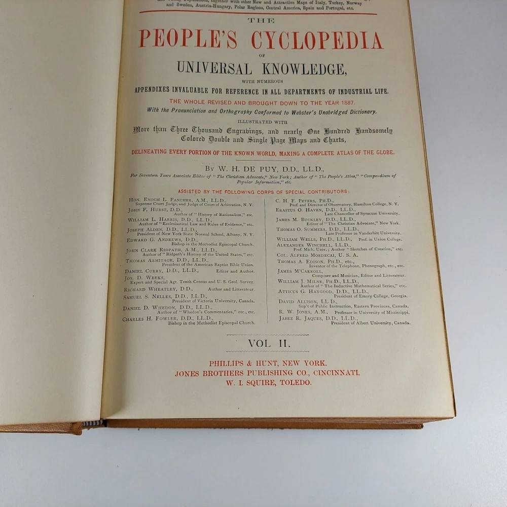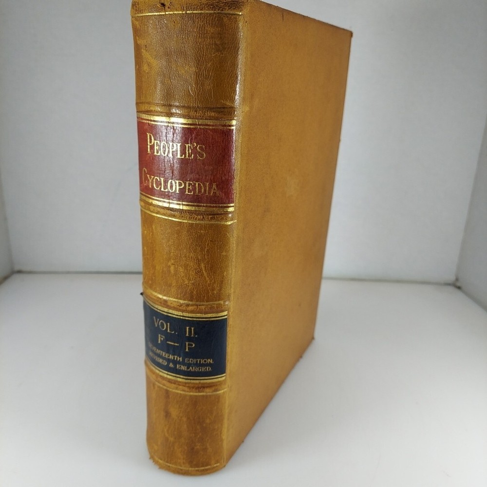 People's Cyclopedia of Universal Knowledge Vol 2 F-P 17th Edition Revised and Enlarged 1887 Illustrated HC. Leather has some wear, pages very lightly tanned but in remarkable condition considering the age. Shipped with USPS Media Mail in a box.