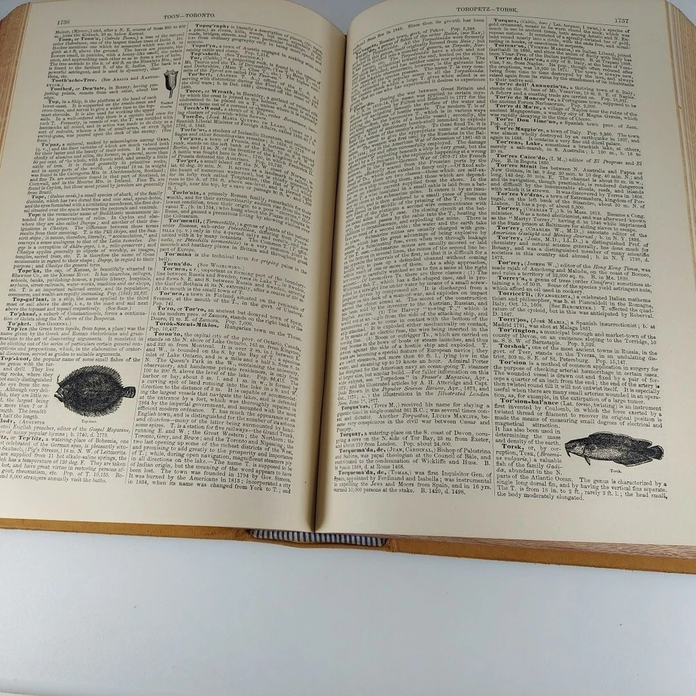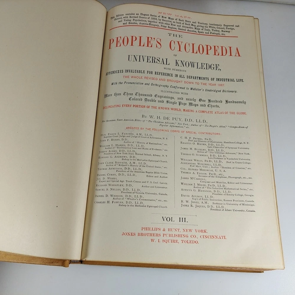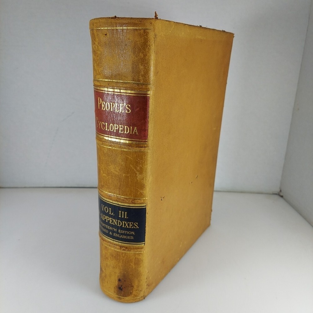 People's Cyclopedia of Universal Knowledge Vol 3 P - Appendixes 17th Edition Revised and Enlarged 1887 Illustrated HC. Leather has some wear, pages very lightly tanned but in remarkable condition considering the age. Shipped with USPS Media Mail in a box.