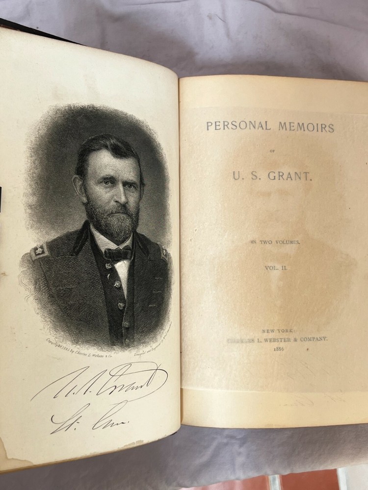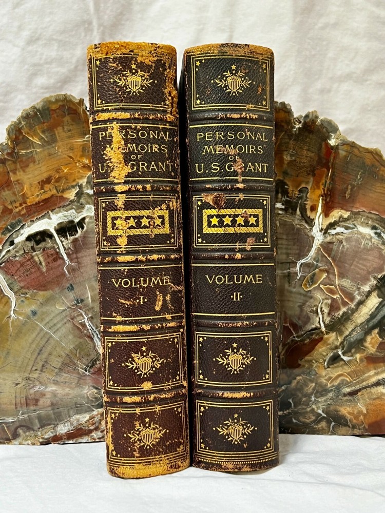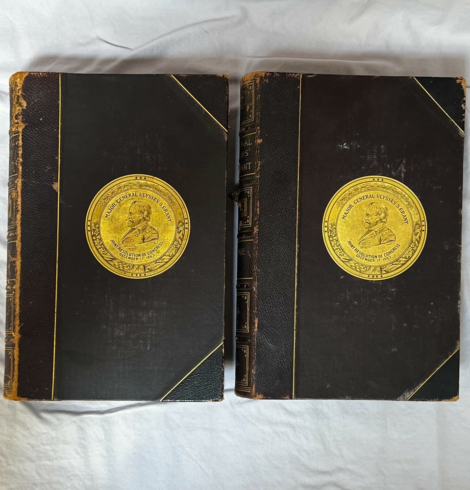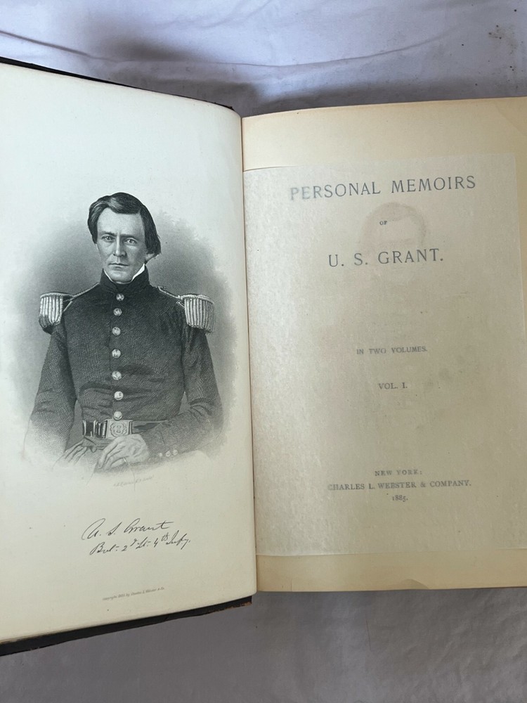 Personal Memoirs of U.S. Grant Volume I and II First Edition 1885 J.J. Little & Co press. Leather Hardbound cover with gold seals. Some damage and staining to back cover Volume II shown in pictures. Pages in excellent condition with no foxing or tears and tissue guard intact. Sold As Is and as a set.