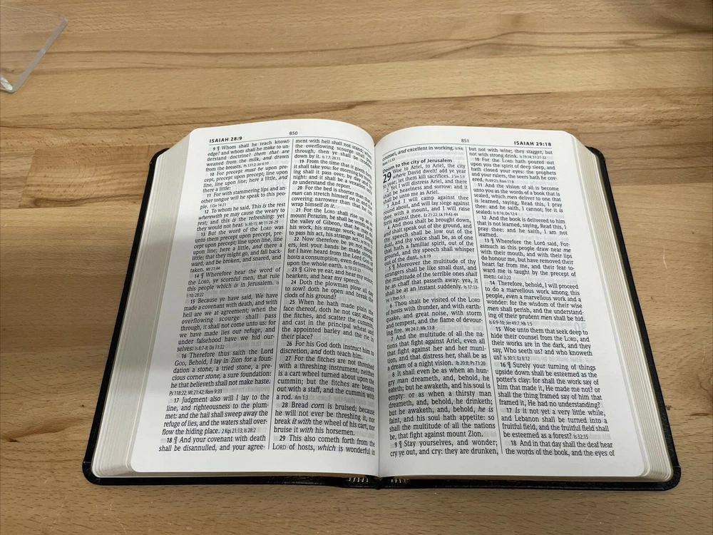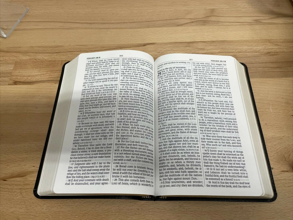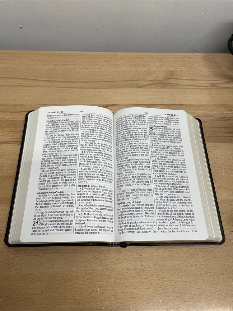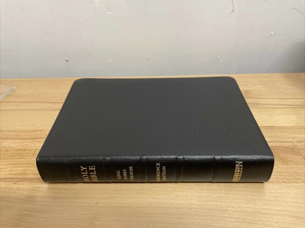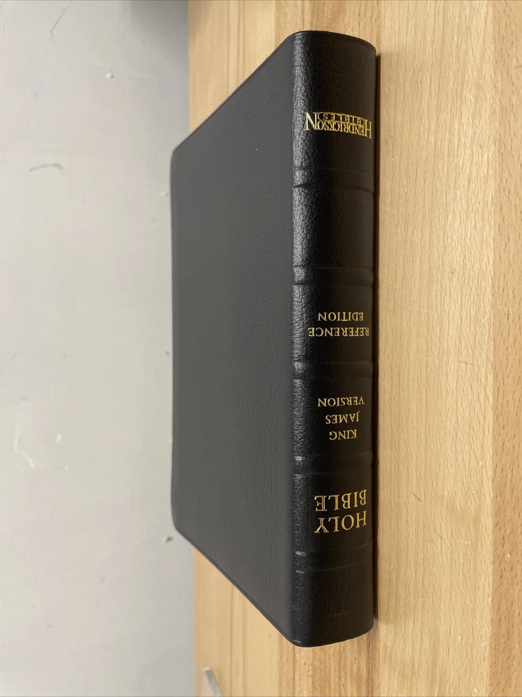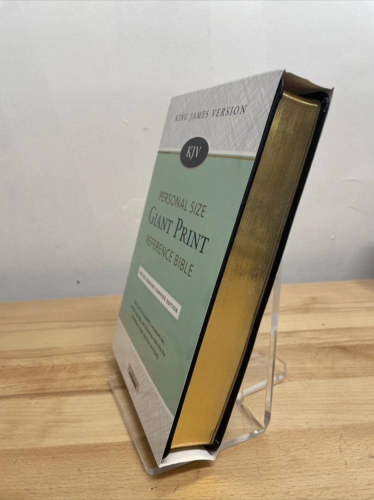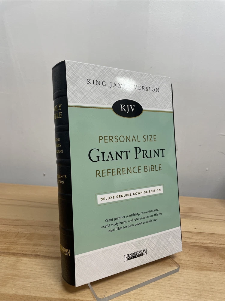 Personal Size Giant Print Reference Bible by Hendrickson Hendrickson Bibles.... The newest addition to the best-selling KJV Personal Size Giant Print Reference Bible line, this deluxe genuine cowhide edition is a high-end option, with many helpful features that you're sure to benefit from. Enhanced by a strong collection of reference helps, this popular Bible comes in a handy size and large type that is easy on the eyes. Features include: Genuine cowhide leather Words of Christ in Red End of verse cross references Concordance Miracles & Parables of the Old & New Testaments Harmony of the Gospels Presentation Page Full Color Maps Foil stamping Two ribbon markers Faux hubs on the spine High quality paper 11.25 point text size Dimensions: 8.75 X 6.00 X 1.50 (inches) KING JAMES VERSION