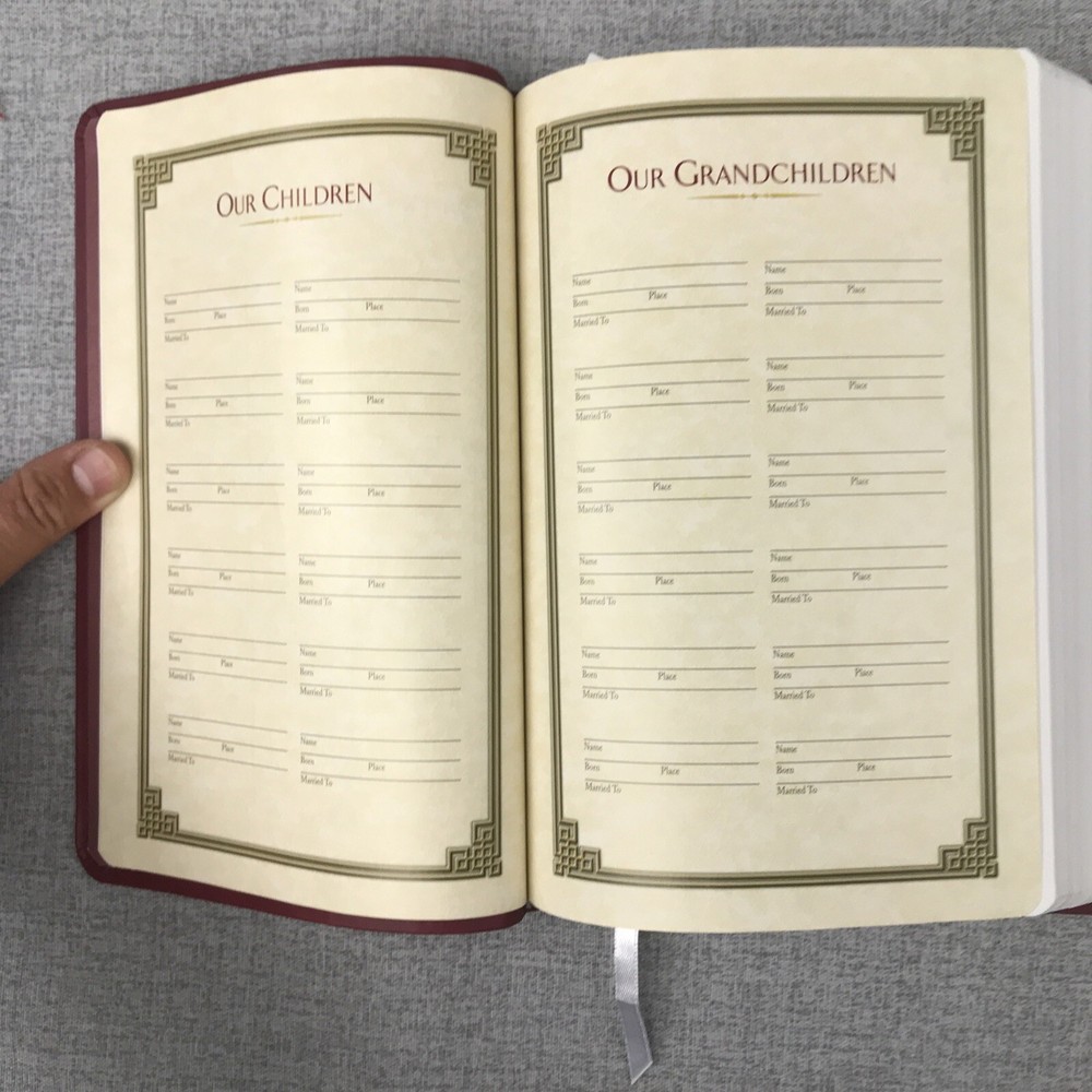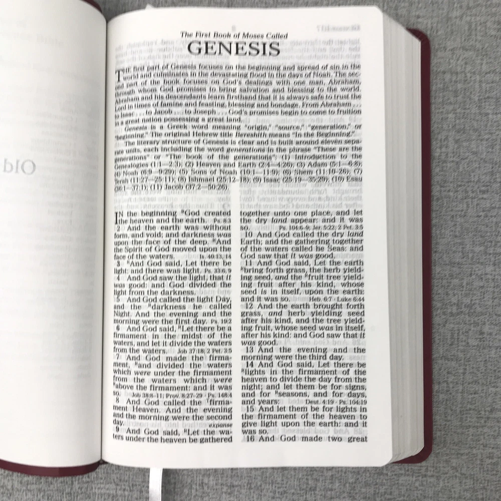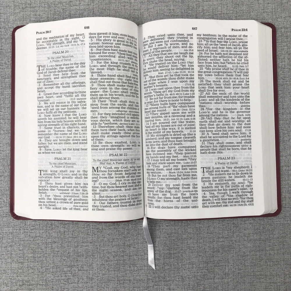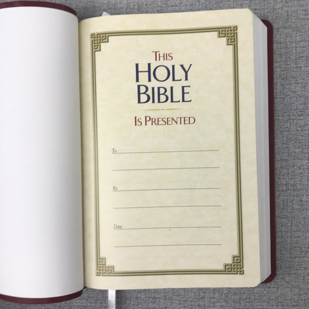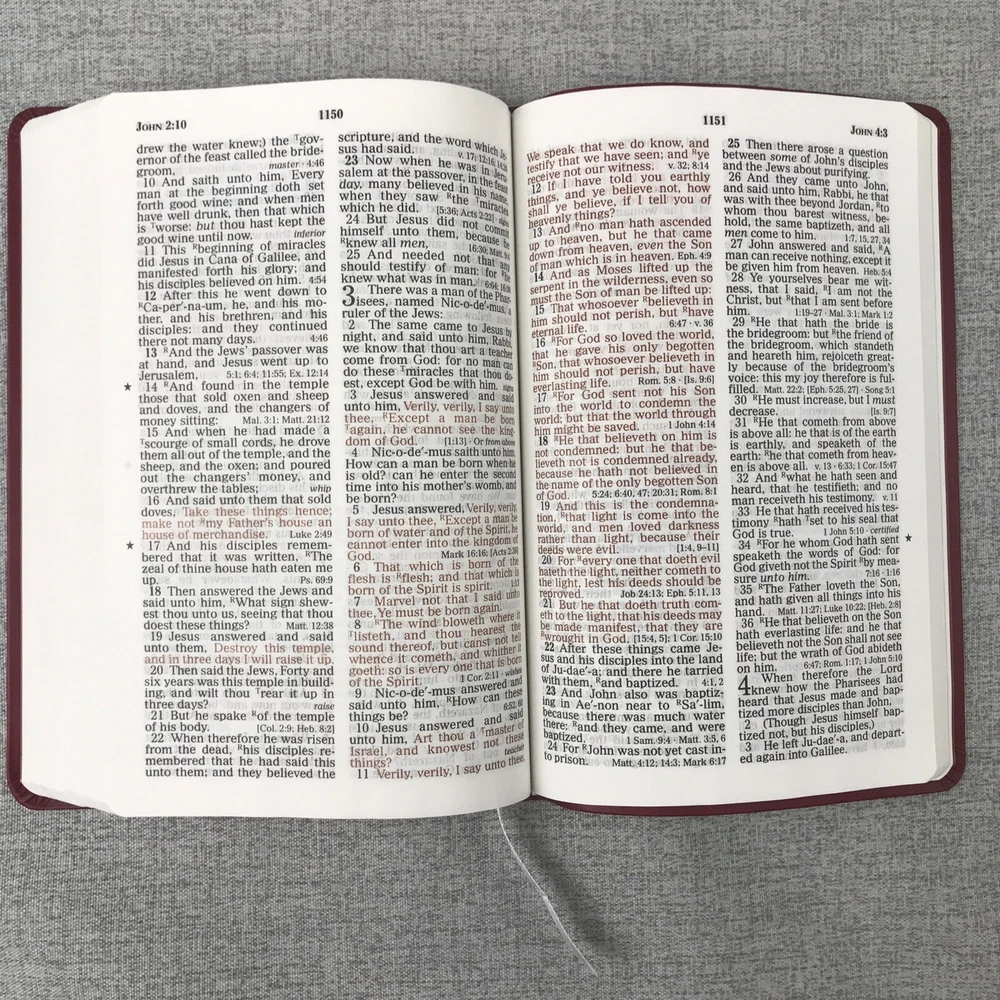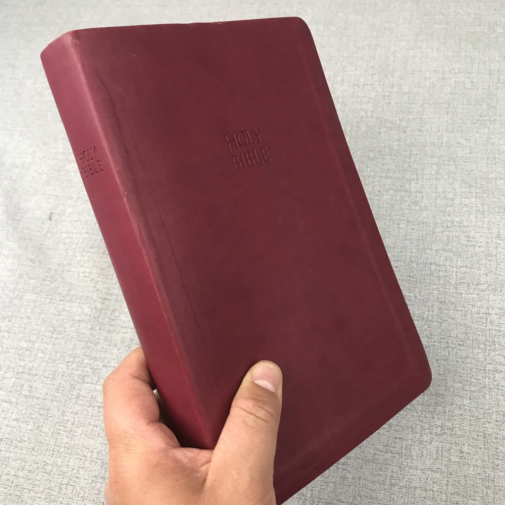 KJV Personal Size Giant Print Reference Bible Thomas Nelson Burgundy Leathersoft Dimensions: 8 3/4" x 6" x 1 1/4" Words of Christ are in red. Has a beautiful white satin ribbon marker. Includes a concordance and color maps in the back of the Bible. Covers have some minor signs of wear from age and use. Presentation page is clean / unmarked. Binding is very good. Pages are tight and clean.