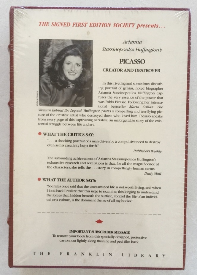 Picasso Arianna Stassinopoulos Huffington Published by The Franklin Library, 1988 Description: First Edition; First Printing. Limited Edition. Signed by renowned author Arianna Stassinopoulos Huffington. New, still in original shrink wrap. Accented in 22kt gold, printed on archival paper with gilded edges, smyth sewing & concealed muslin joints. Bound In full leather with hubbed spines. Pristine. This New Signed Limited Edition book is a beautiful collectible copy. Bibliographic Details Title: Picasso Publisher: The Franklin Library Publication Date: 1988 Binding: Hardcover Book Condition: New Dust Jacket Condition: No Jacket Signed: Signed by Author(s) Edition: Limited Edition