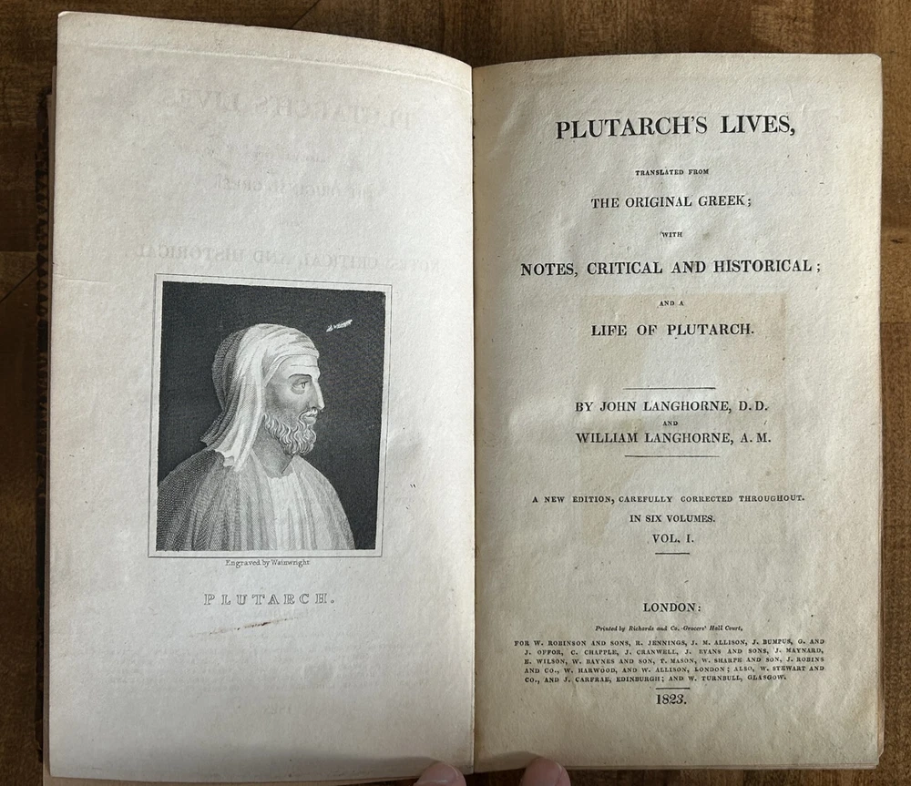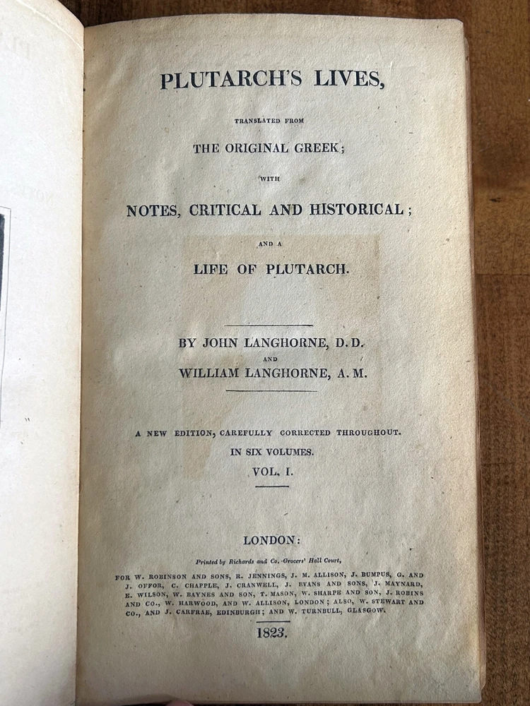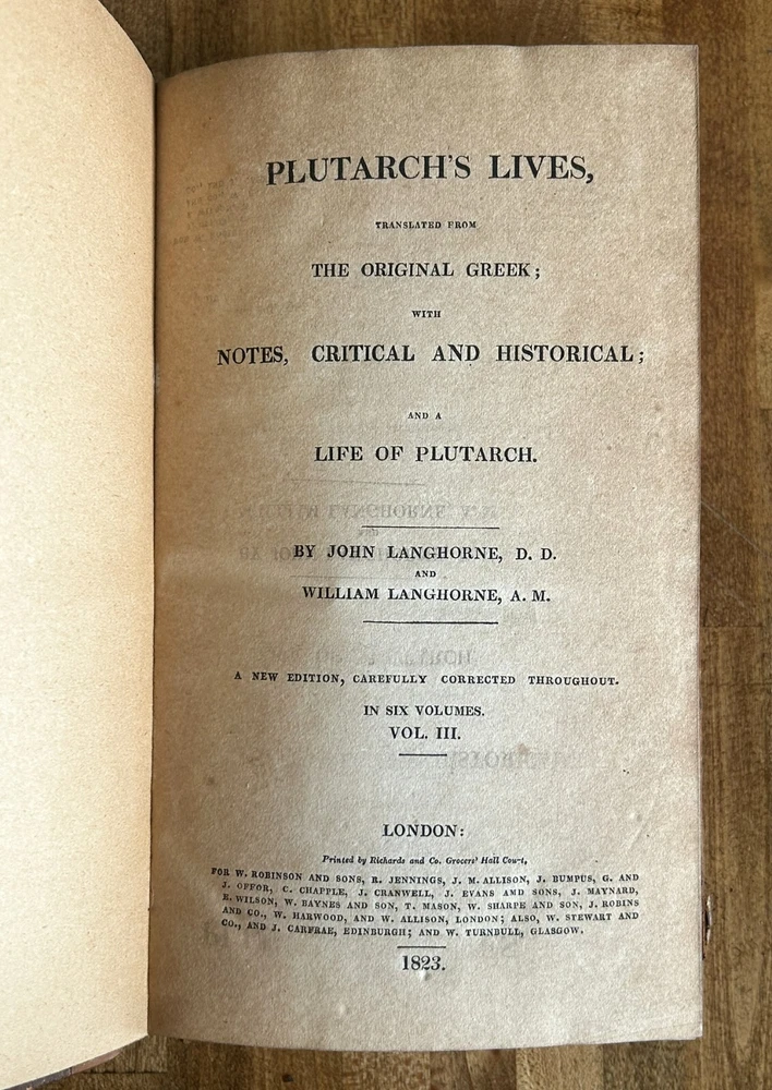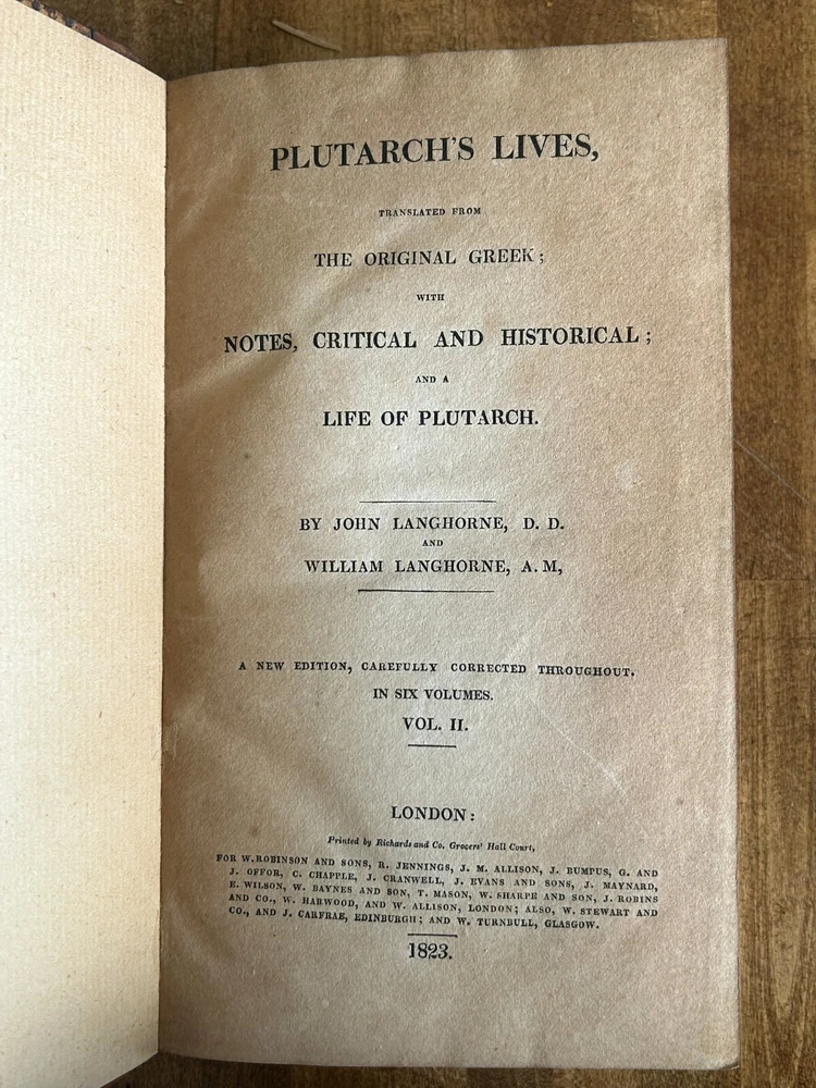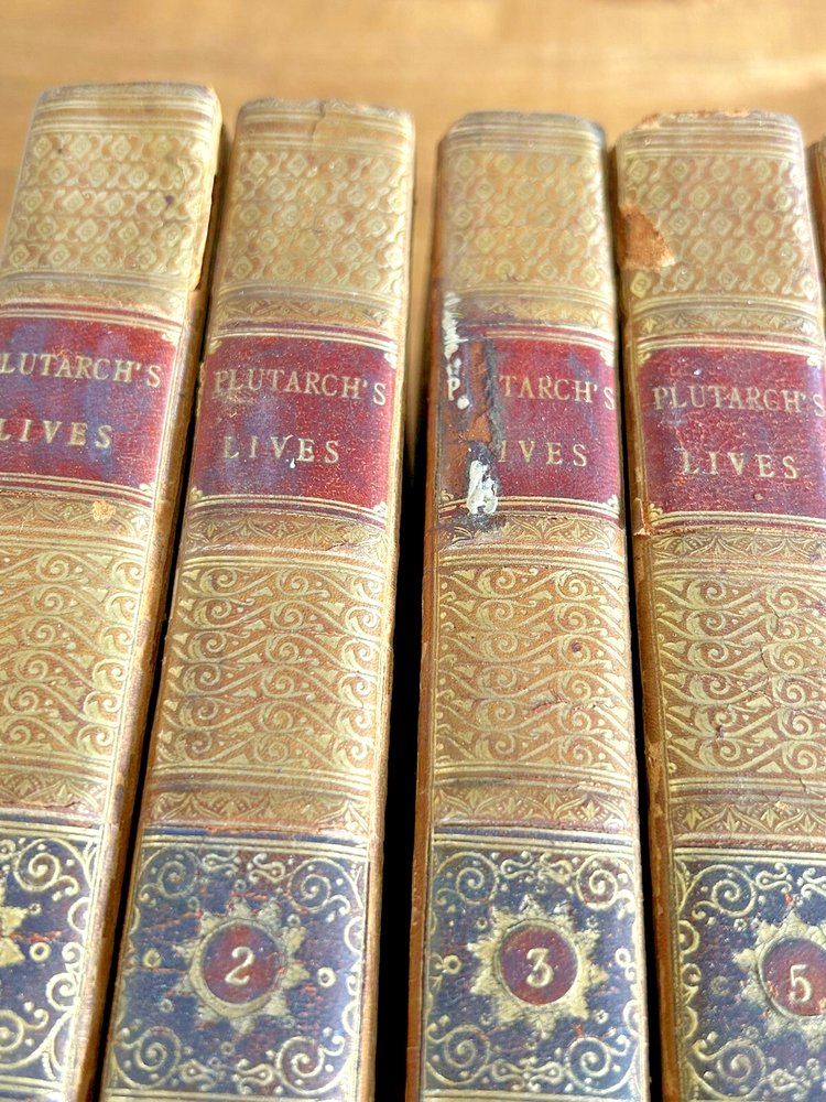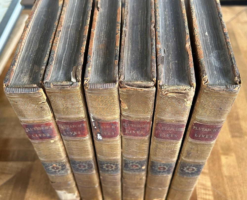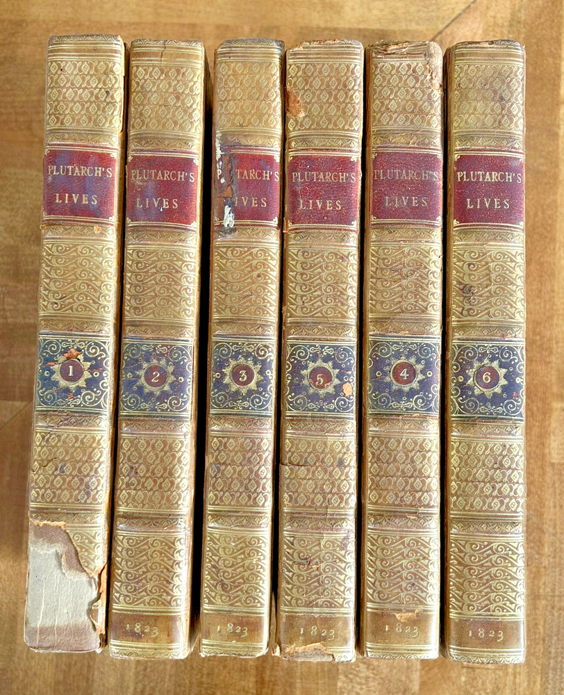 Complete 6 volume set of Plutarch's Lives, Translated from the Original Greek with Notes, Critical and Historical and a Life of Plutarch. By John and William Langhorne. "A new edition, carefully corrected throughout," published 1823. Attractive gold gilt spines and diamond printed leather covers. Bottom of Vol. 1 spine missing. Mild chipping/damage to other volumes' spines. Leather drying and cracking in places. Worn corners and edges. Some minor scuffing and/or discoloration of covers. Bookplate of John Wilson on pastedown. Volume 1 interior hinge split (bottom half) and one page of TOC detached. Other volumes have intact hinges and solid bindings. First page of text of each volume has a private ex libris stamp. Some browning of pages (mostly title pages), very limited foxing. See photos and ask any questions you might have.