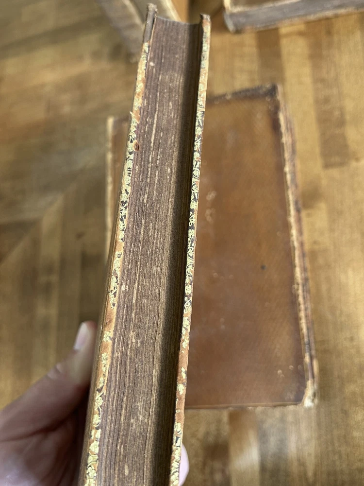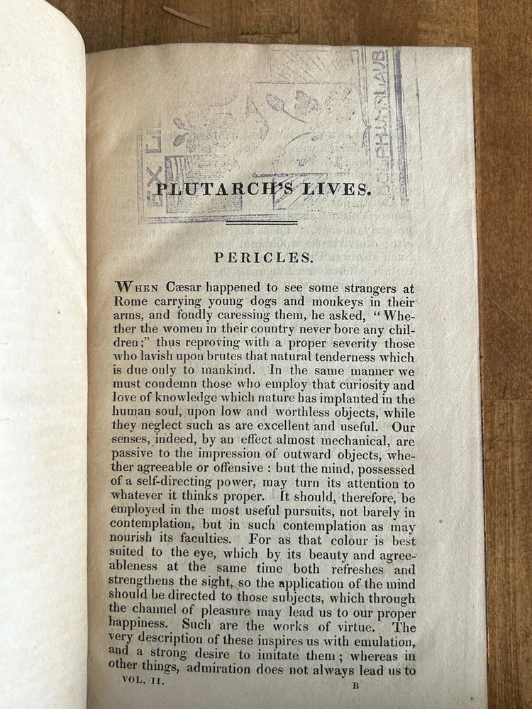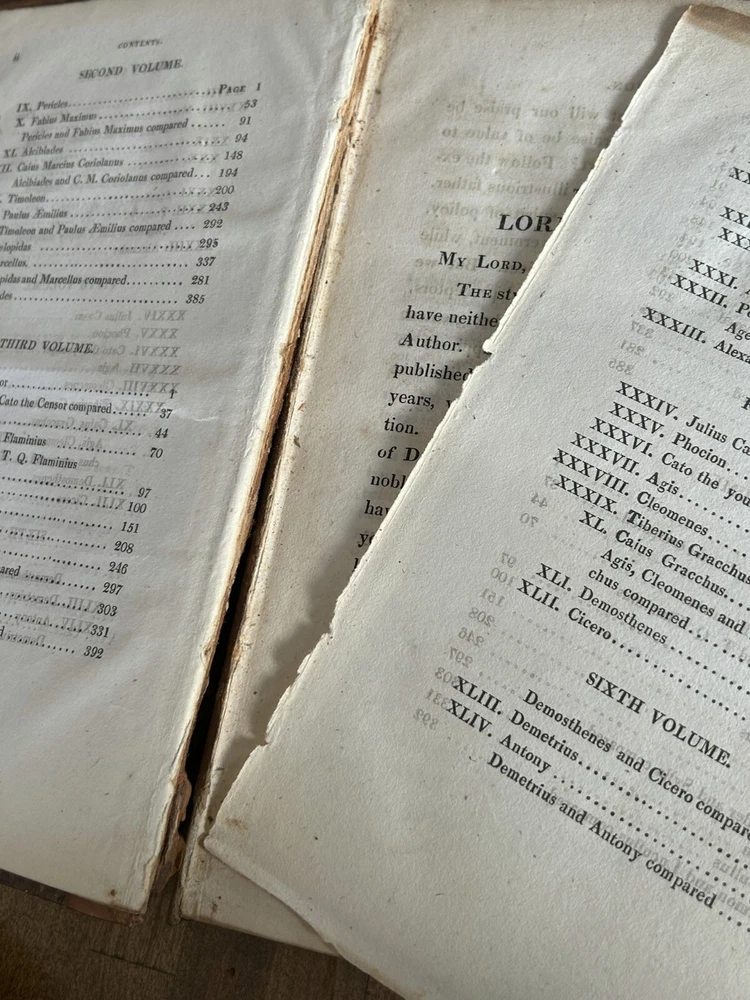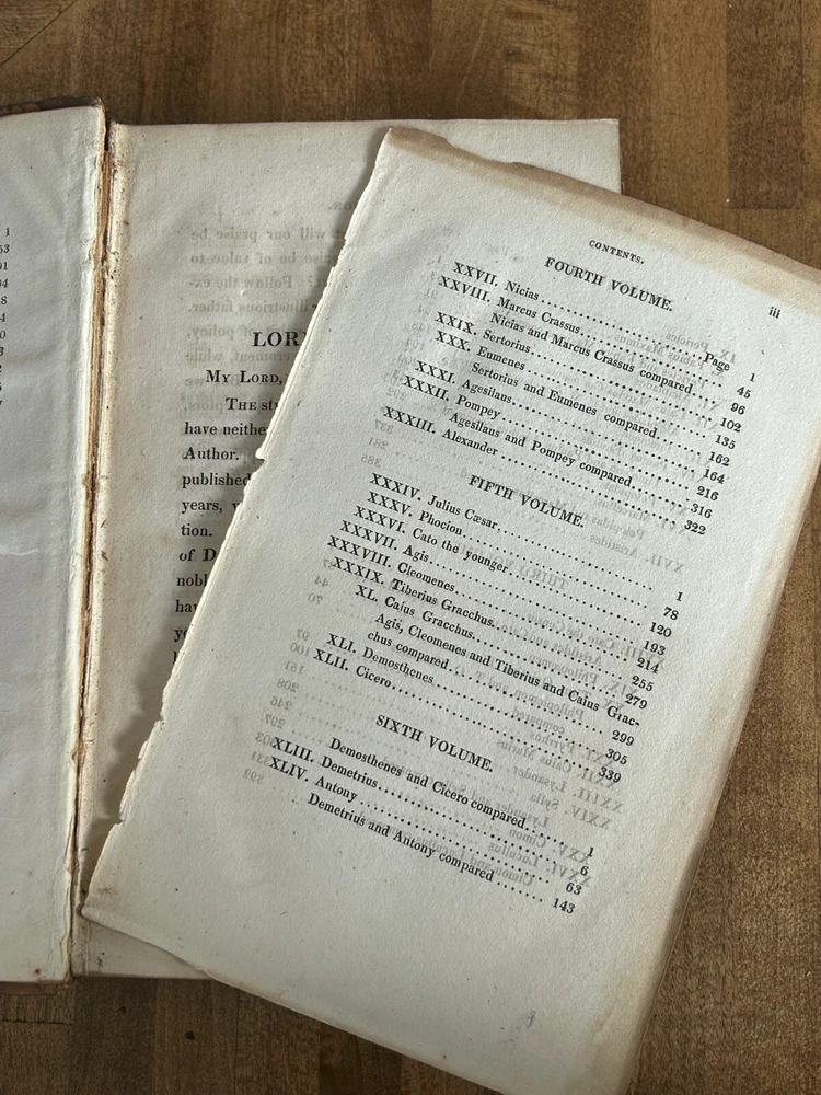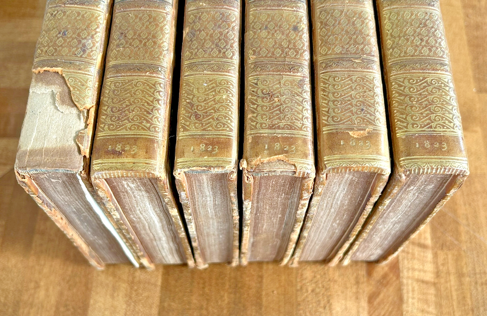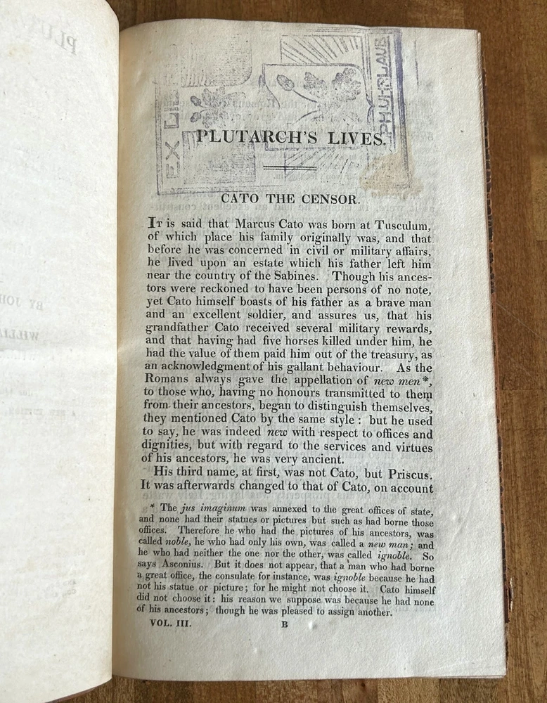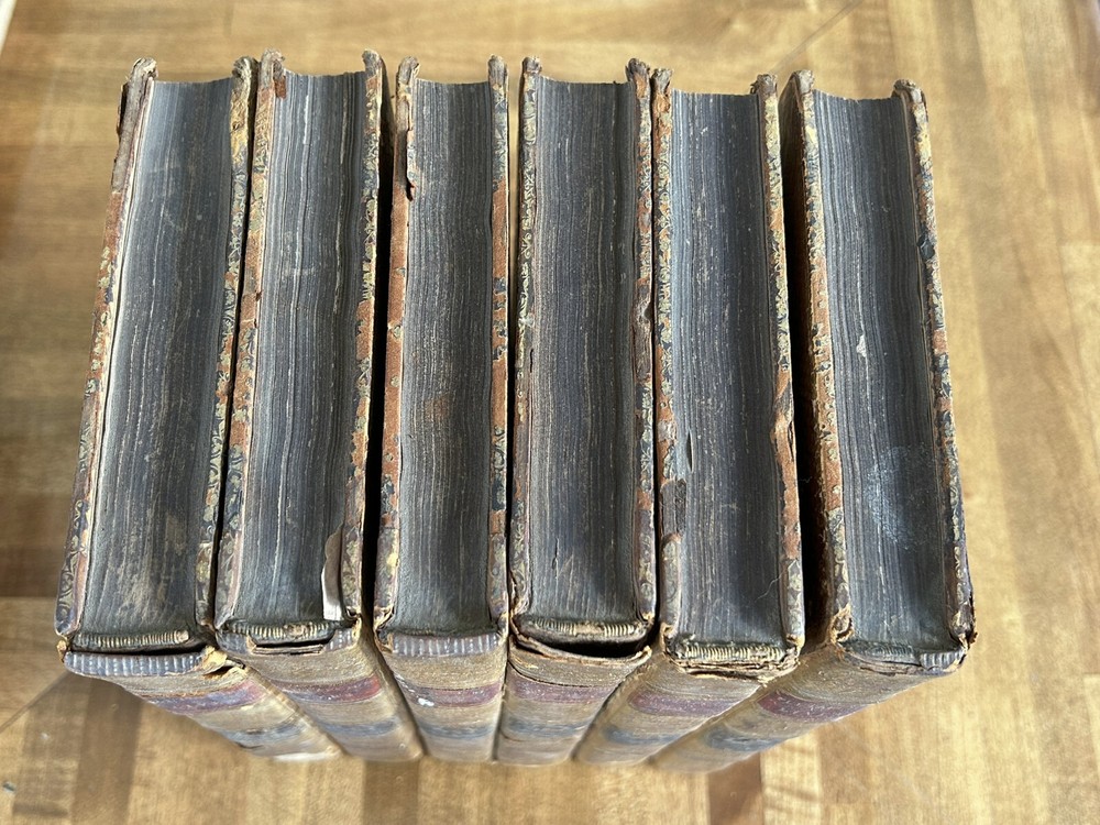 Complete 6 volume set of Plutarch's Lives, Translated from the Original Greek with Notes, Critical and Historical and a Life of Plutarch. By John and William Langhorne. "A new edition, carefully corrected throughout," published 1823. Attractive gold gilt spines and diamond printed leather covers. Bottom of Vol. 1 spine missing. Mild chipping/damage to other volumes' spines. Leather drying and cracking in places. Worn corners and edges. Some minor scuffing and/or discoloration of covers. Bookplate of John Wilson on pastedown. Volume 1 interior hinge split (bottom half) and one page of TOC detached. Other volumes have intact hinges and solid bindings. First page of text of each volume has a private ex libris stamp. Some browning of pages (mostly title pages), very limited foxing. See photos and ask any questions you might have.