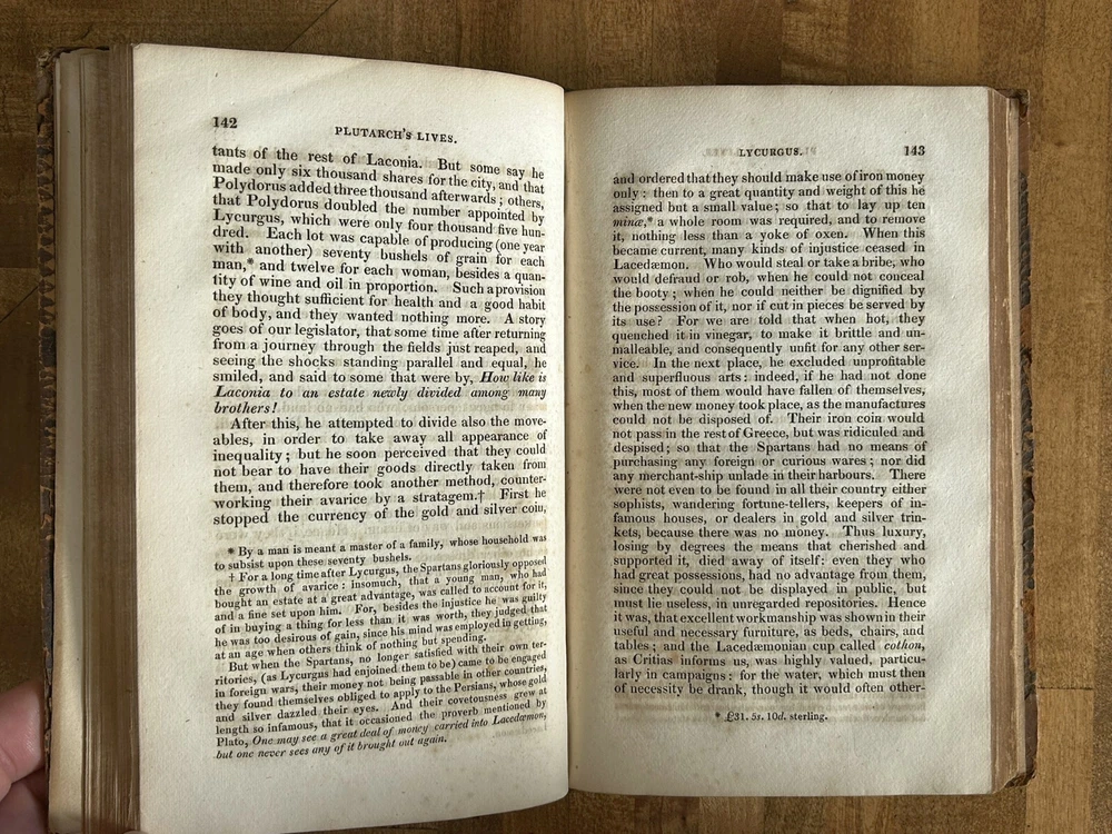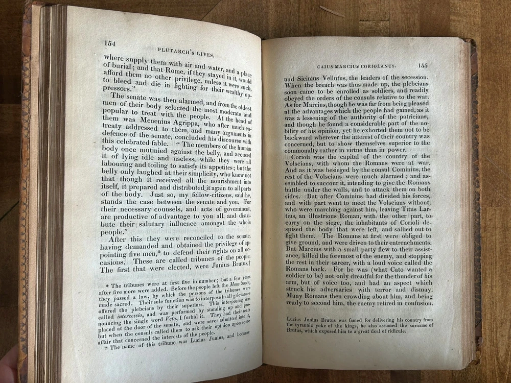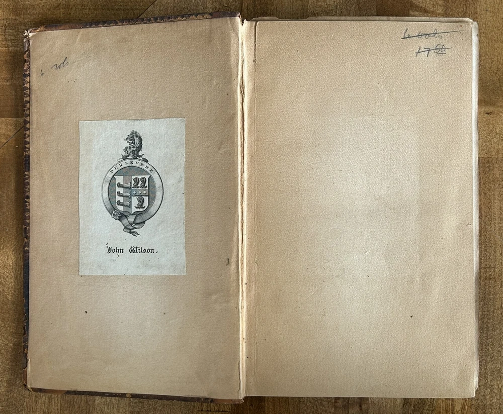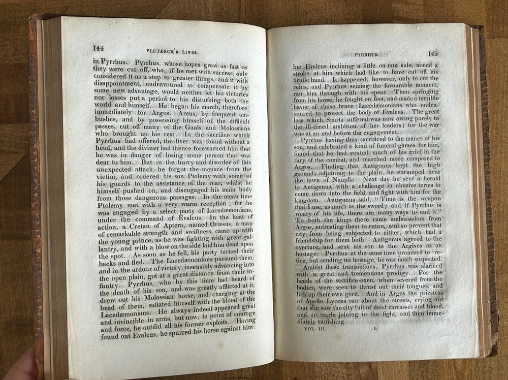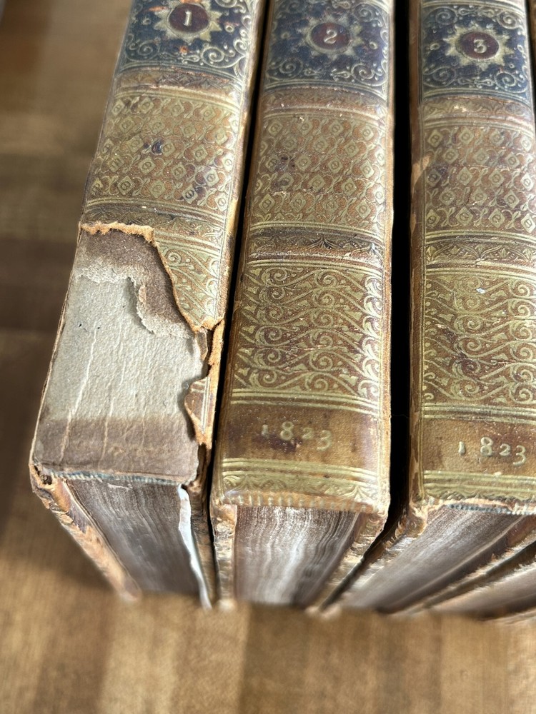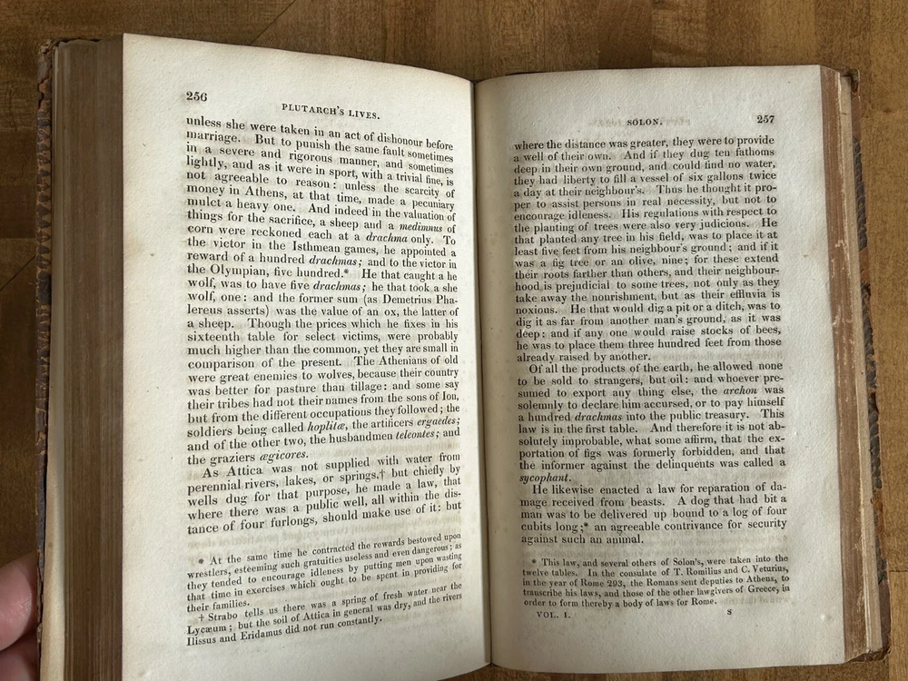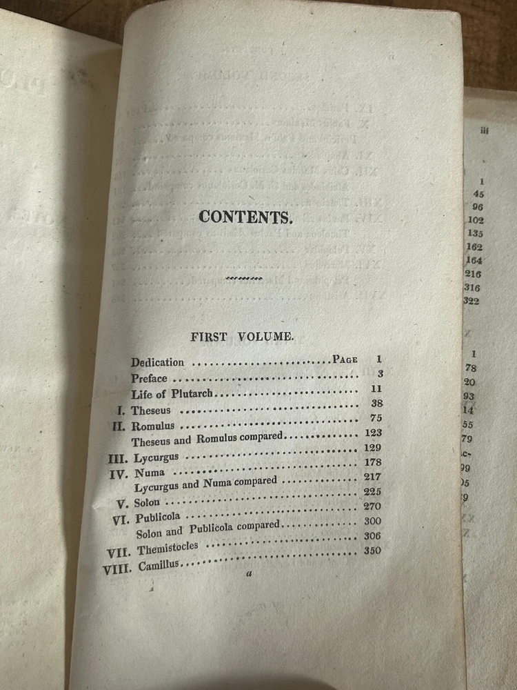 Complete 6 volume set of Plutarch's Lives, Translated from the Original Greek with Notes, Critical and Historical and a Life of Plutarch. By John and William Langhorne. "A new edition, carefully corrected throughout," published 1823. Attractive gold gilt spines and diamond printed leather covers. Bottom of Vol. 1 spine missing. Mild chipping/damage to other volumes' spines. Leather drying and cracking in places. Worn corners and edges. Some minor scuffing and/or discoloration of covers. Bookplate of John Wilson on pastedown. Volume 1 interior hinge split (bottom half) and one page of TOC detached. Other volumes have intact hinges and solid bindings. First page of text of each volume has a private ex libris stamp. Some browning of pages (mostly title pages), very limited foxing. See photos and ask any questions you might have.