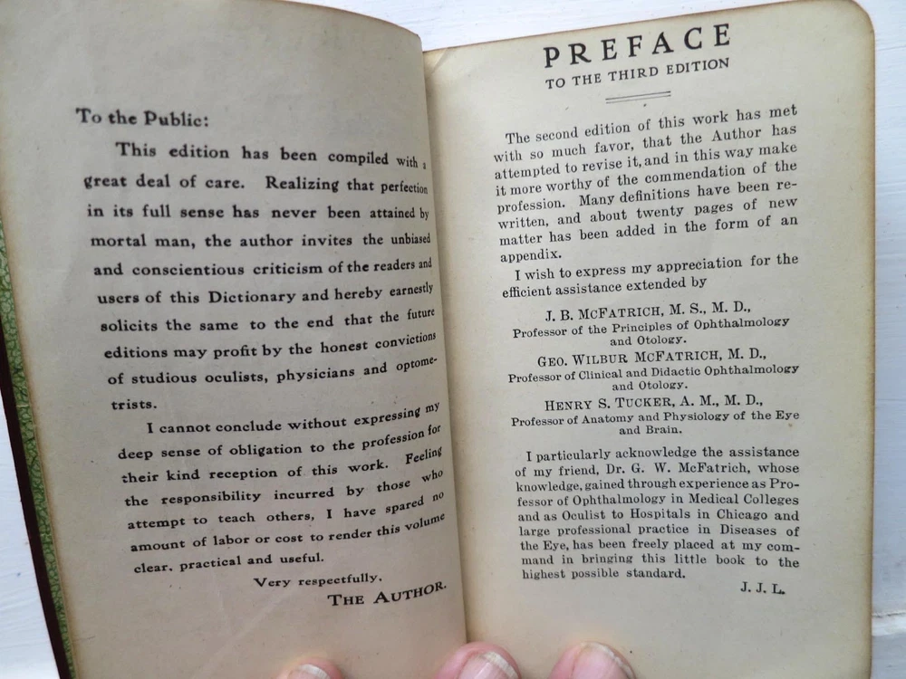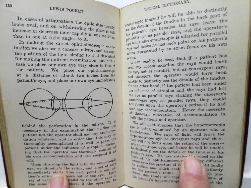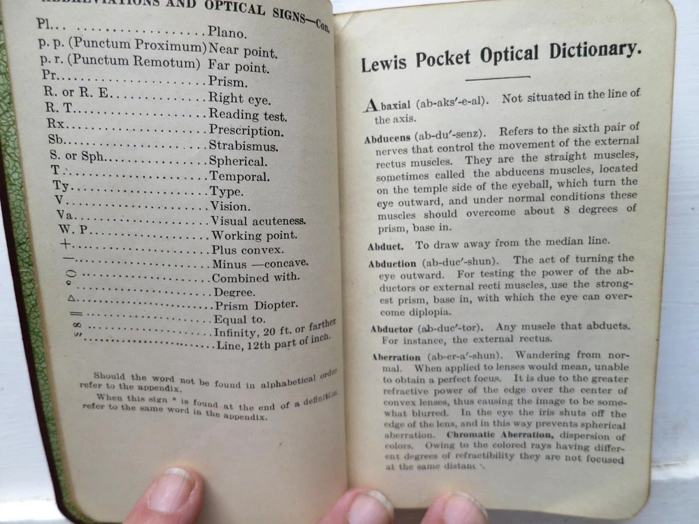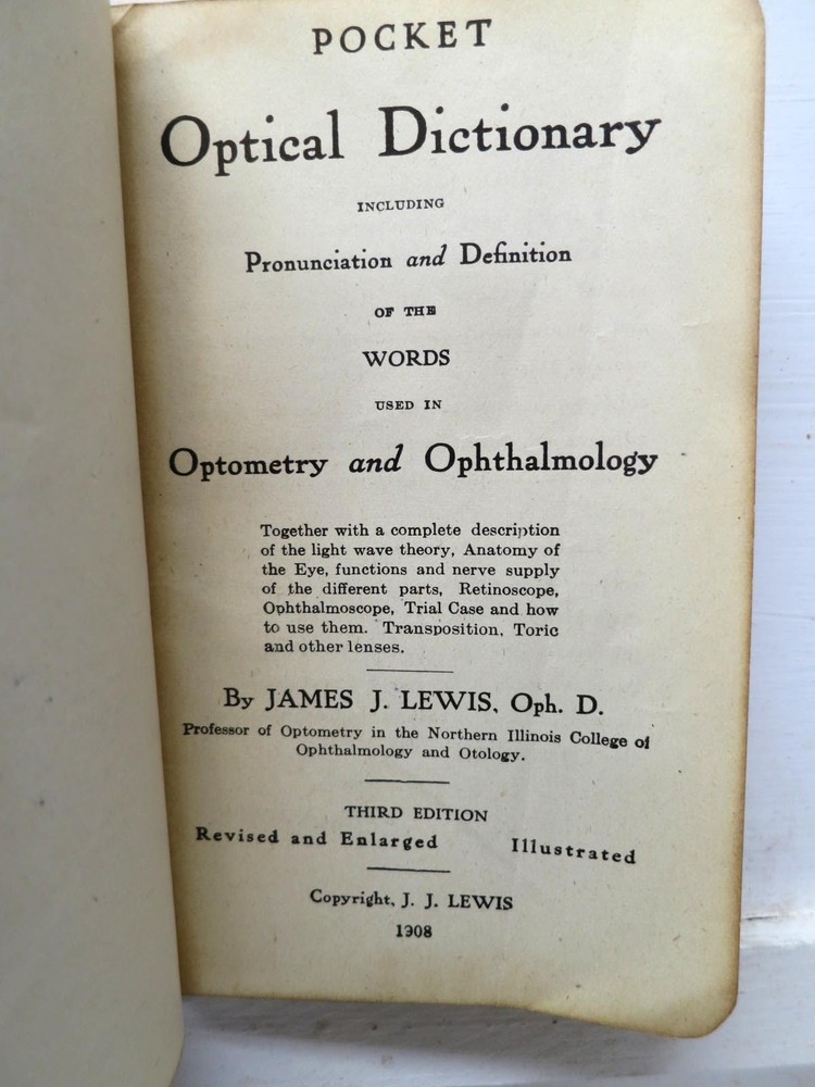 Pocket Optical Dictionary and Encyclopedia, 3rd ed., 1909 - leather Good+ or better Condition for this vintage leather-bound book. Cover looks very good except for spine ends...the top shows signs of repair, and the bottom shows wear (not repaired). Otherwise, cover just shows mellow aging. Hinges/binding are tight/strong. Owner name inside front. Very mild ivory age-tanning visible on some pages, but paper is not brittle. Interior is clean...no tears, folds, stains, marks, or foxing found. Strawberry Acres, G Richmond, 1911, A L Burt - 1st edition (assumed) Good Condition for this vintage 1st edition (assumed). Cover shows general aging/fading and spine crinkle, plus clear signs of repair to spine ends, plus antique-style metal corners which will extend the book's life. Hinges/binding are tight/strong, due to hinge repair visible front and back. No owner name inside. Very light ivory cream age-tanning inside boards and visible on some pages...not unattractive. Interior is clean...no tears, folds, stains, marks, or foxing. No DJ. The book is now strong and usable without special care needed. Collectible.