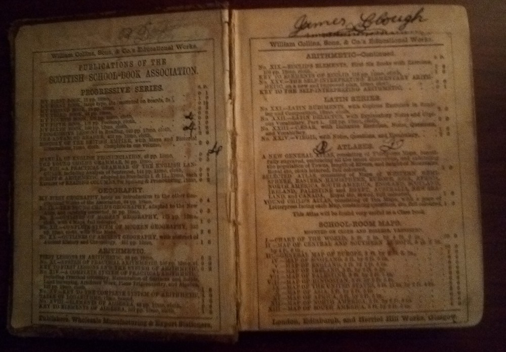 leather covers heavily worn (see images); no missing pages but heavily foxed pages with previous owner's name inked on FFEP; exposed front and rear interior hinges; missing outer leather backstrip...