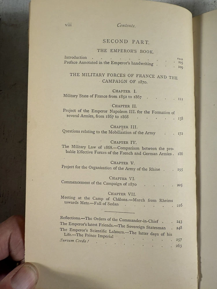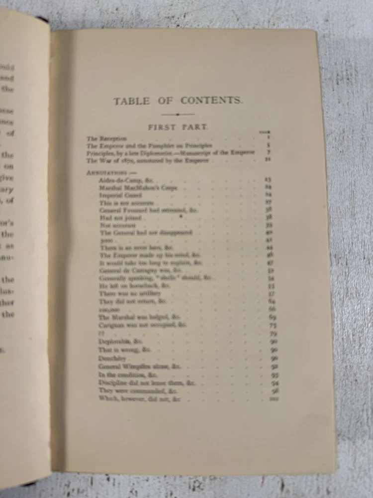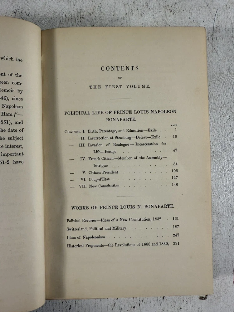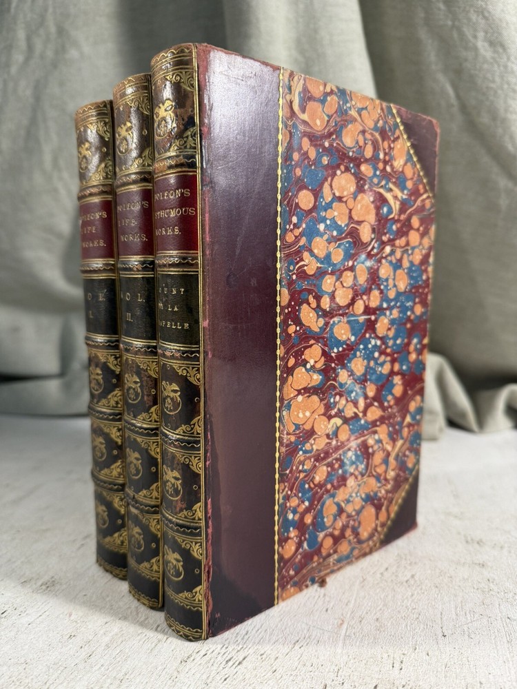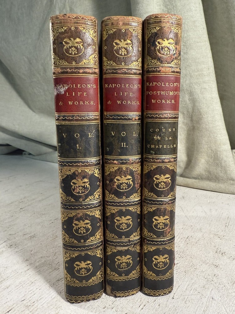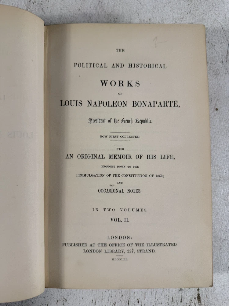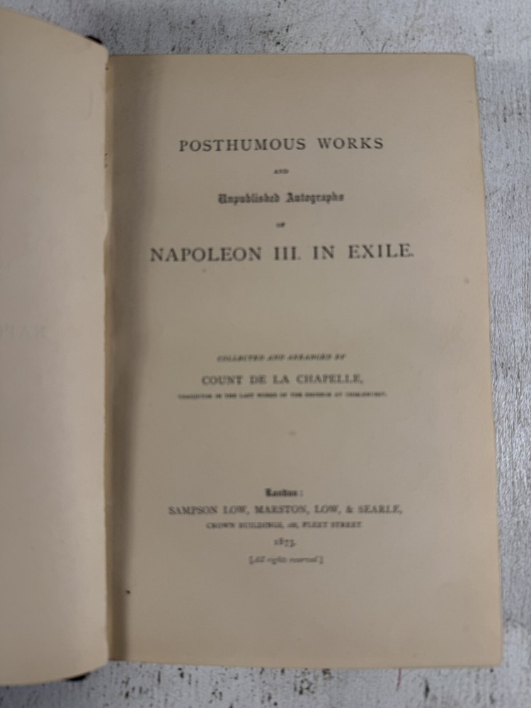 The Political and Historical Works of Louis Napoleon Bonaparte, President of the French Republic with an Original Memoir of His Life, Brought down to the Constitution of 1852 & Posthumous Works and Unpublished Autographs by Bonaparte, Louis Napoleon (Napoleon III) (458-G ) Condition: Moderate wear to extremities else very good condition. Small water stain to bottom of spine / adjacent boards. Small dime size piece of leather missing on vol. II front board. Hinges bindings all tight and sound. See photos for complete description and condition. Publisher: Illustrated London Library / Sampson Low, Marston, Low & Searle Publication Date: 1873 Physical: 3 vols Size (inches): 8 3/4 x 6 Binding: Brown 3/4 leather with marble boards and marbled end sheets. Gilt titles and decorations on spine. Top page edges gilt. A really lovely copy. Language: English I ship next business day. Satisfaction guaranteed. Check out more books and stuff here at my Ebay store: https://www.ebay.com/str/ingeneral?_trksid=p2047675.l2563 Thanks for looking