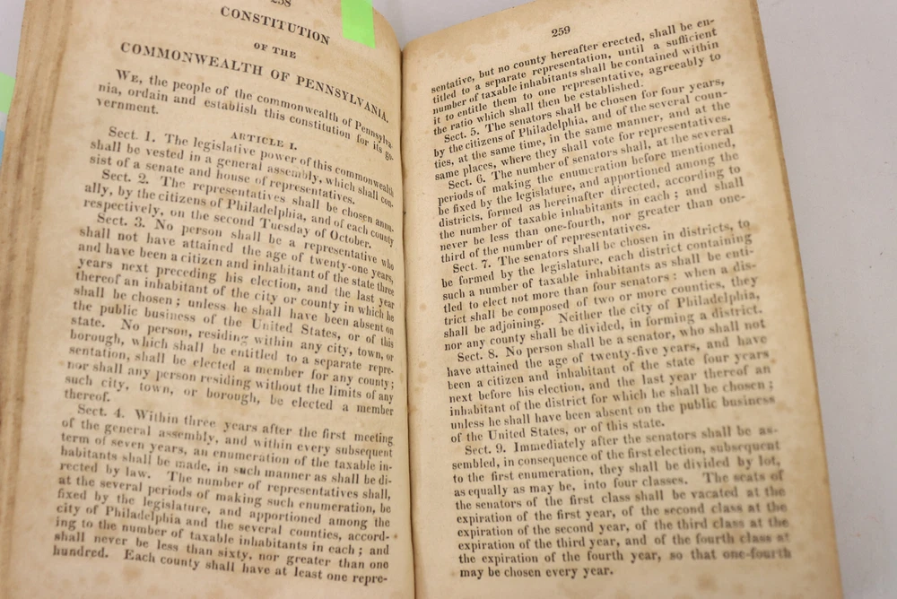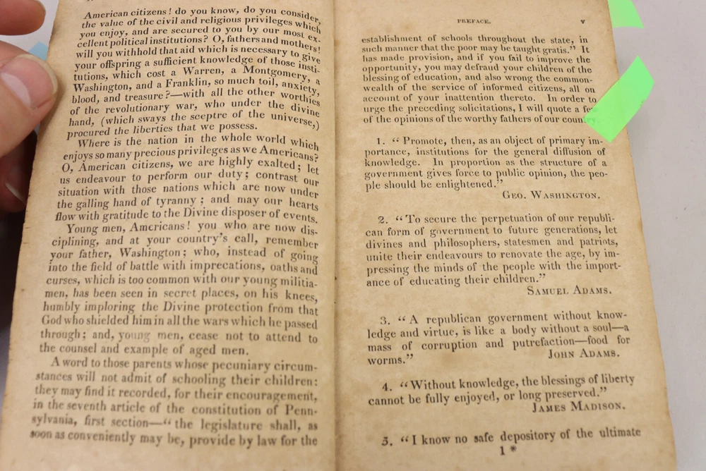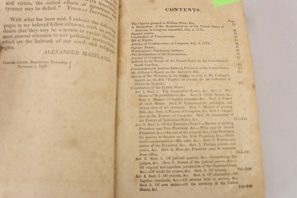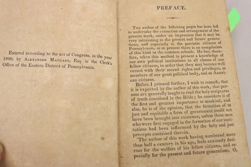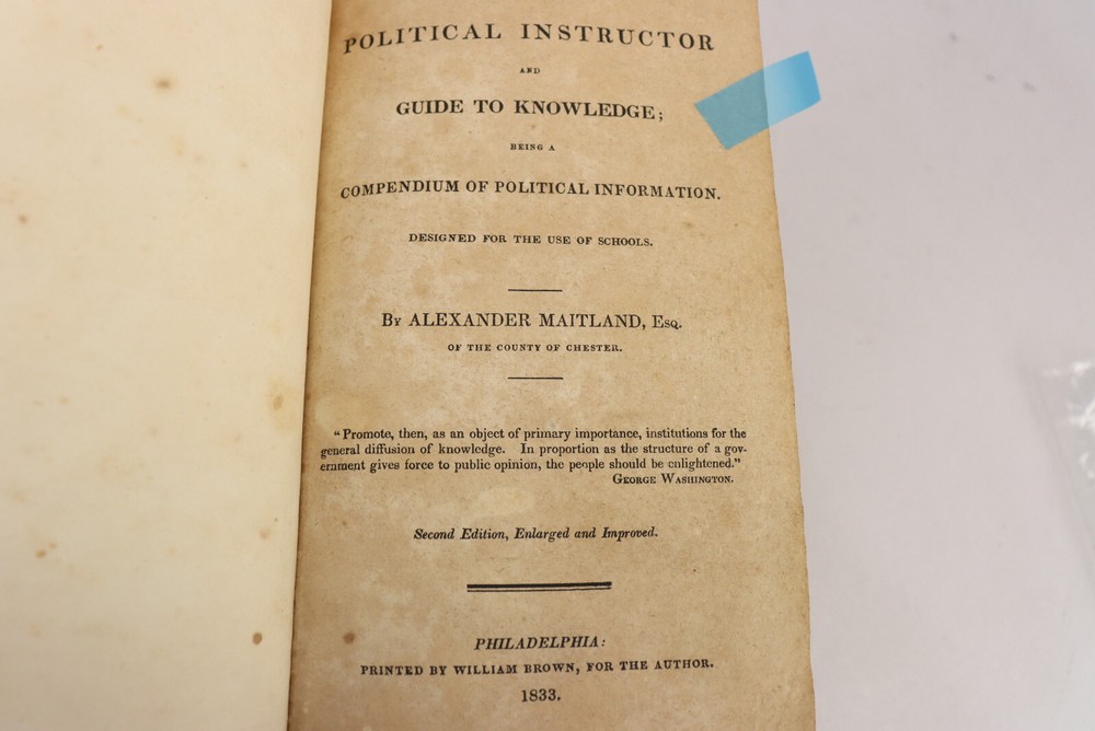 This is an antique original leatherbound copy of the second edition of Political Instructor by Alexander Maitland, printed by William Brown of Philadelphia in 1833 -- 191 years ago! The book's overall condition is very nice for its age. The pages are free of writing and tears/rips, and the binding seems intact. Some staining is apparent, and there are heavy signs of wear at the spine-ends. Please see our photos for more details, and feel free to ask any questions you may have before making your purchase.