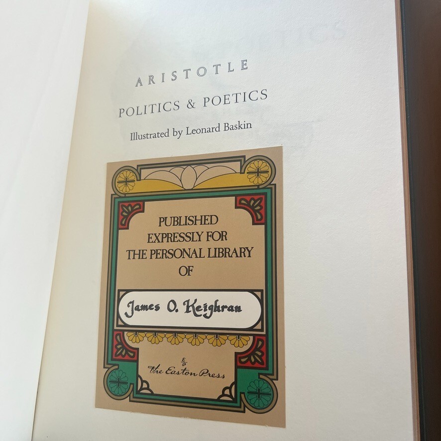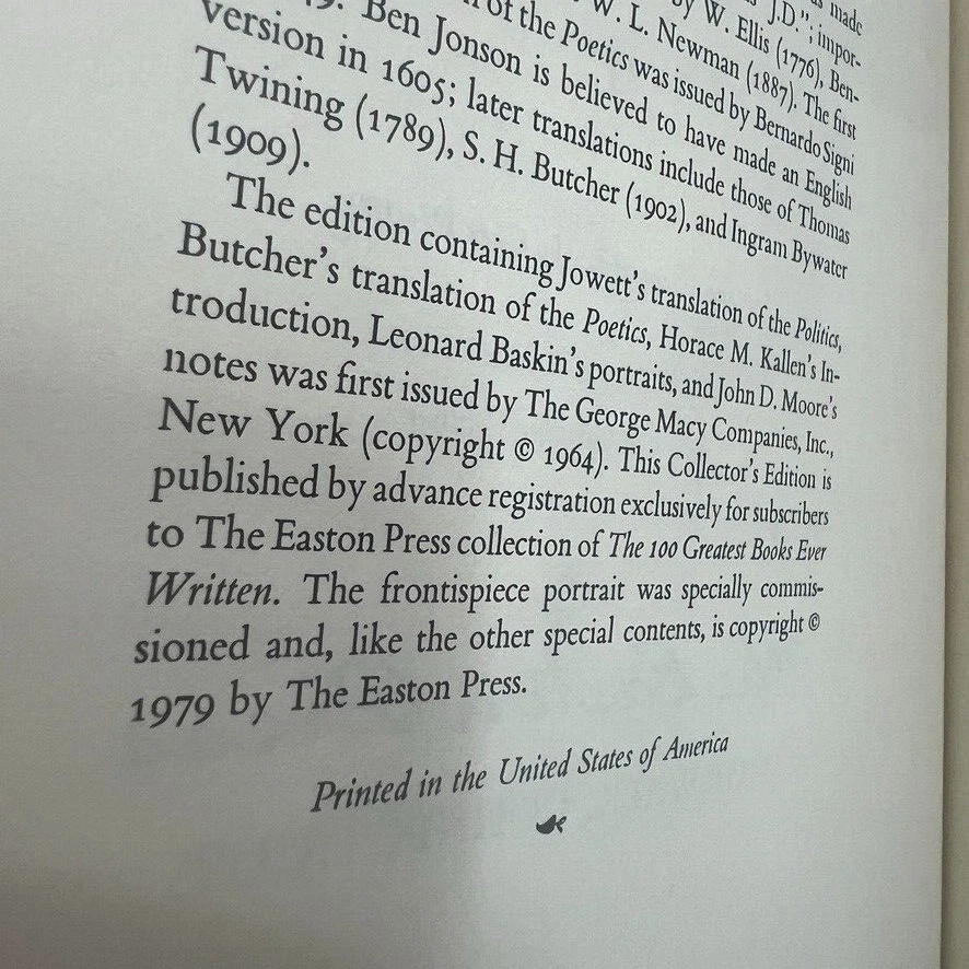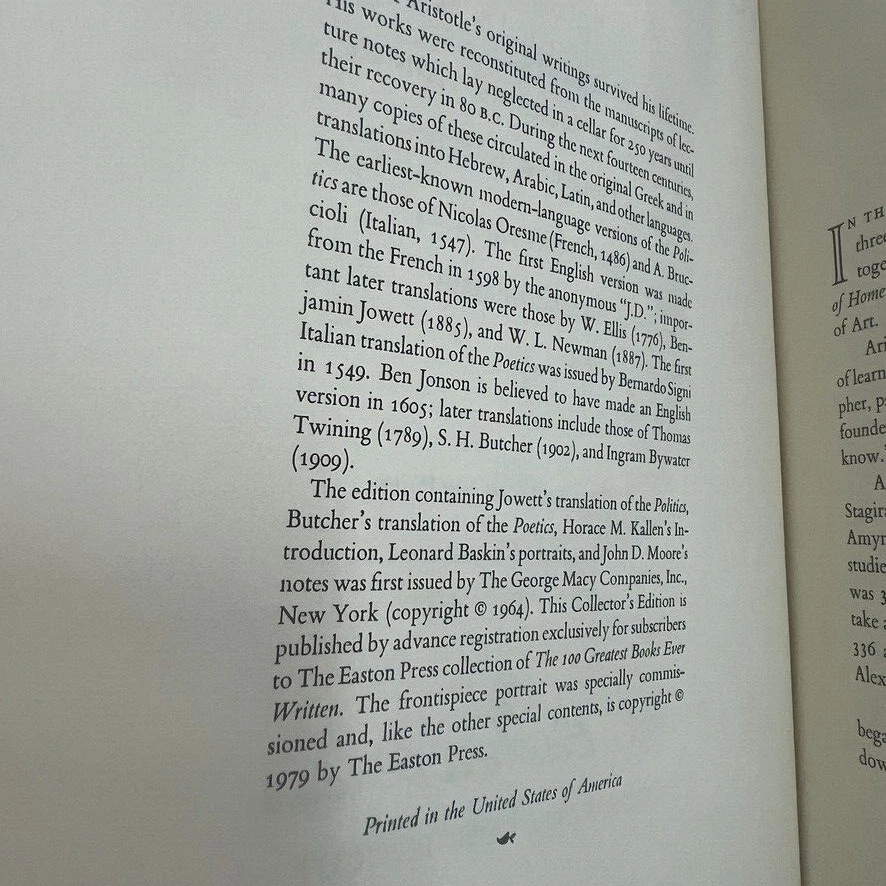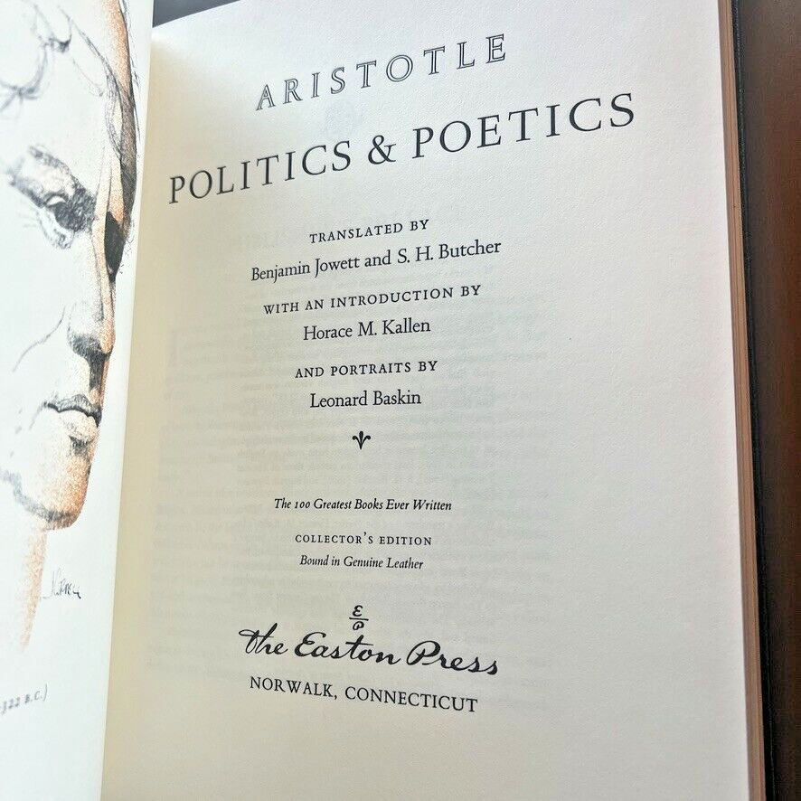 Dive into the timeless wisdom of Aristotle with "Politics and Poetics," a part of The 100 Greatest Books Ever Written series by Easton Press. This exquisite leather-bound collector's edition, published in 1979, offers an elegant interface between classical thought and modern-day political discourse. It is a must-have for enthusiasts of biography and autobiography, as well as those intrigued by the intersection of politics and art. Crafted with care in Norwalk, Connecticut, this illustrated volume is a testament to the enduring legacy of Aristotle's work. Encased in a sophisticated leather cover, it stands as a proud addition to any collection, unmarked by signatures or personalization. Explore the intricacies of political theory through the lens of one of history's most influential philosophers.