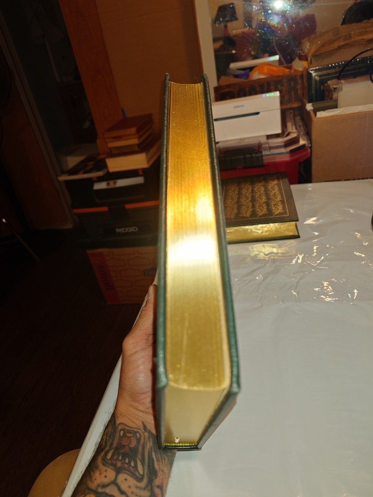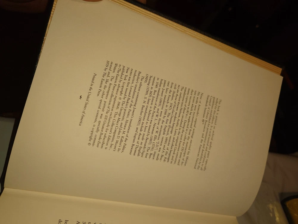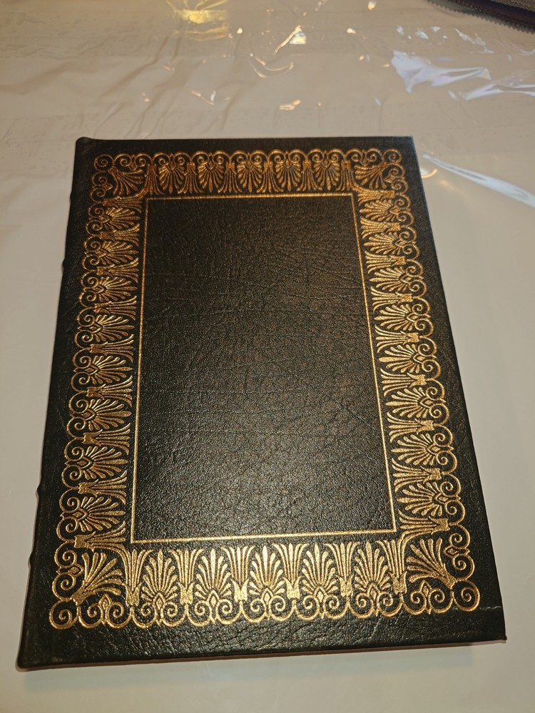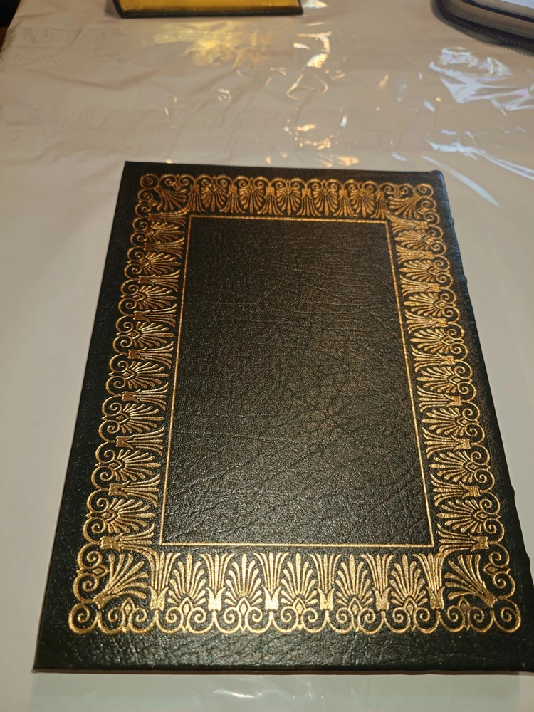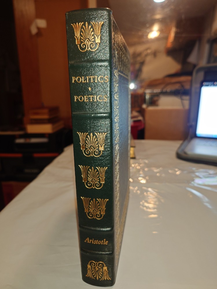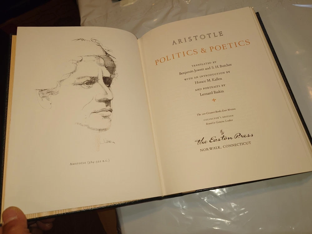 Does have some slight foxing on gilded edges and a small imperfection on the second page of the front end papers. The product is a limited edition hardcover book titled "Politics and Poetics" by Aristotle, published by Easton Press in 1979. It is a collector's edition with a leather-bound cover and comes from the "The 100 Greatest Books Ever Written" series. This original edition is illustrated and written in English, making it a valuable addition to any collection focusing on political philosophy. Ideal for those interested in the works of Aristotle and the history of political thought.