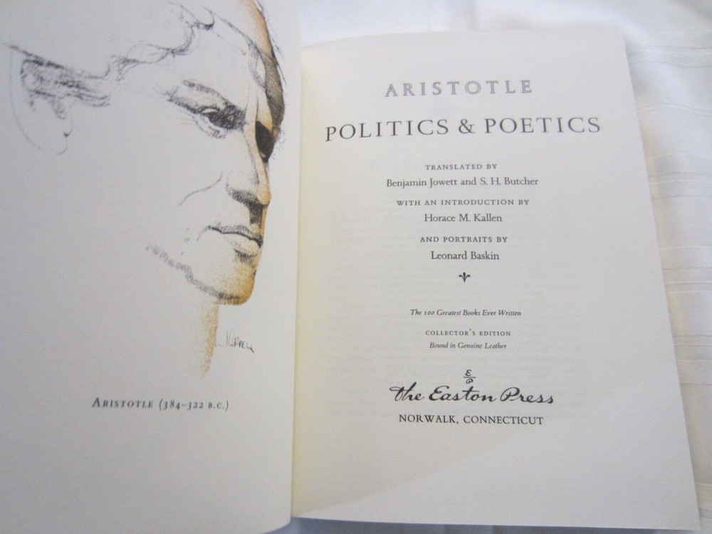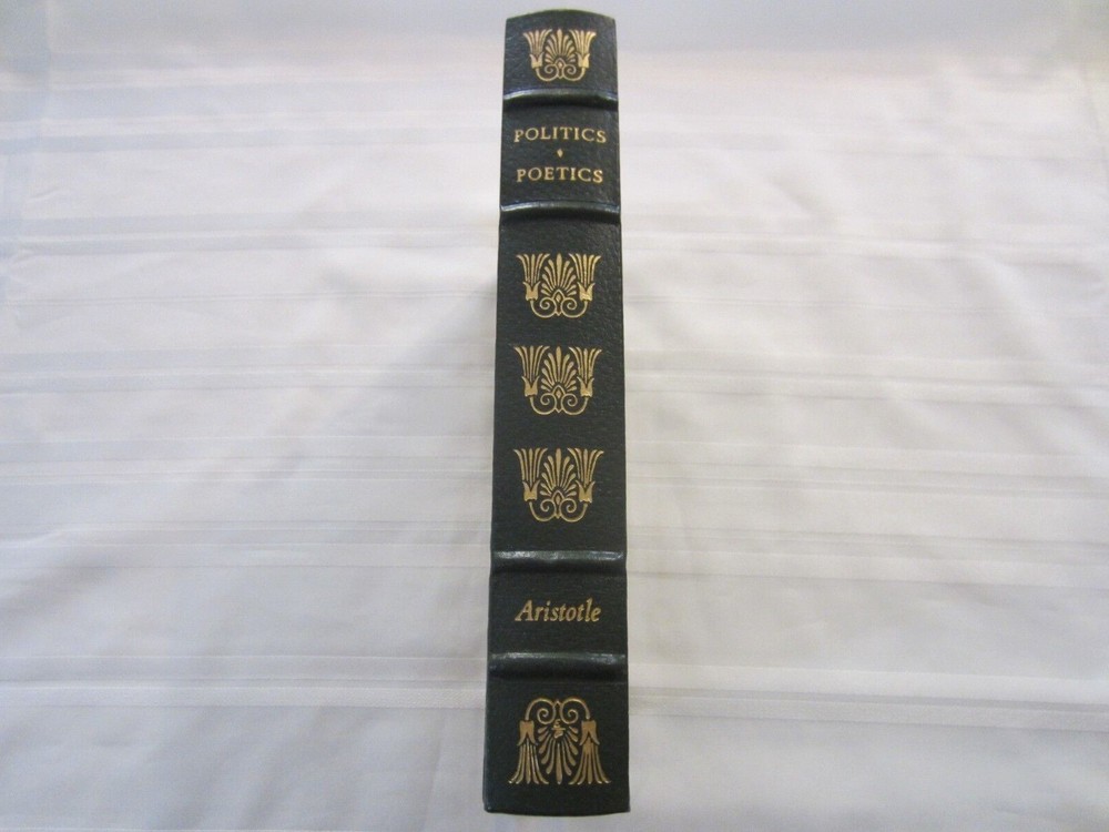 Politics and Poetics by Aristotle Easton Press. Great condition overall. Tight binding with crisp and clean pages. The gilt on the covers is in good condition. The gilt on the outer text block has some slight wear, including a small dent (see last photo). Please view the photos carefully, and be sure to check out my other Easton Pres listings.