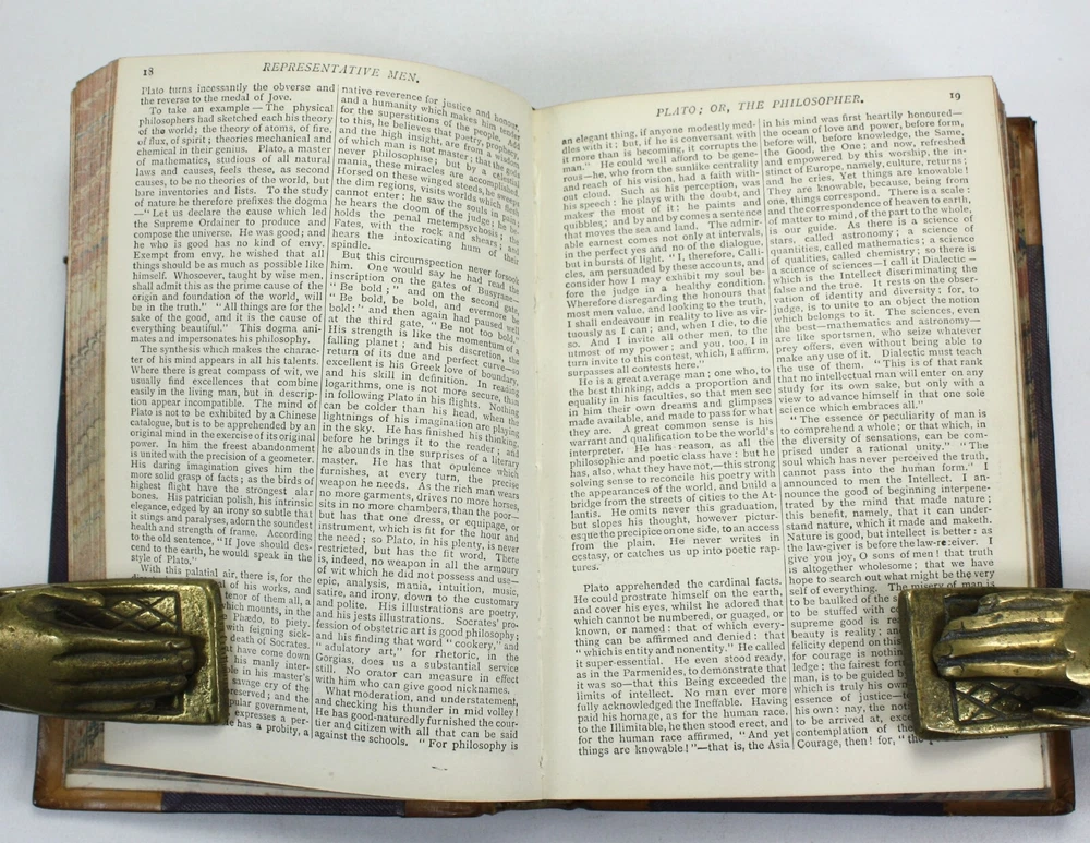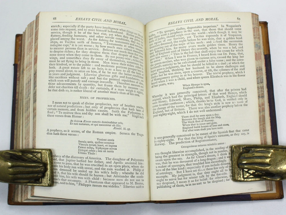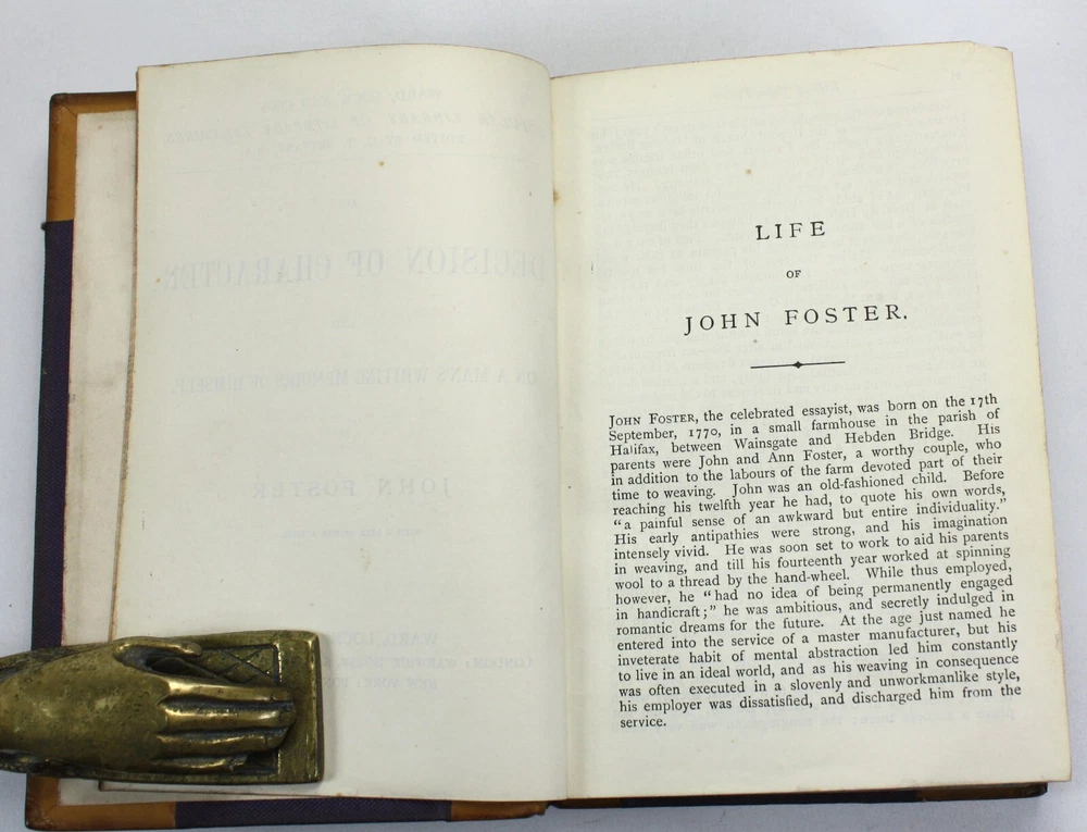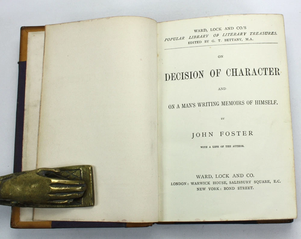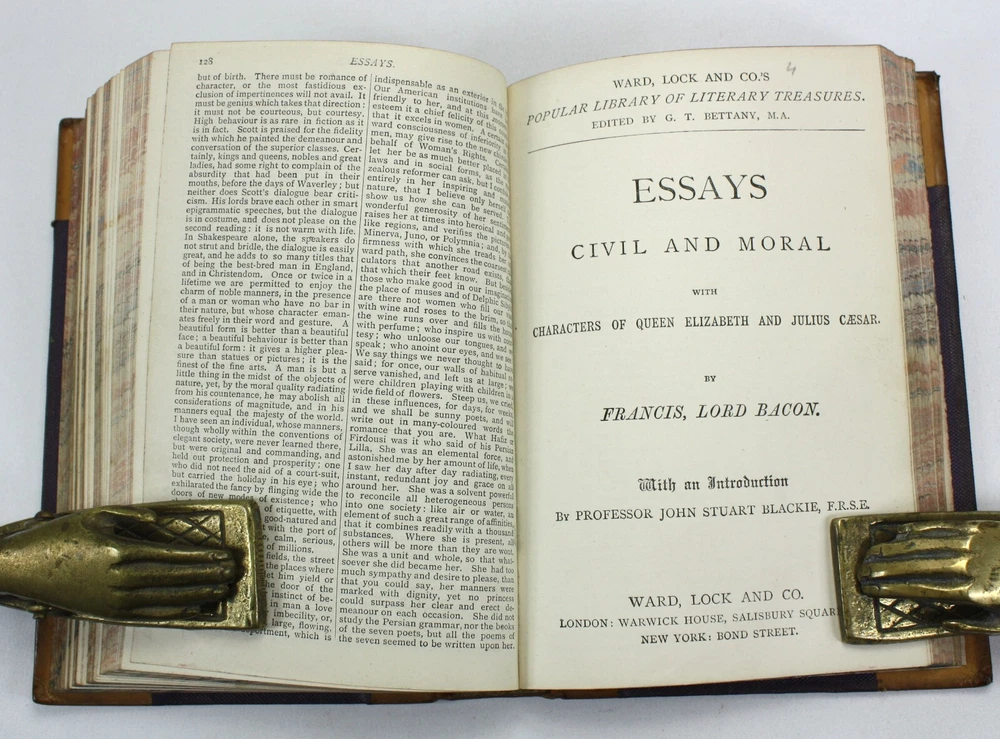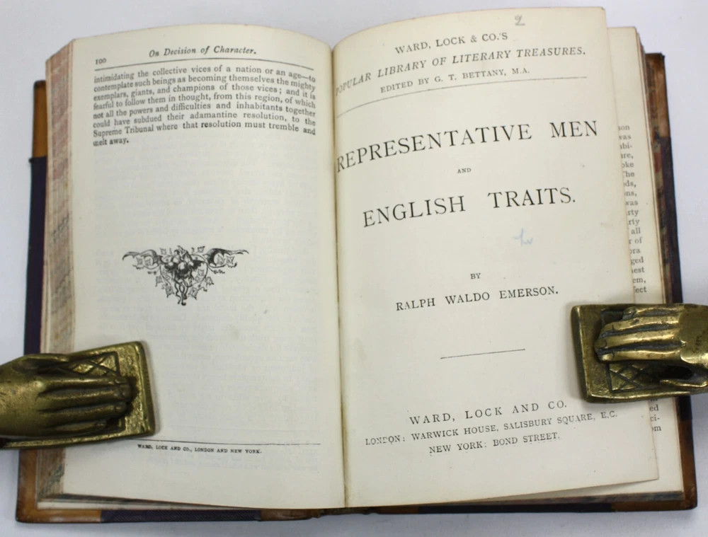 Ward, Lock and Co.'s Popular Library of Literary Treasures. Edited by G.T. Bettany, M.A.; 4 volumes bound as one; On Decision of Character and On A Man's Writing Memoirs of Himself, by John Foster, With a Life of the Author; Representative Men and English Traits, by Ralph Waldo Emerson; Essays on Love, Friendship, Heroism, Character, &c., by Ralph Waldo Emerson; Essays Civil and Moral, with Characters of Queen Elizabeth and Julius Caesar, by Francis, Lord Bacon. With an Introduction by Professor John Stuart Blackie, F.R.S.E. Published by Ward, Lock and Co., London. Undated, but c. 1886 (based on Worldcat listings). A good hardback with tan lather spine and corners. Raised bands and black and burgundy morocco labels to spine with gilt titles and decals. Brown cloth over boards. Some bumping and wear with some stains to cloth. Front endpaper cracked at inner hinge, but still soundly bound. Previous owner's signature to blank free endpaper. Marbled edges to text block, with dust toned top edge. The text is clean and bright throughout. Text in English. xv + 100pp + 128pp + iv + 128pp + ix + 10-126pp. Dimensions: approx 176mm high x 126mm wide x 32mm deep. Weight: approximately 507g (unpacked). Ward, Lock and Co.'s Popular Library of Literary Treasures. Edited by G.T. Bettany, M.A.; On Decision of Character and On A Man's Writing Memoirs of Himself, by John Foster, With a Life of the Author; Essays Civil and Moral, with Characters of Queen Elizabeth and Julius Caesar, by Francis, Lord Bacon. With an Introduction by Professor John Stuart Blackie, F.R.S.E. Published by Ward, Lock and Co., London. Undated, but c. 1886 (based on Worldcat listings). A good hardback with tan lather spine and corners. Raised bands and black and burgundy morocco labels to spine with gilt titles and decals. Brown cloth over boards. Some bumping and wear with some stains to cloth. Front endpaper cracked at inner hinge, but still soundly bound. Previous owner's signature to blank free endpaper. Marbled edge