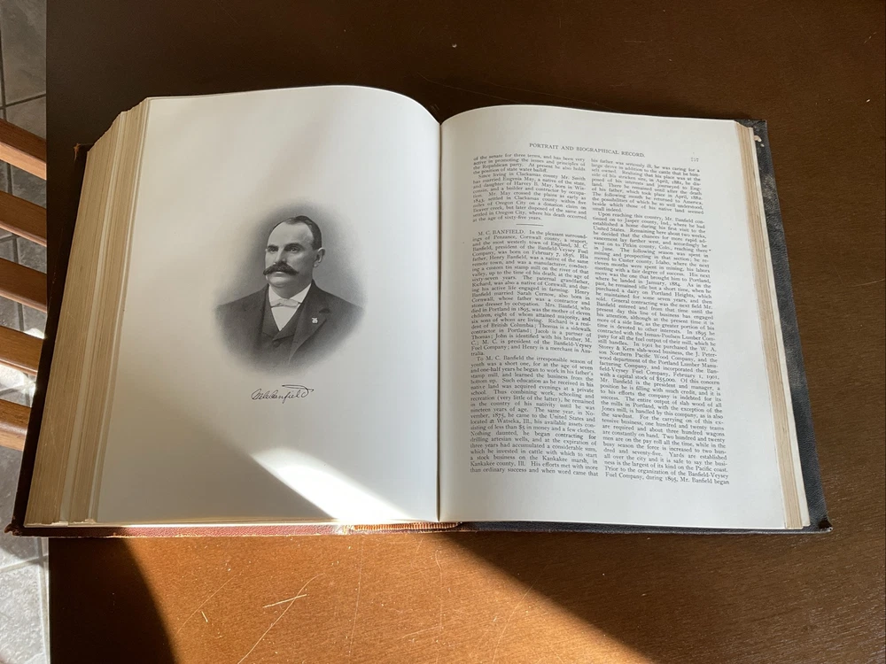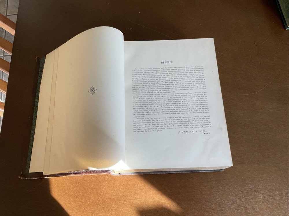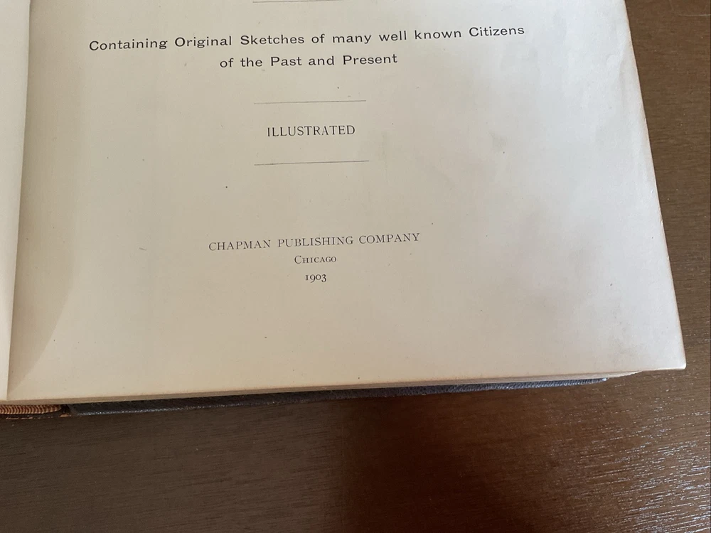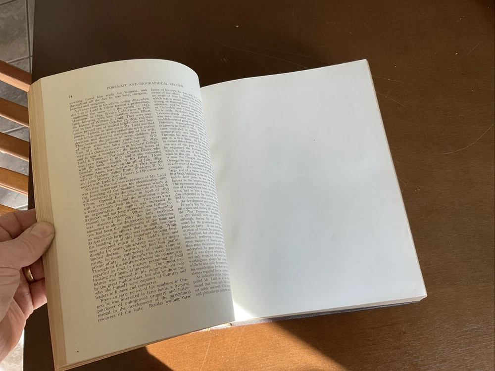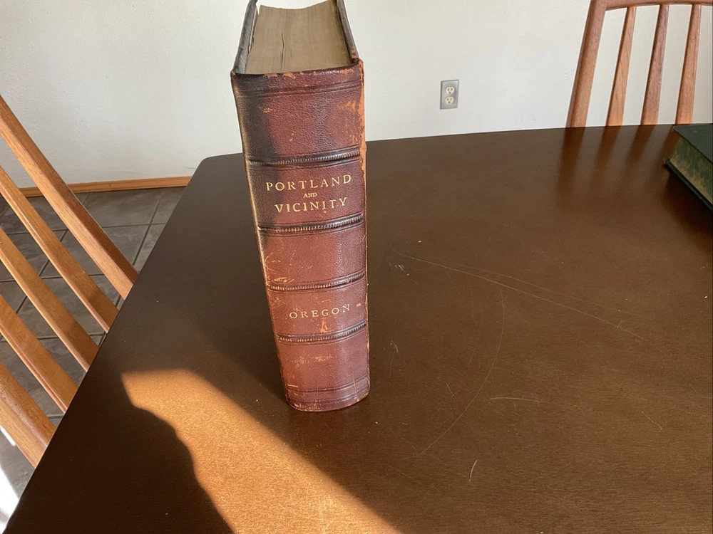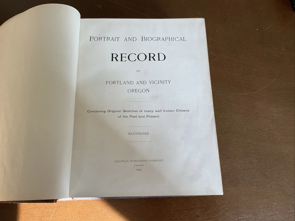 Portrait and Biographical Record of Portland and Vicinity Oregon, 1903, Chapman Publishing, Leather. I would estimate there are 250+ photos of persons in this 883 page Book. About 1 every 3 pages. Not everyone covered in this book has a photo. There is a index at the back of the Book. This Book is in Good condition. The binding is in great shape. All 883 pages are present and are in Good condition with no obvious stains, tears or folds. There are no markings in this Book other than a price on one of the cover pages. Leather cover shows some scuffing as expected. Please see the photos for more description.