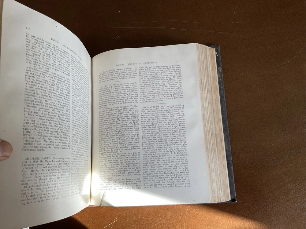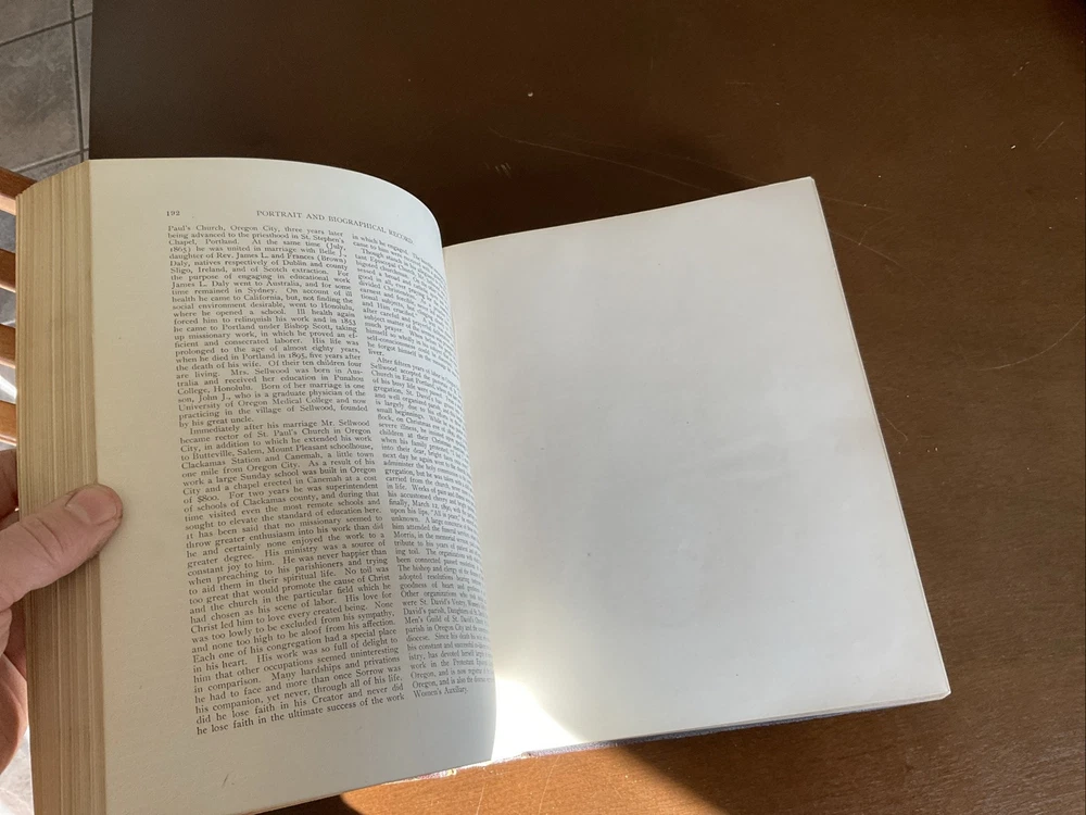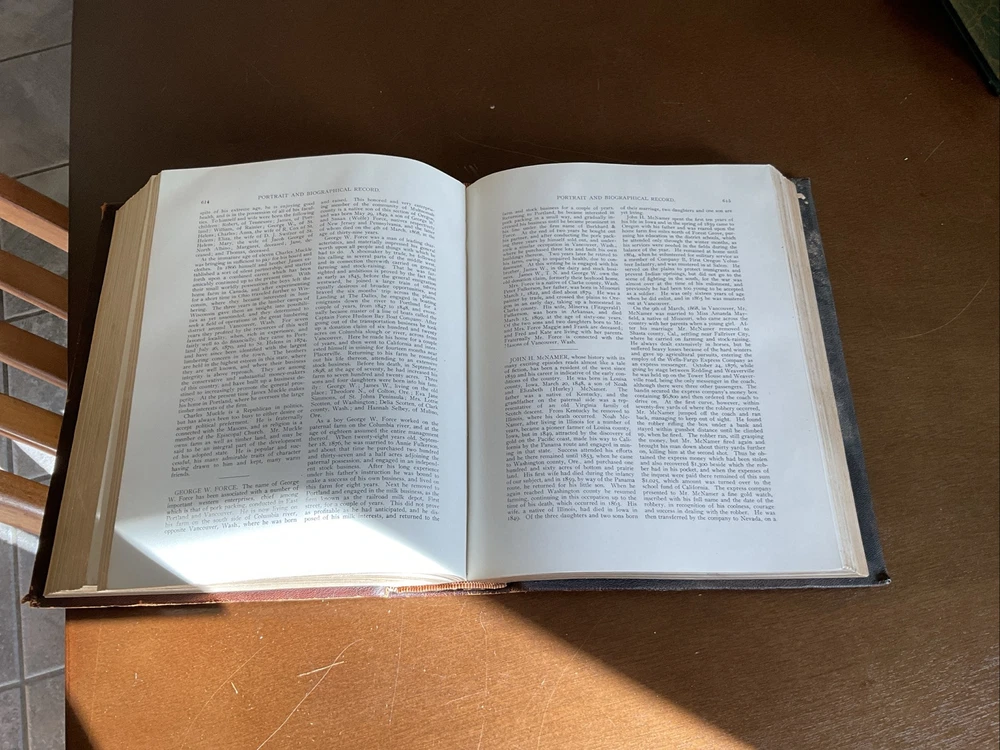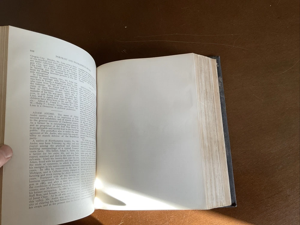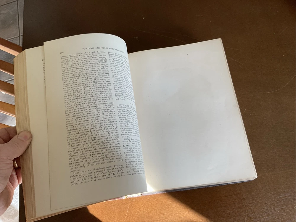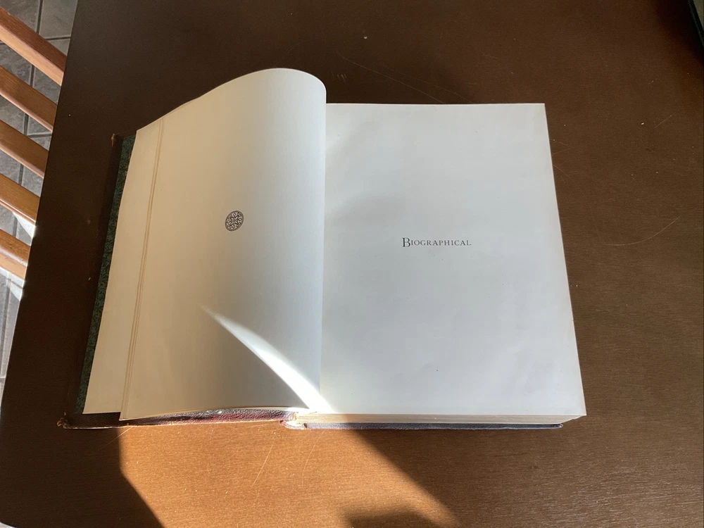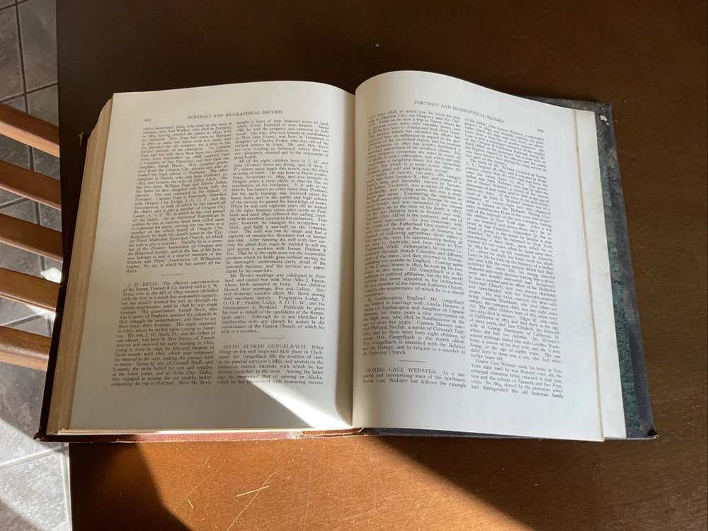 Portrait and Biographical Record of Portland and Vicinity Oregon, 1903, Chapman Publishing, Leather. I would estimate there are 250+ photos of persons in this 883 page Book. About 1 every 3 pages. Not everyone covered in this book has a photo. There is a index at the back of the Book. This Book is in Good condition. The binding is in great shape. All 883 pages are present and are in Good condition with no obvious stains, tears or folds. There are no markings in this Book other than a price on one of the cover pages. Leather cover shows some scuffing as expected. Please see the photos for more description.